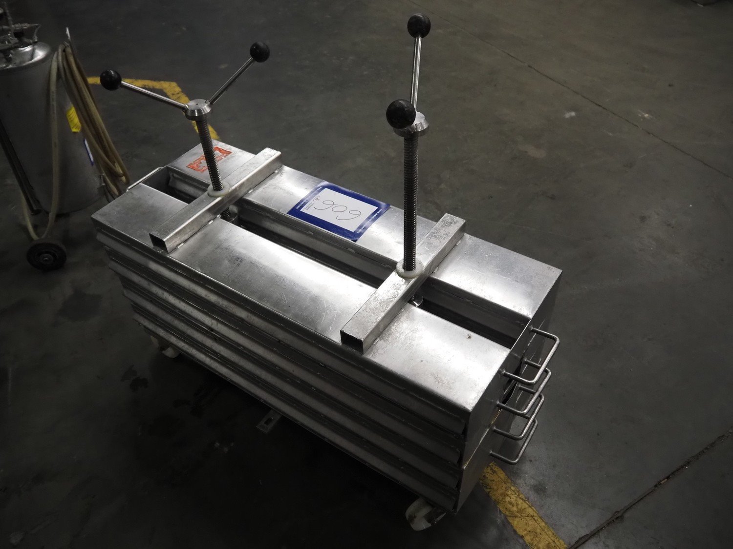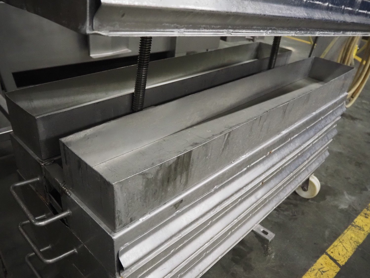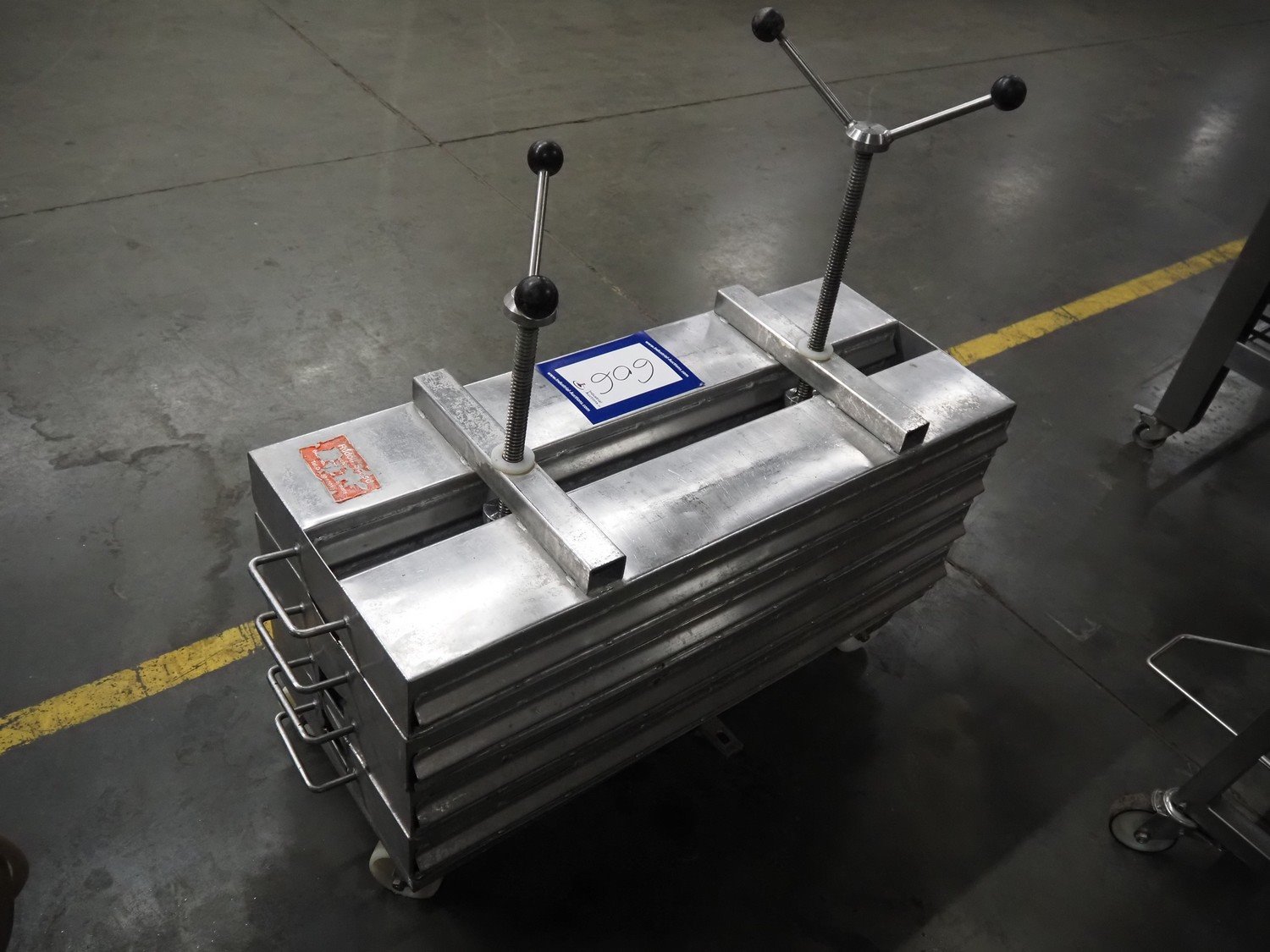 Rudolph Schad mobile ham press, 8 forms, dimensions forms: (8x) 1000 mm x 150 mm x 90 mm, total dimensions: 1150 mm x 410 mm x 900 mm.