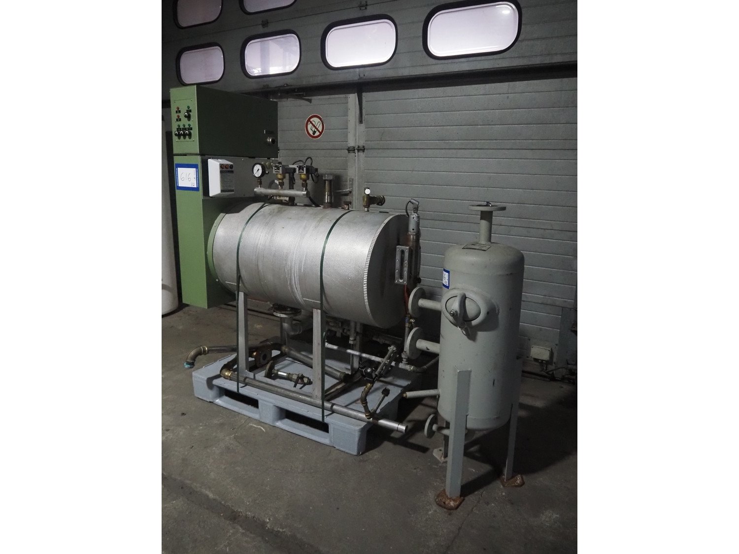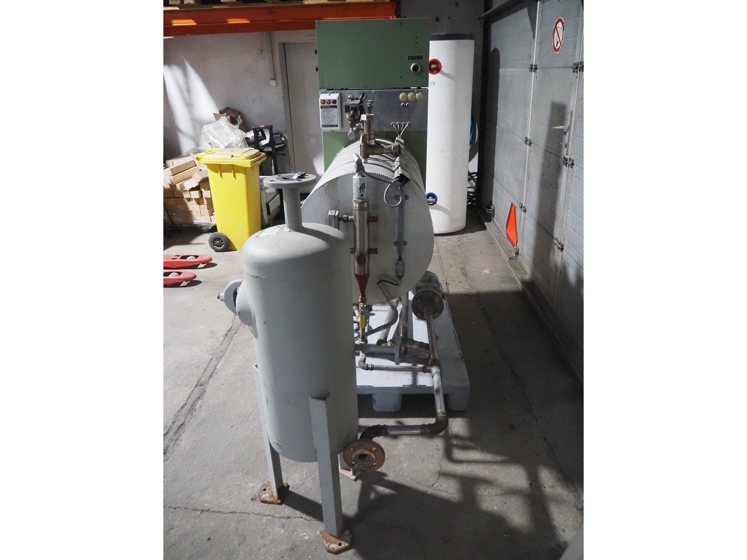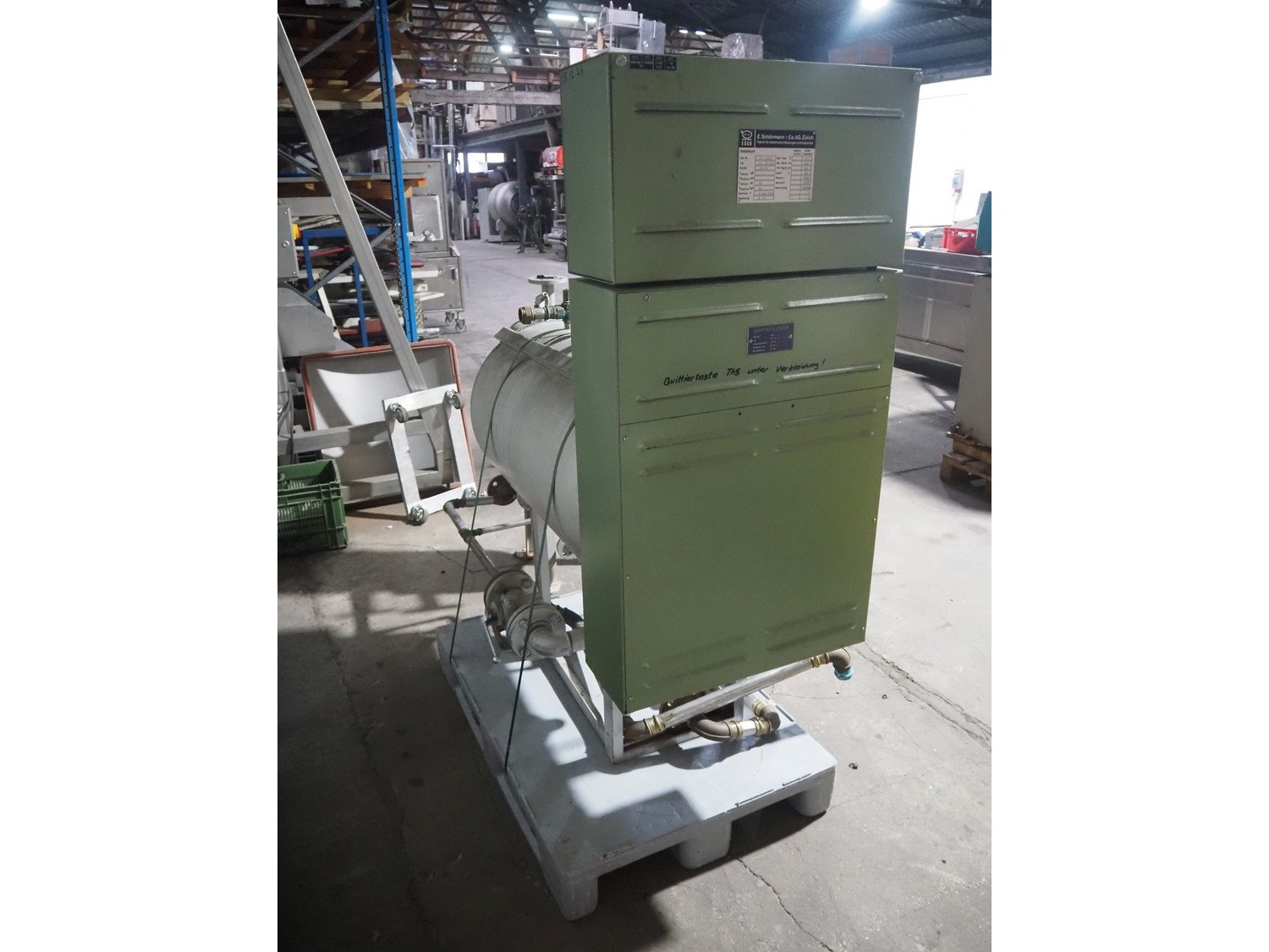 E. Schönmann + Co.AG. steam generator, type: DE 73-40 B, number: 83-3982, year of construction: 06-1985, 380/220 V, 3 Ph, 40 kW, volume: 60 liter, medium: H20 dimensions: 1860 mm x 650 mm x 1650 mm. Including Xmet AG steel pressure vessel, number: S 0461, year of construction: 12/2001, volume: 50 liter, working pressure: 4.0 bar, dimensions: 580 mm x 480 mm x 1250 mm.