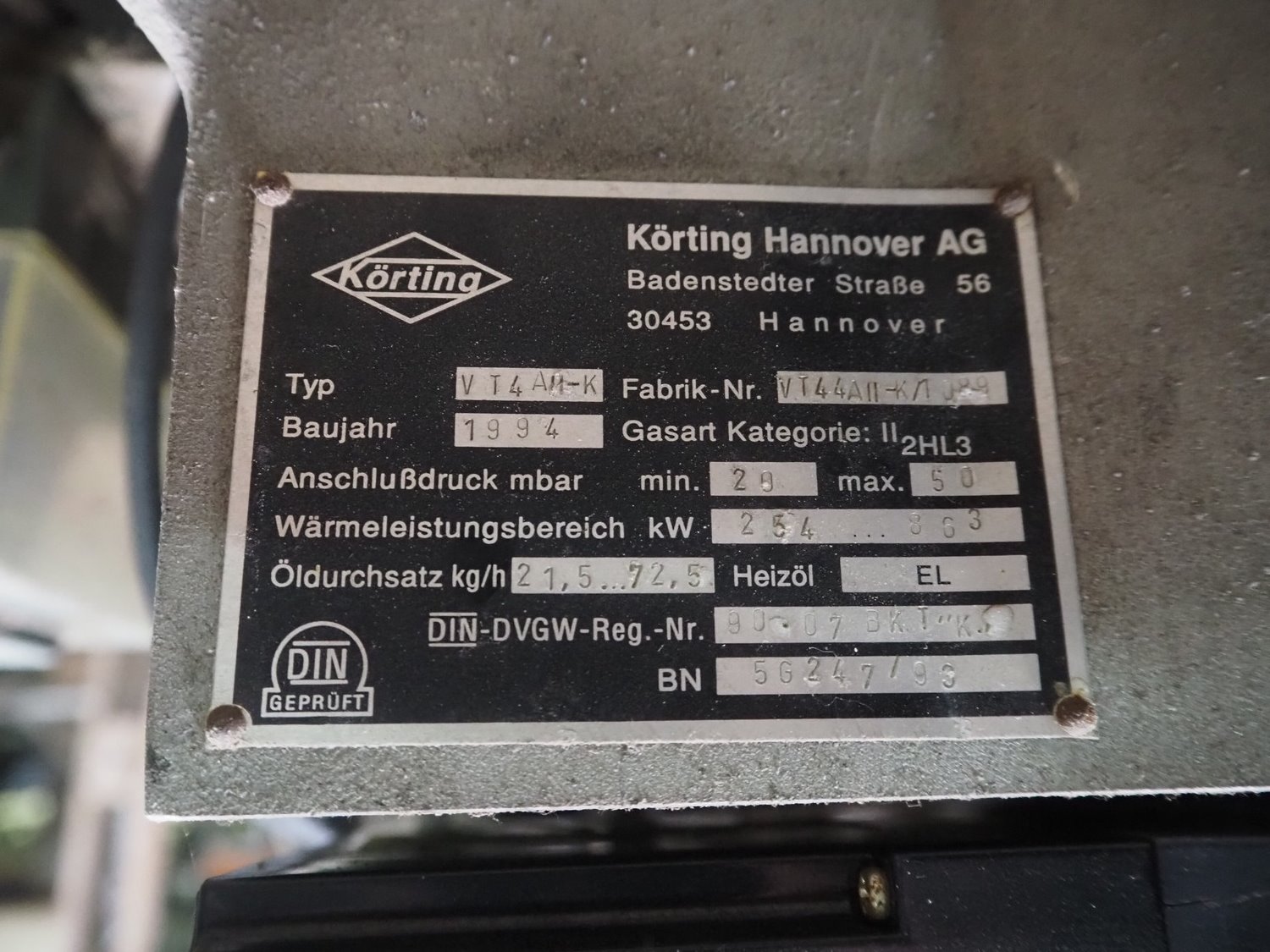 Körting burner, type: VT4 all-K, factory number: VT44 all-K / 1089, year of construction: 1994, 380-220 V, 50 Hz, 16 A, 1.5 kW, dimensions: 760 mm x 640 mm x 920 mm.