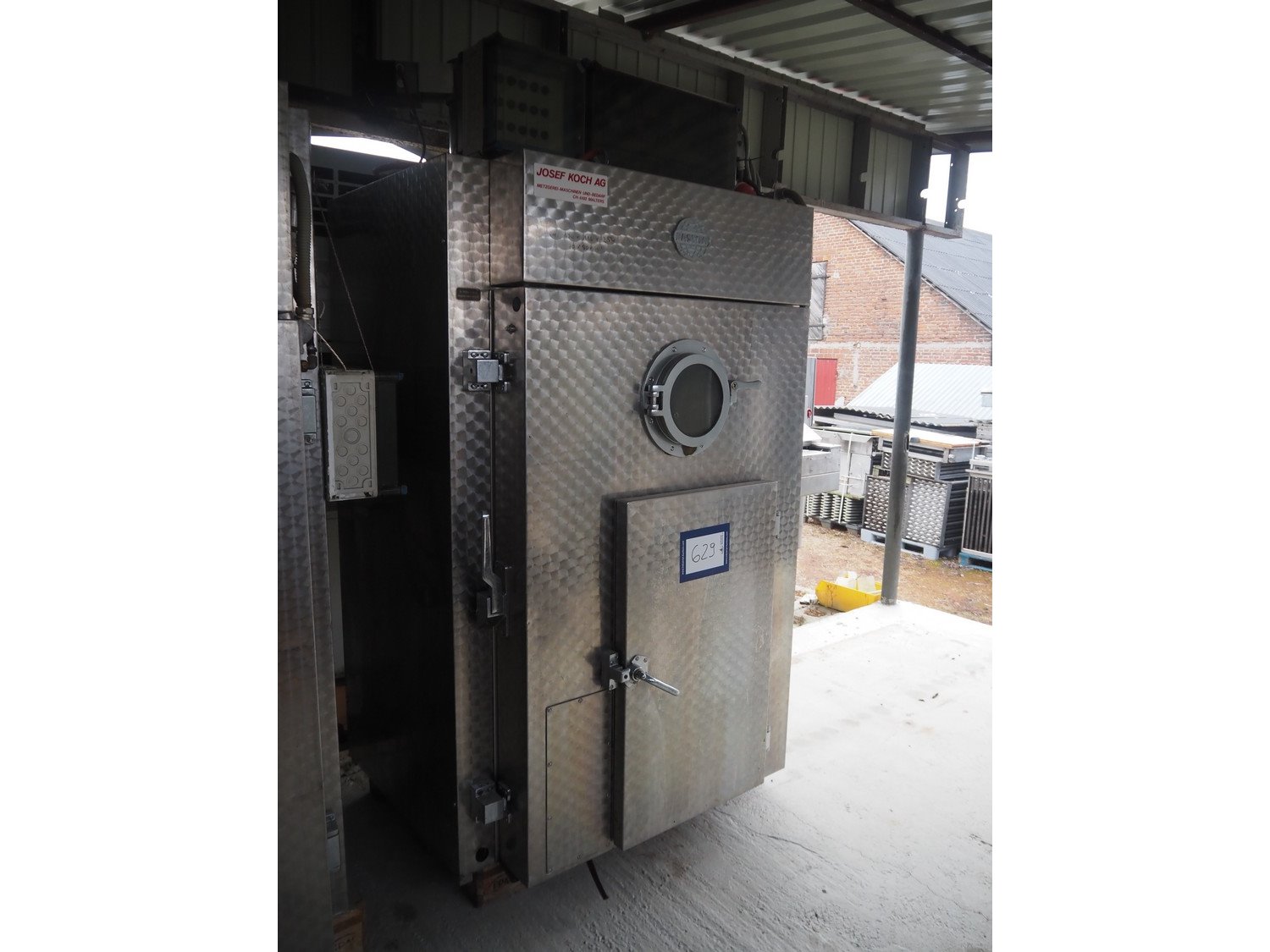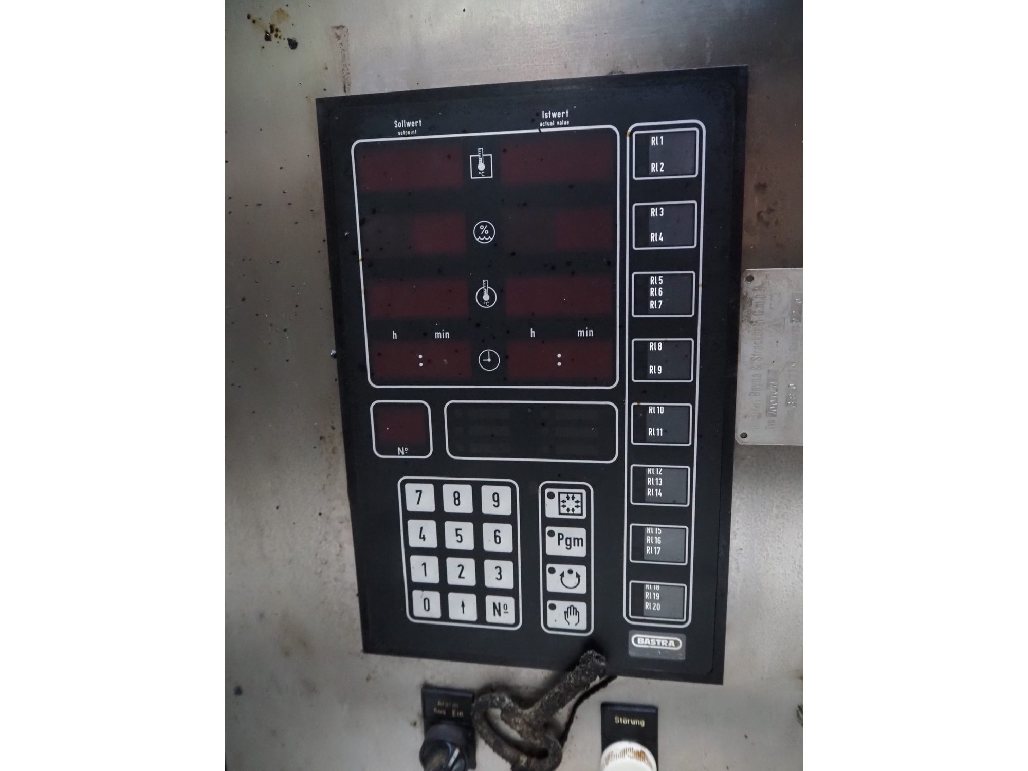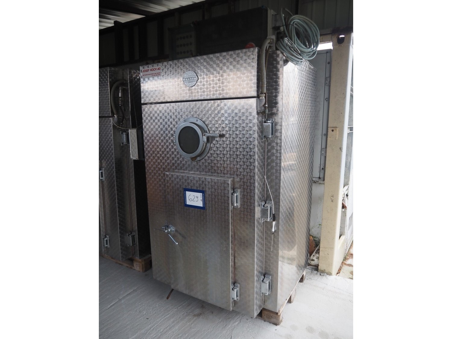 Bastra smoking chamber with wood chip smoke generator, type: 1001CTF, number: 5648, year of construction: 1-1991, 380 V, 3 Ph, 50 Hz, 19.05 kW, inside dimensions: 950 mm x 700 mm x 1430 mm, total dimensions: 1270 mm x 1130 mm x 1920 mm.
