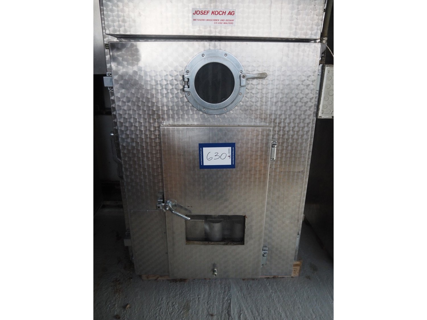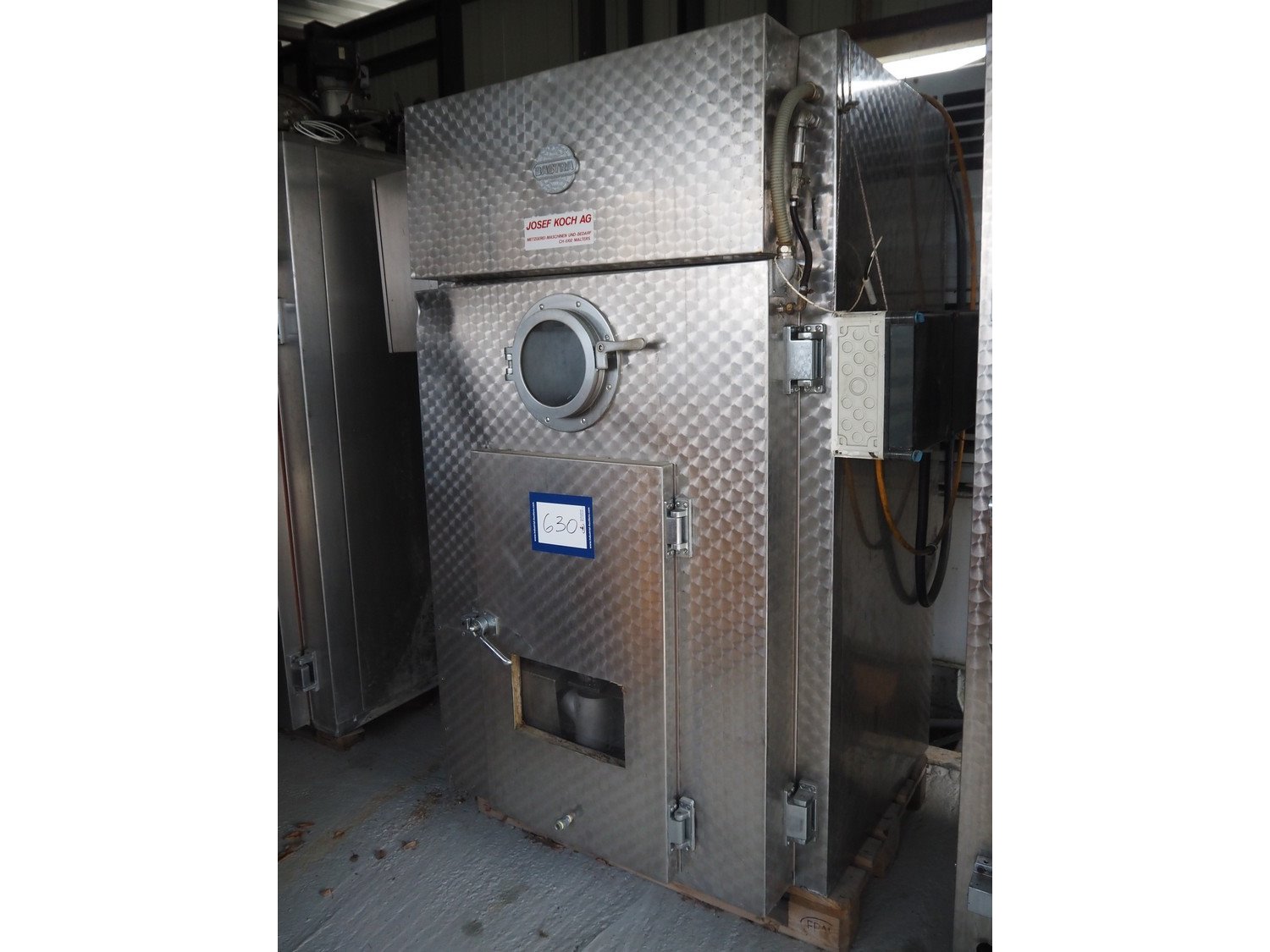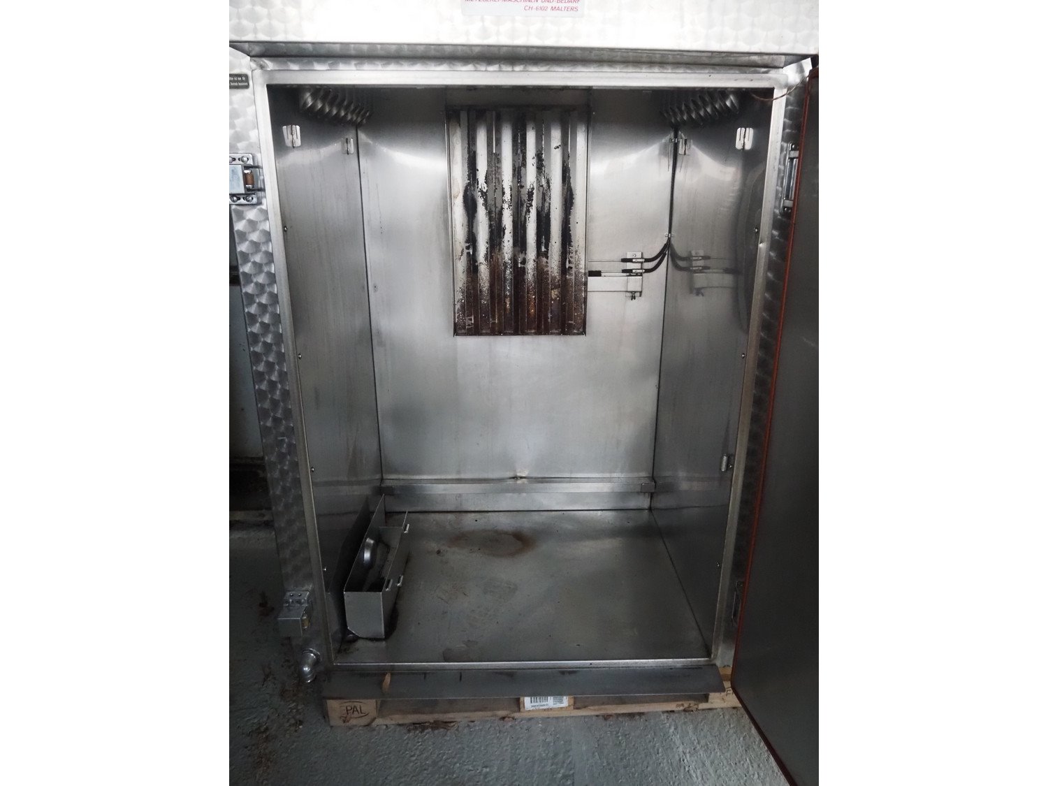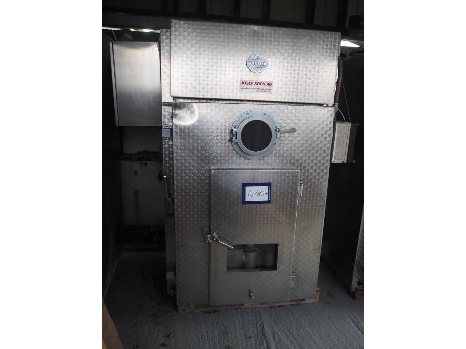 Bastra smoking chamber with wood chip smoke generator, model: Bastramat B 951, inside dimensions: 950 mm x 700 mm x 1430 mm, total dimensions: 1270 mm x 1130 mm x 1920 mm.