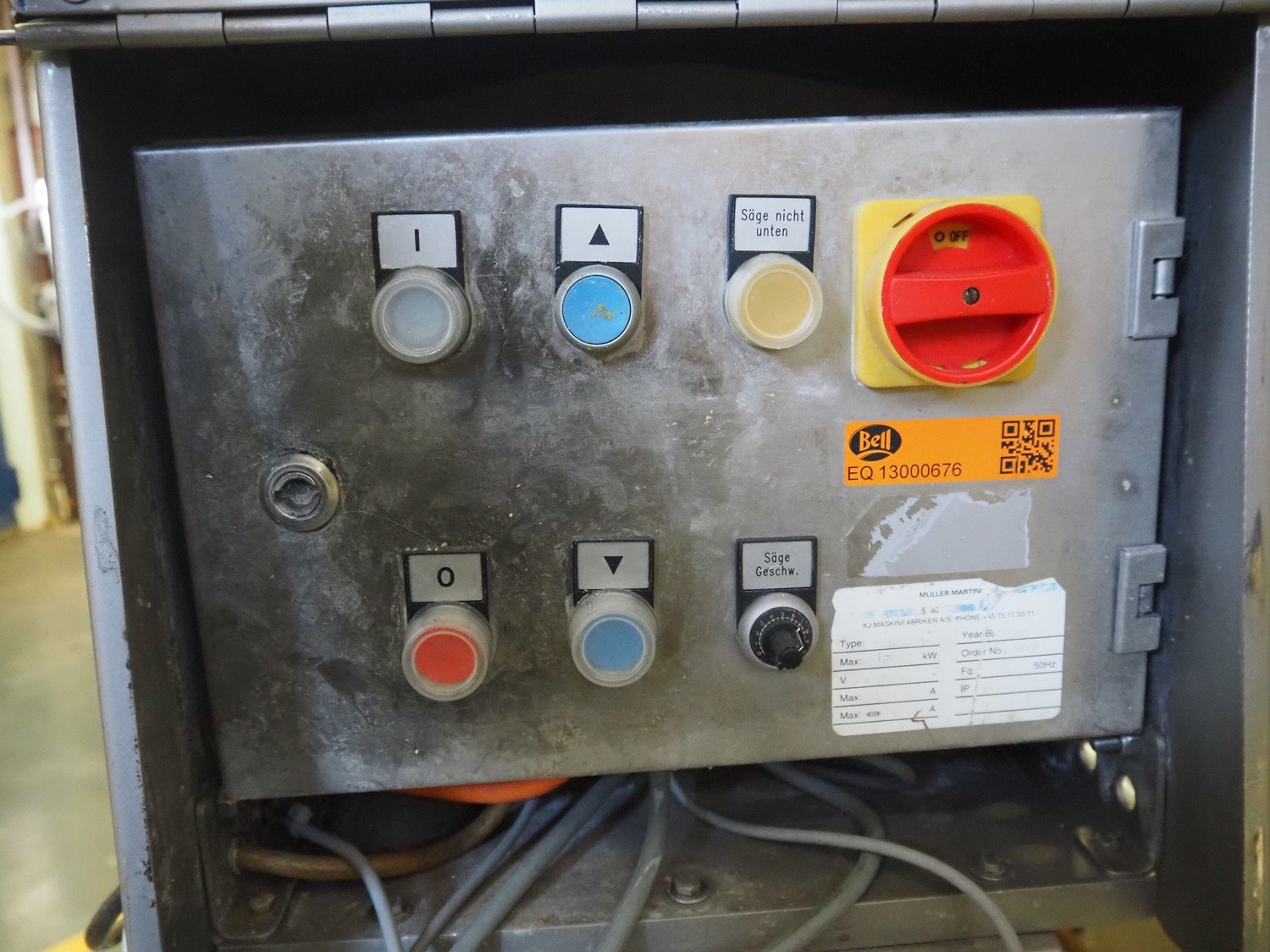 KJ Maskinfabriken A/S circular saw, type: MS12-2301, number: 20009, year of construction: 1992, 380/220 V, 3 Ph, 50 Hz, 6.0 A, saw diameter: 600 mm, total dimensions: 1550 mm x 750 mm x 1560 mm. Saw not included.