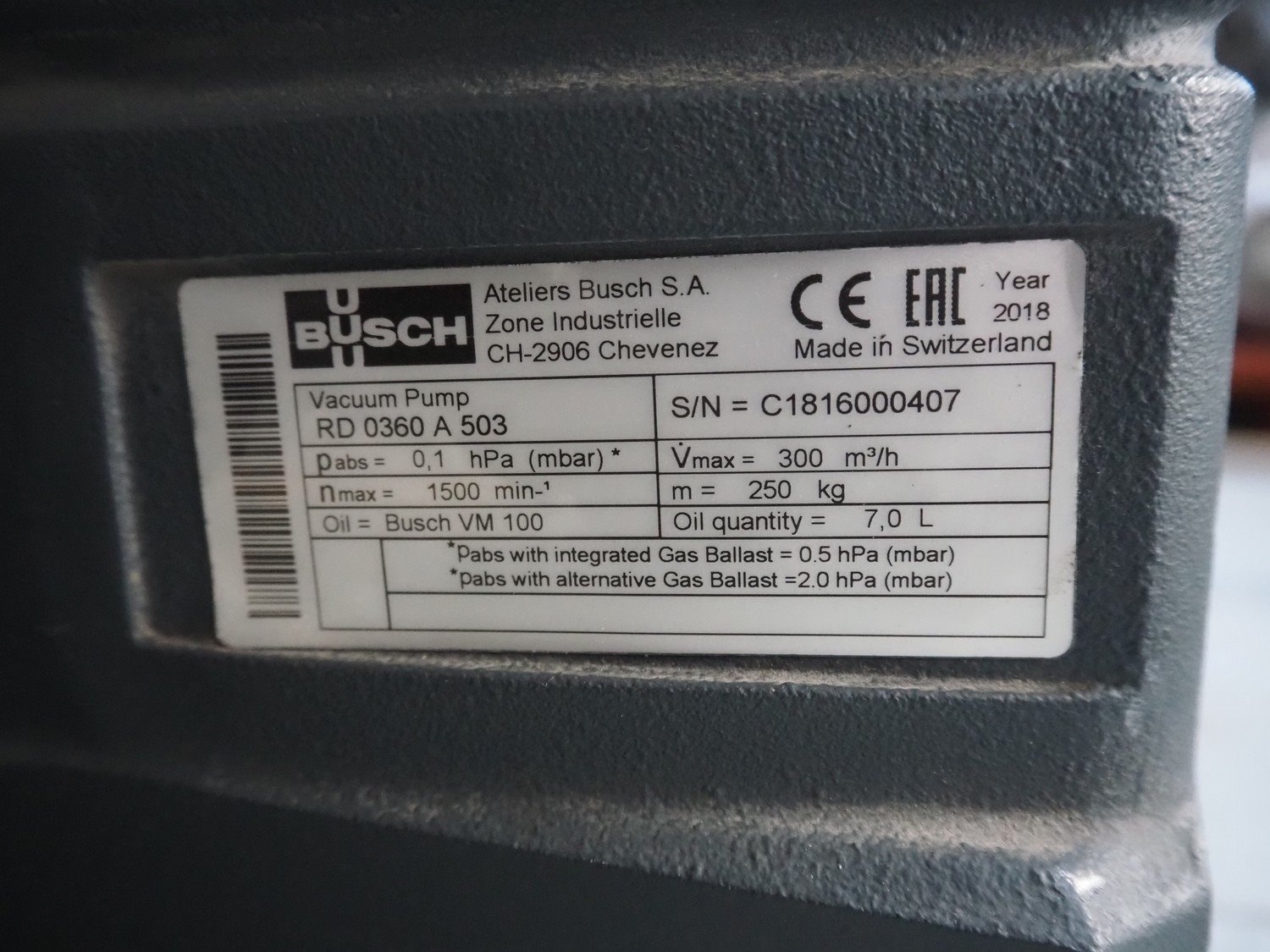 Busch vacuum pump, type: RD 0360 A 503, serial number: C1816000407, capacity: 300 m³/h, weight: 250 kg, dimensions: 1000 mm x 540 mm x 700 mm.