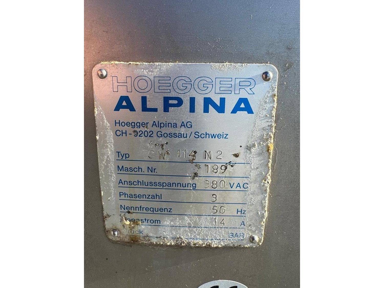 Hoegger Alpina grinder, type: SW 114 N2, machine number: 189, 380 V, 3 Ph, 50 Hz, 14 A, 5,2 kW, diameter plate: 114 mm, total dimensions: 1100 mm x 700 mm x 1200 mm.