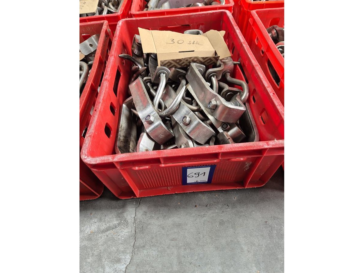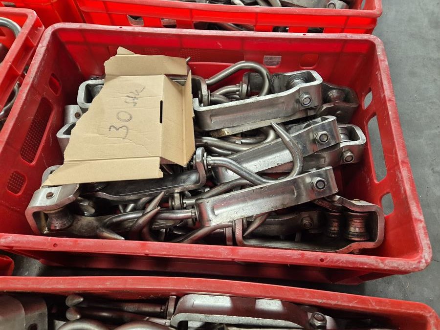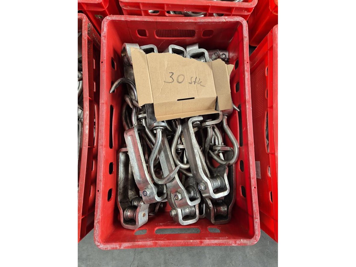 Crate with 30 s/s meat hooks, dimensions hooks: 400 mm x 120 mm, dimensions crate:: 600 mm x 400 mm x 200 mm.
