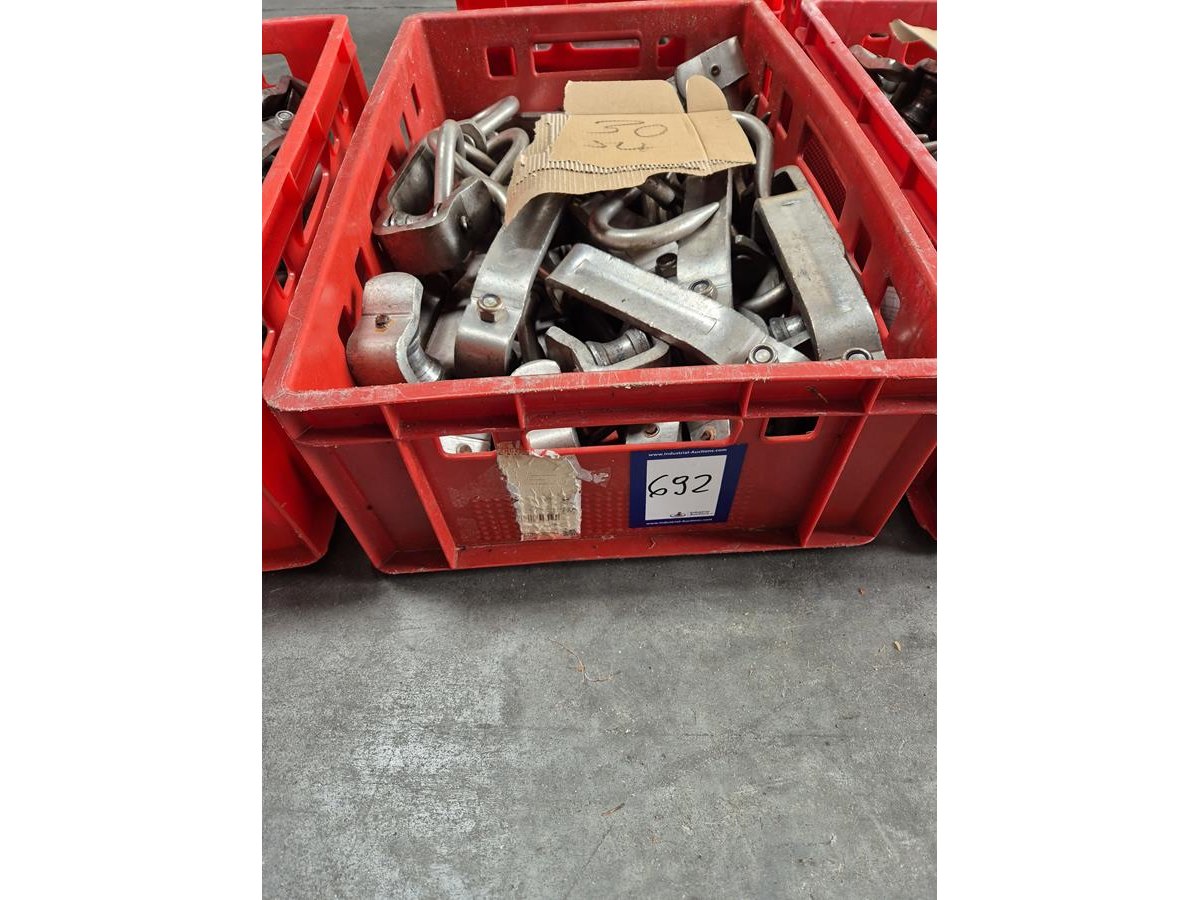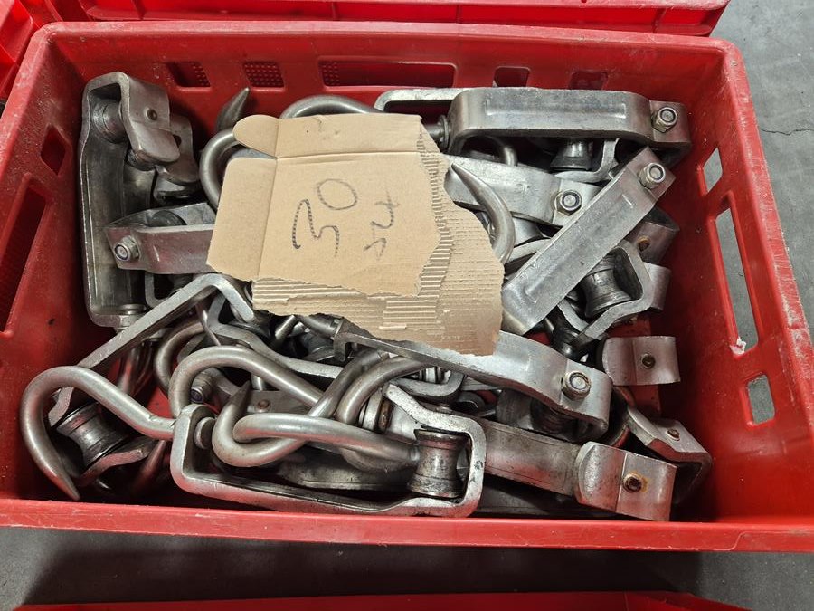 Crate with 30 s/s meat hooks, dimensions hooks: 400 mm x 120 mm, dimensions crate:: 600 mm x 400 mm x 200 mm.