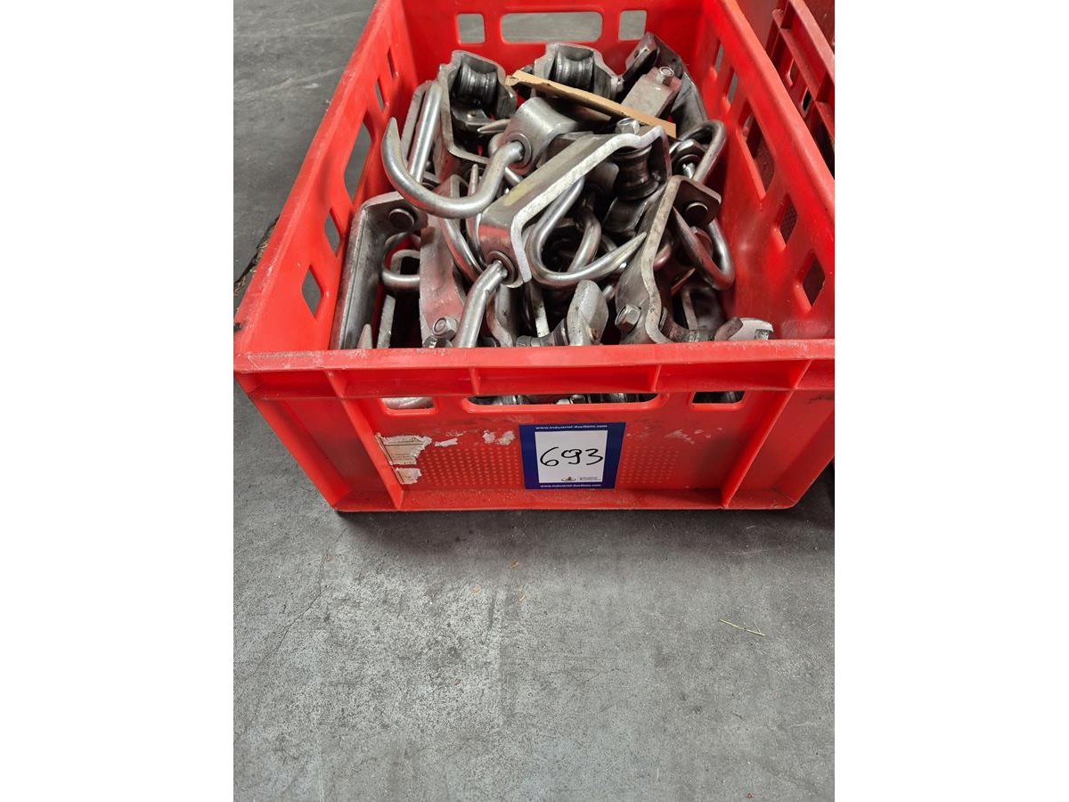 Crate with 28 s/s meat hooks, dimensions hooks: 400 mm x 120 mm, dimensions crate:: 600 mm x 400 mm x 200 mm.