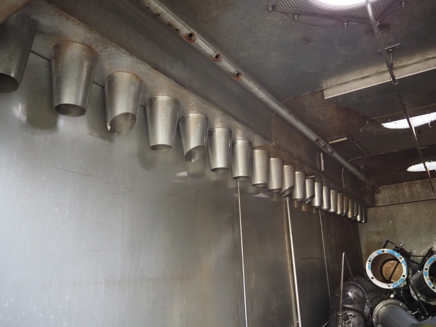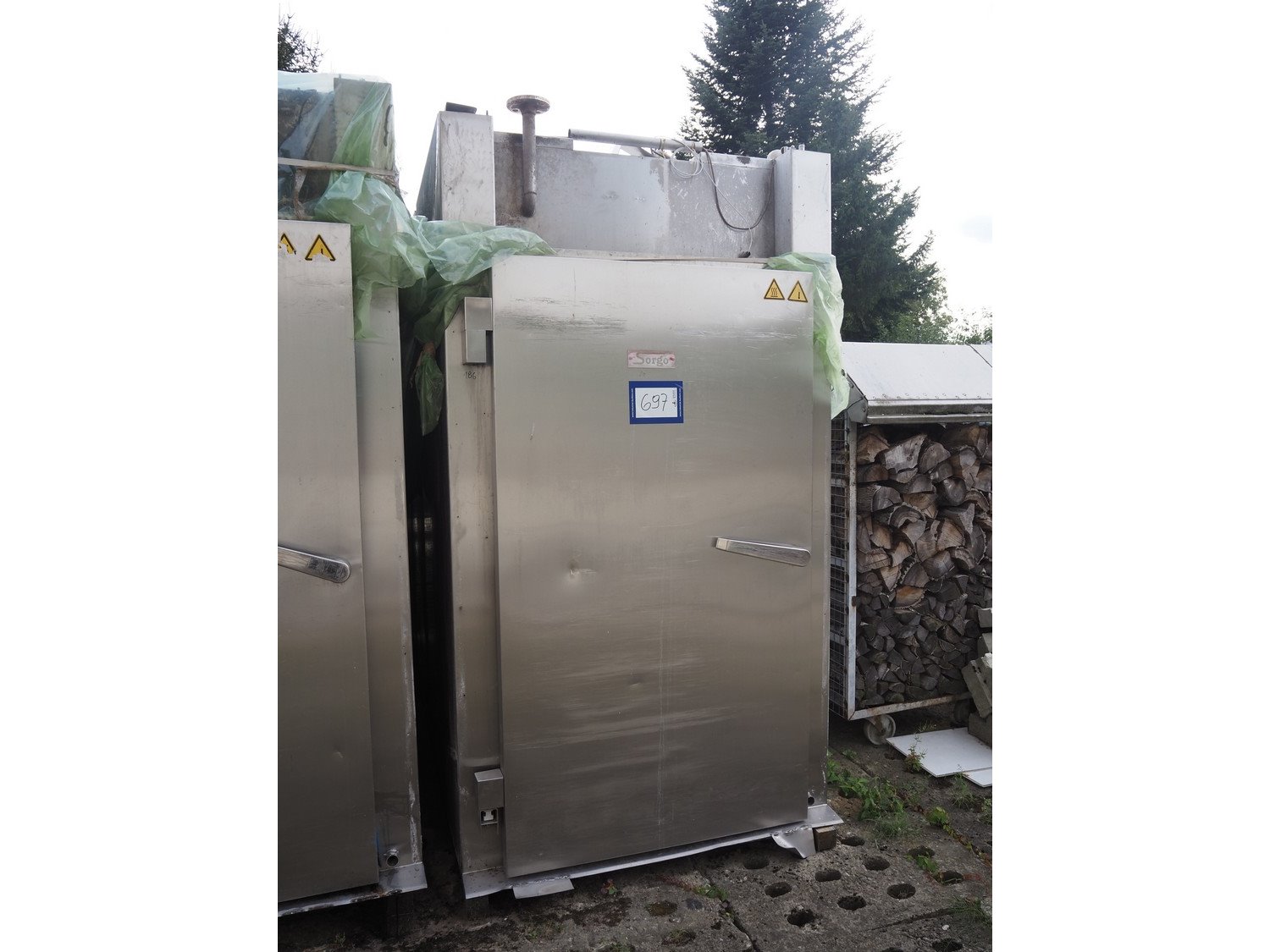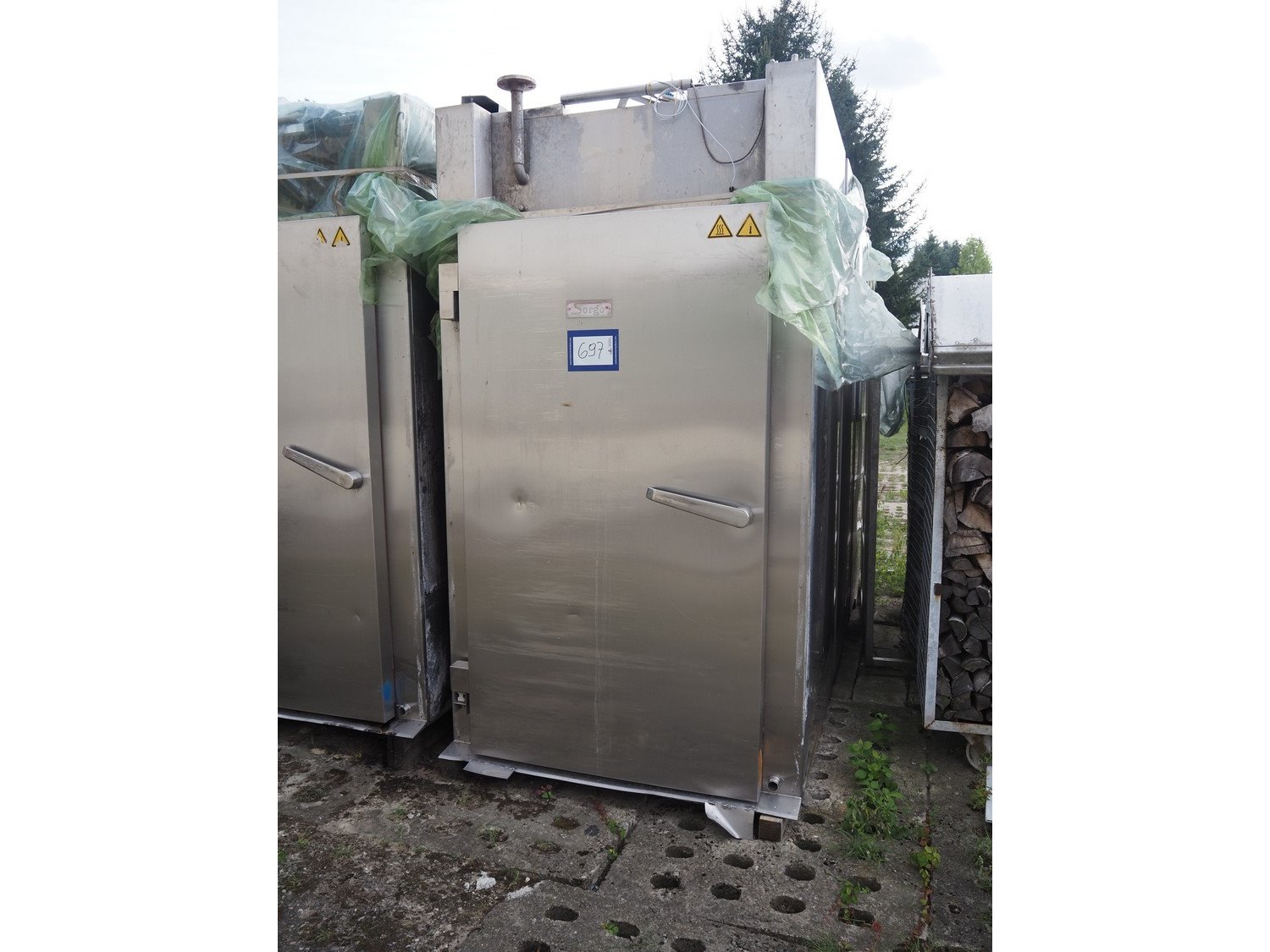 Sorgo smoke chamber for 3 trolleys, inside dimensions: 1300 mm x 3250 mm x 2040 mm, total dimensions: 1450 mm x 3600 mm x 2700 mm. Including smoke generator and switch cabinet, dimensions smoke generator: 880 mm x 1000 mm x 1660 mm.