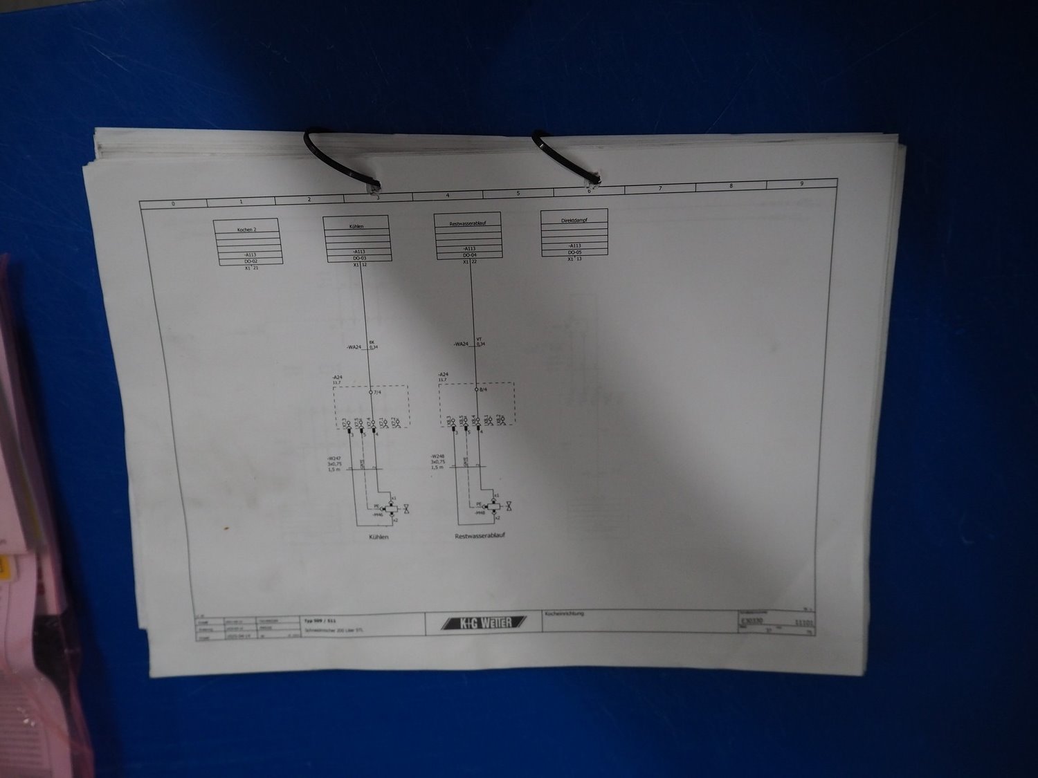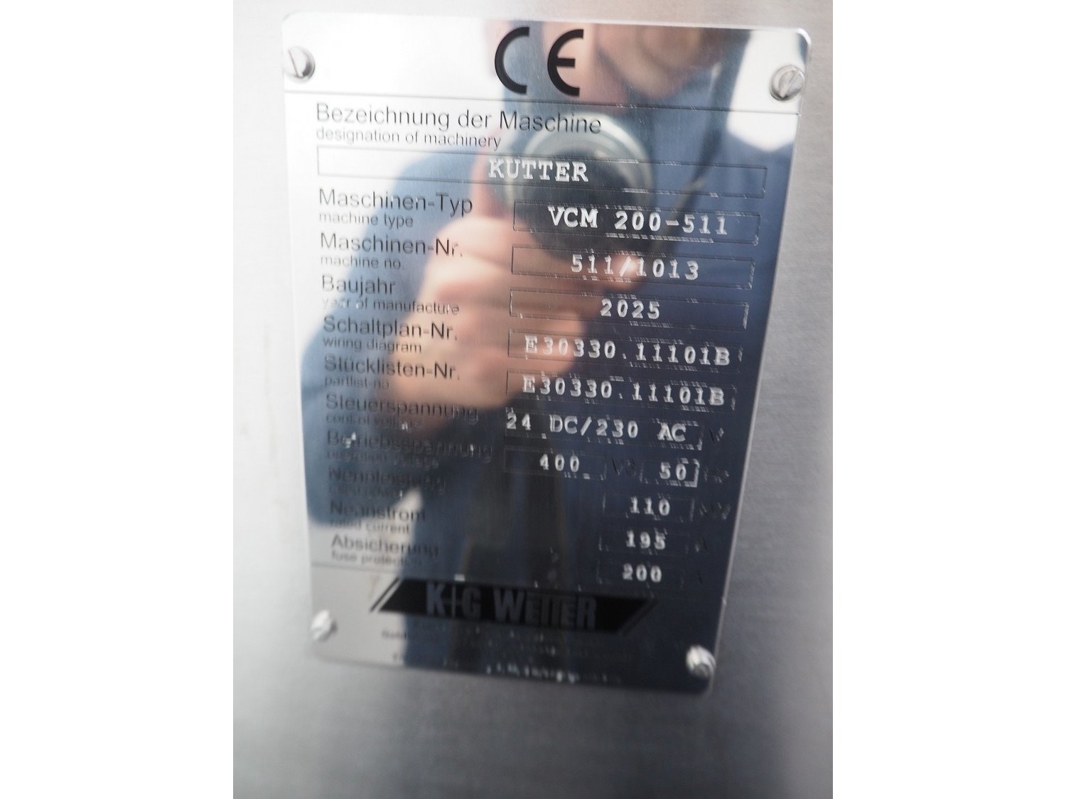 K+G Wetter vacuum and cooking cutter with lifter for 200 liter meat bins, machine type: VCM 200-511, machine number: 511/1013, year of construction: 2025, 400 V, 50 Hz, control voltage: 24 DC / 230 AC, rated current: 195 A, 110 kW, volume: 200 liter, cooling option in bowl with water (also under vacuum), stepless machine with 27 programmable speeds, custom-made with energy efficiency optimization and consumption display , total dimensions: 3200 mm x 2700 mm x 2200 mm. Cutter need to be removed by crane.