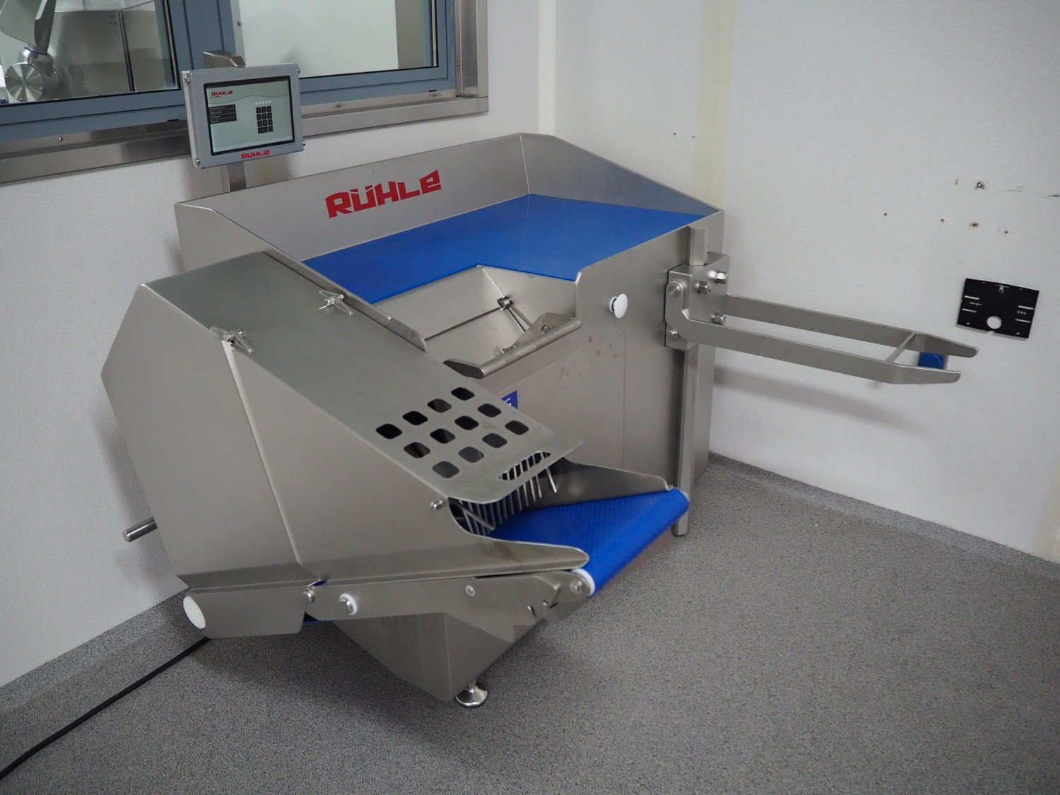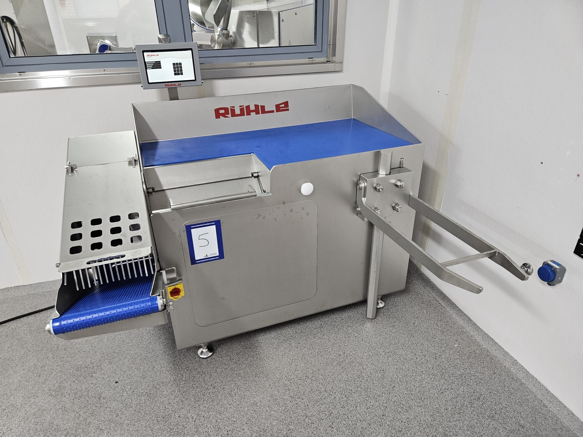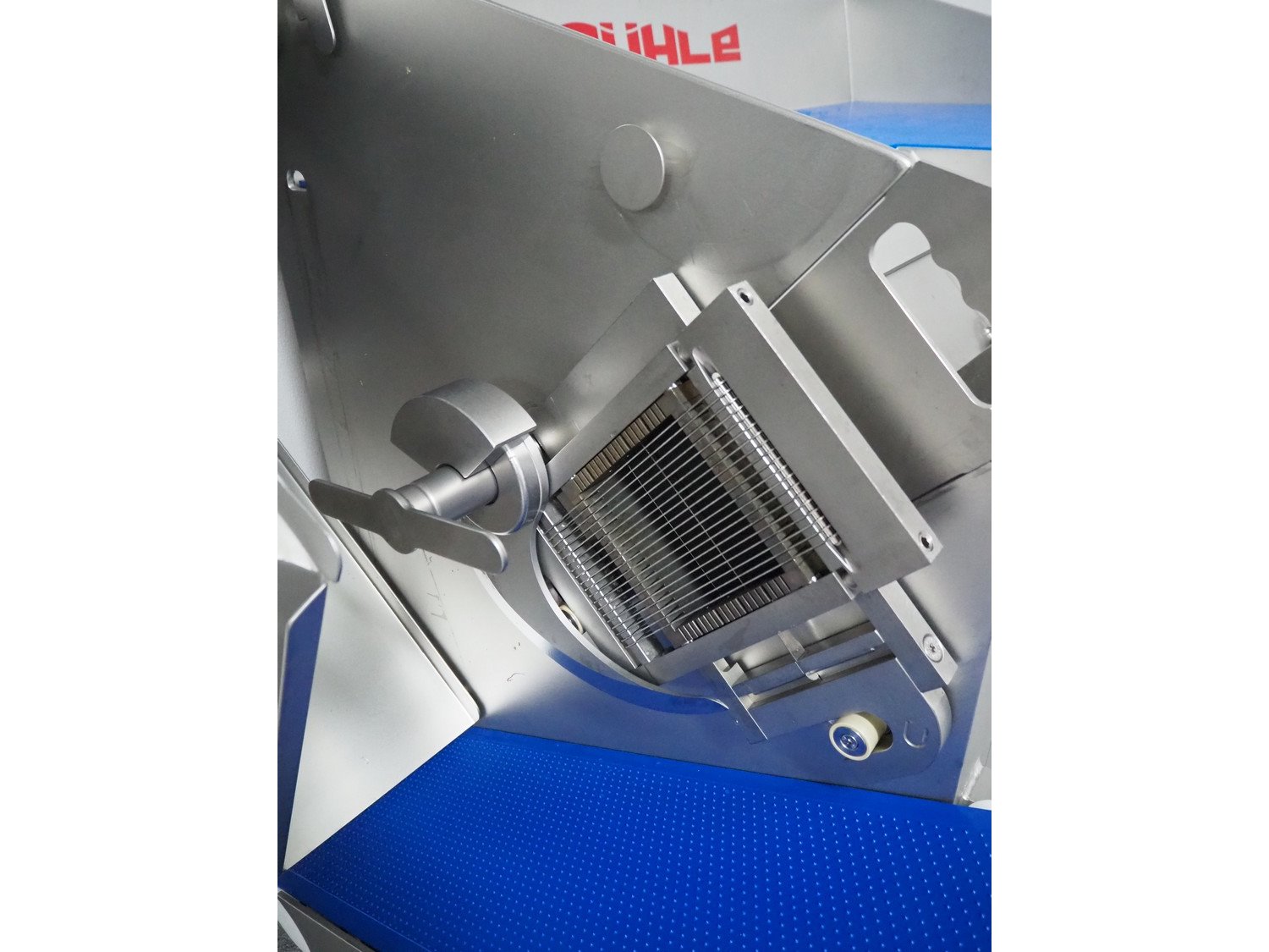 Rühle dicer with lifter for E2 crates and outfeed belt, model: SR 2 Bi Turbo, serial number: 40051146, year of construction: 2025, 400 V, 3 Ph, 50 Hz, 13.2 A, 5.3 kW, plastic outfeed belt, belt width: 260 mm, total dimensions: 1600 mm x 1500 mm x 1450 mm. Including various grids.