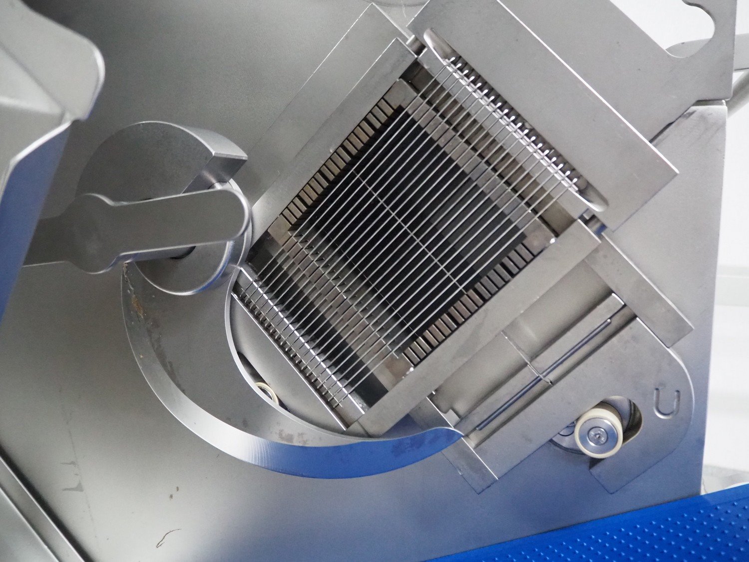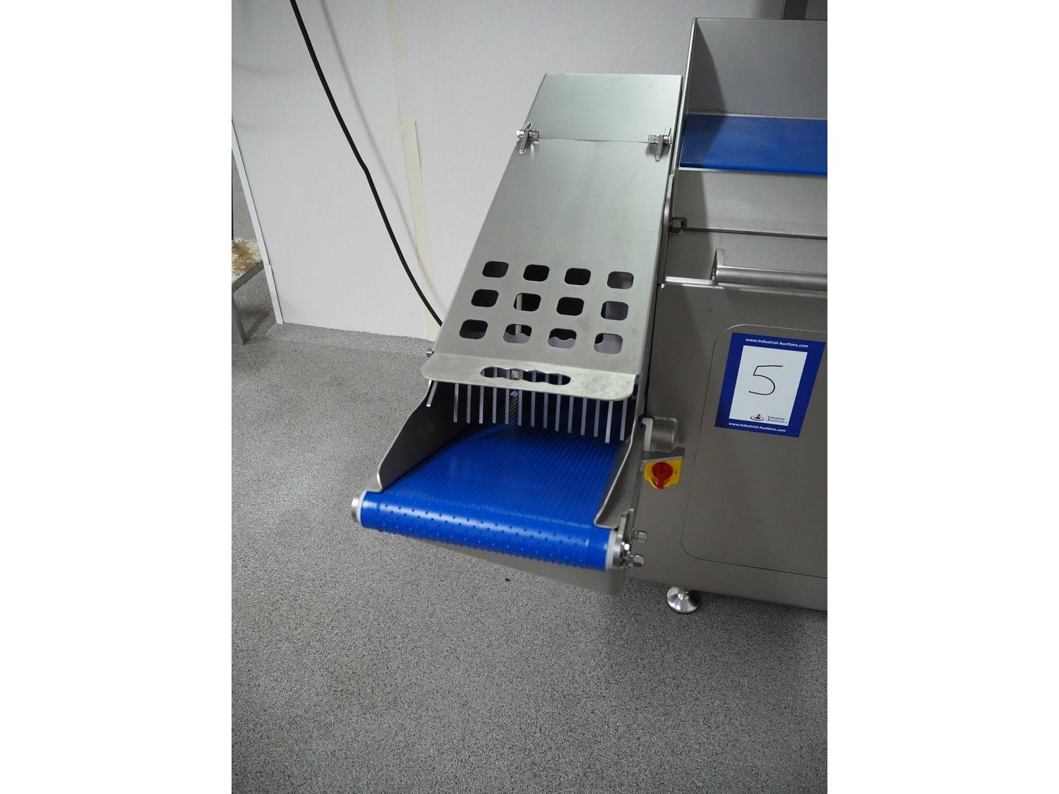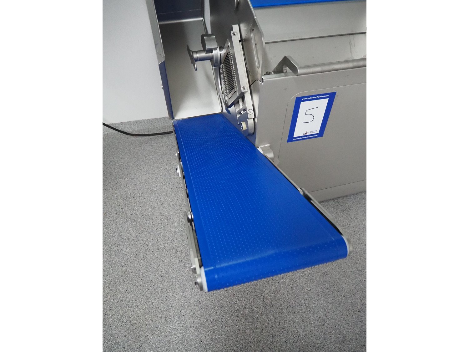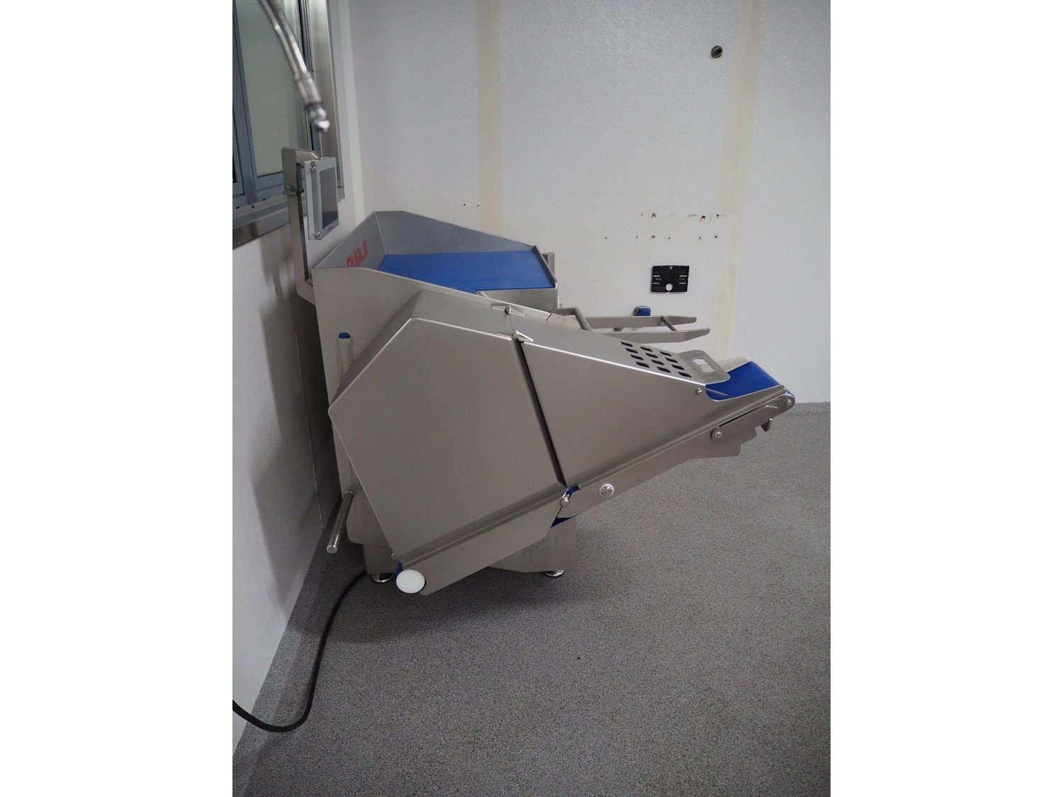 Rühle dicer with lifter for E2 crates and outfeed belt, model: SR 2 Bi Turbo, serial number: 40051146, year of construction: 2025, 400 V, 3 Ph, 50 Hz, 13.2 A, 5.3 kW, plastic outfeed belt, belt width: 260 mm, total dimensions: 1600 mm x 1500 mm x 1450 mm. Including various grids.