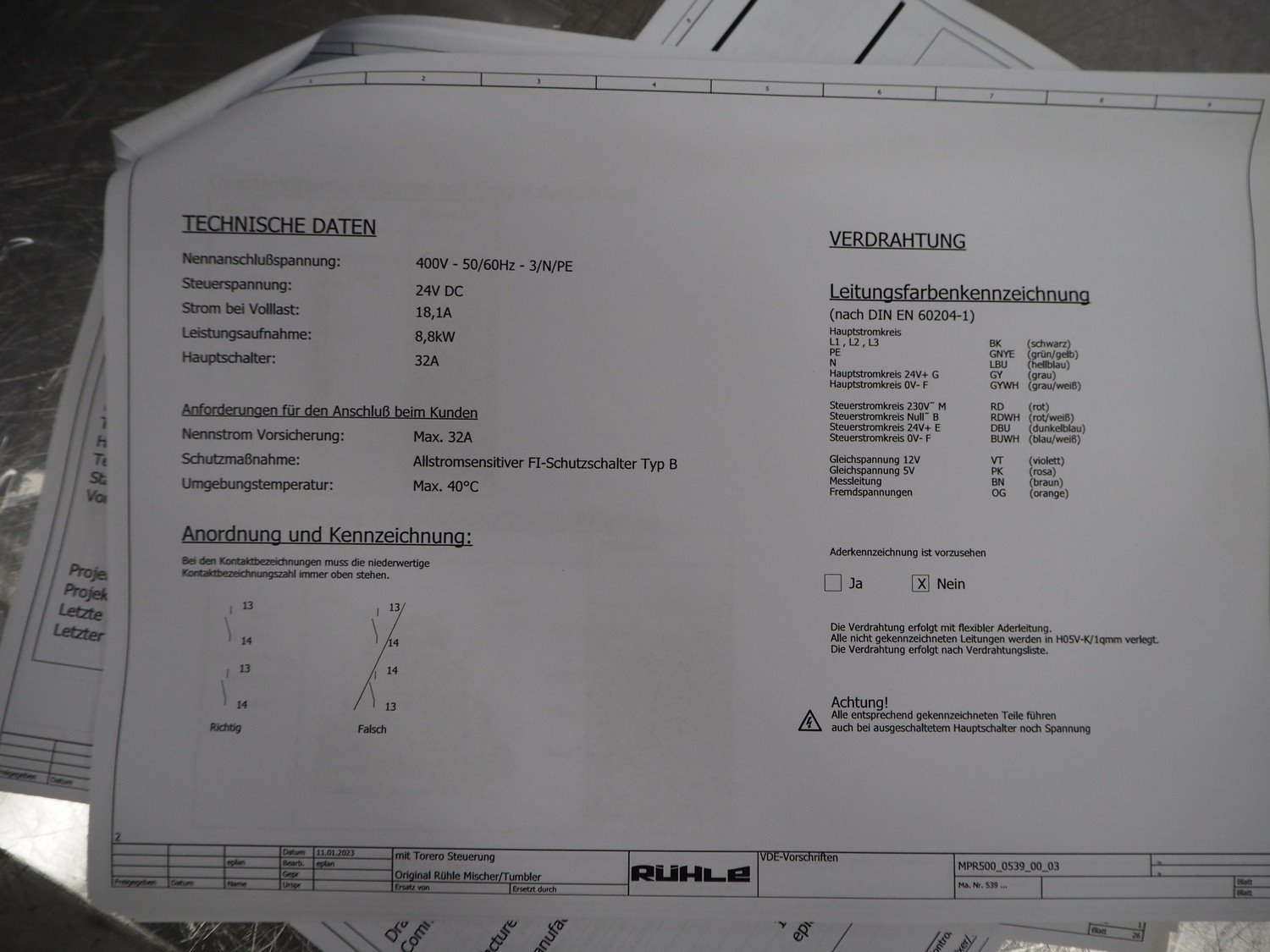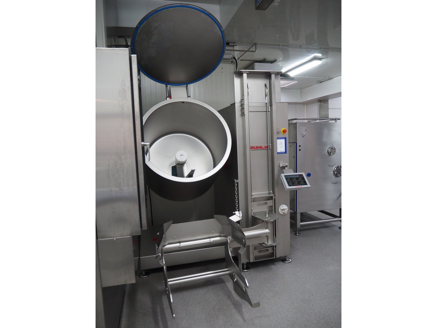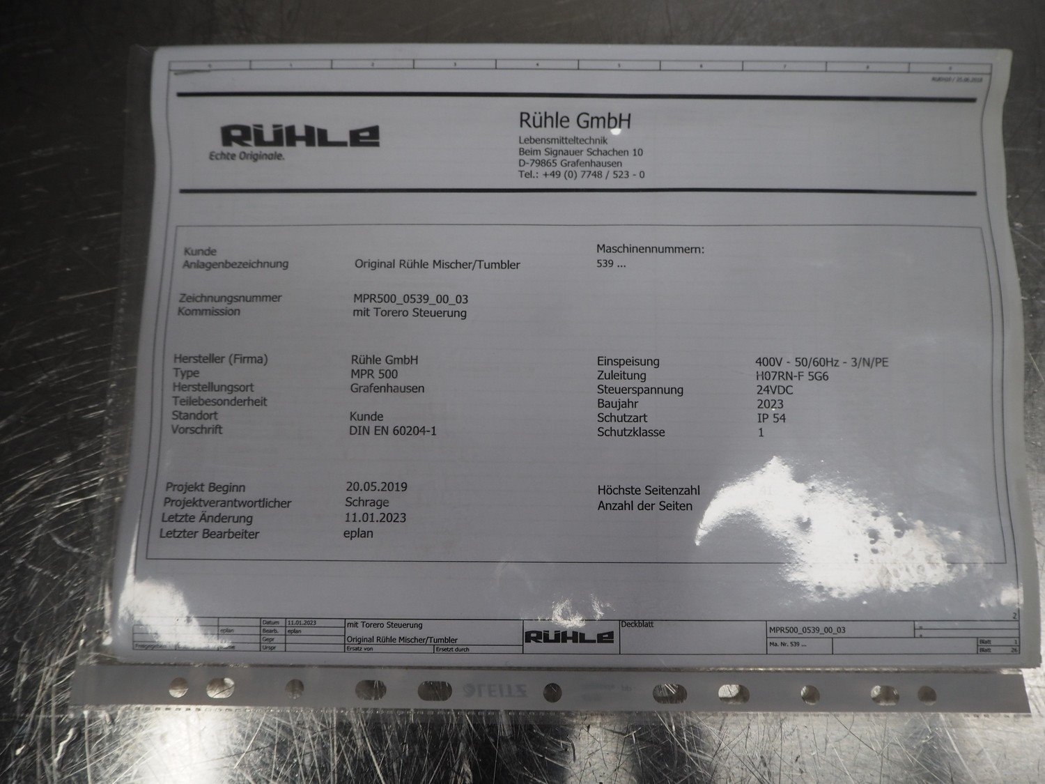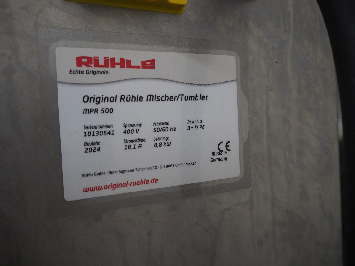 Rühle cooled vacuum mixer / tumbler with lifter for 200 liter meat bins, model: MPR 500, serial number: 10130541, year of construction: 2024, 400 V, 3 Ph, 50/60 Hz, 18.1 A, 8.8 kW, volume: 500 liter, built-in Busch vacuum pump, type: KC 0016 E 3Z0 MMZZ, year of construction: 2024, volume: 19 m³ per hour, total dimensions: 2000 mm x 2400 mm x 2350 mm. Tumbler need to be removed by crane.