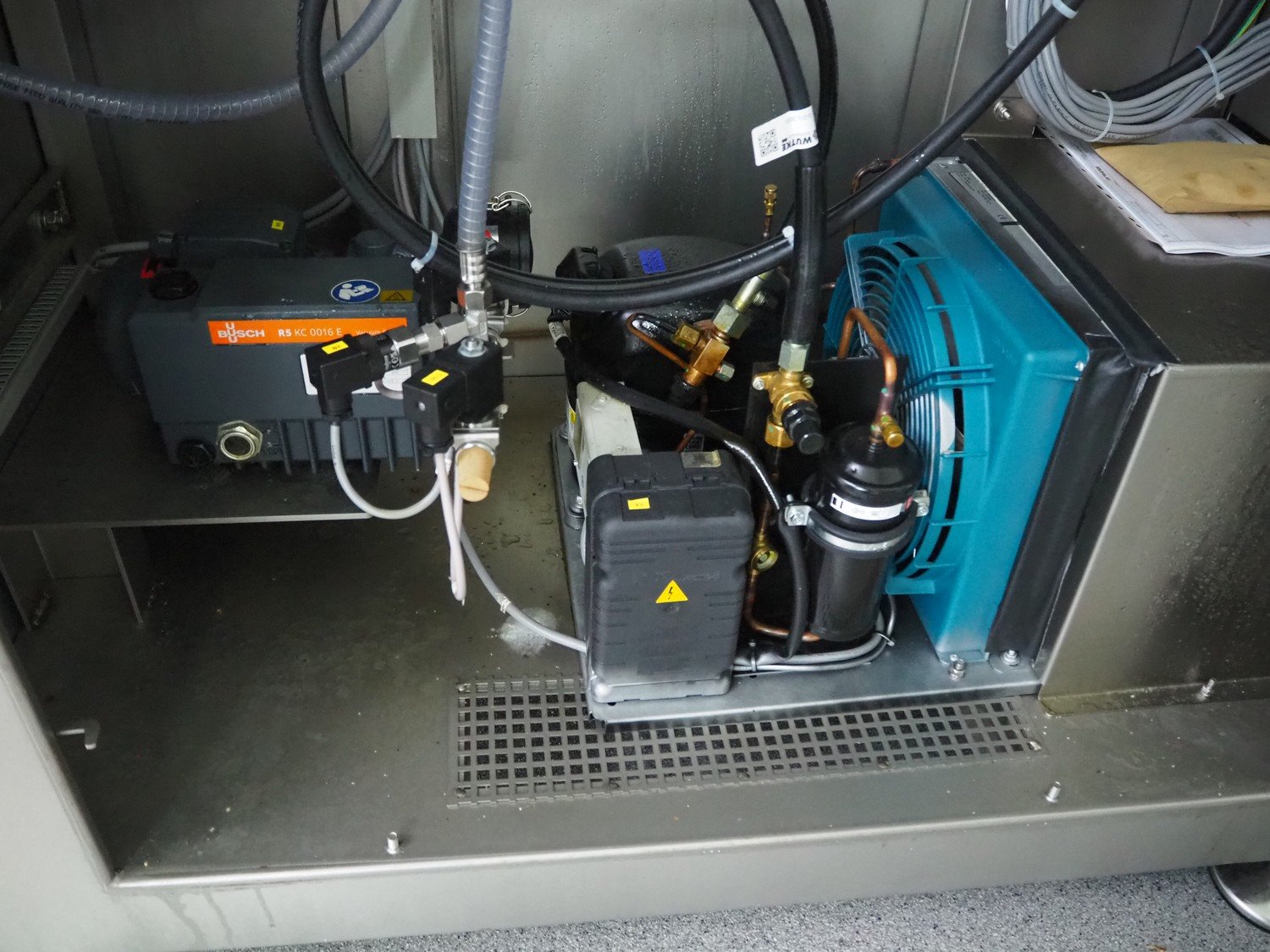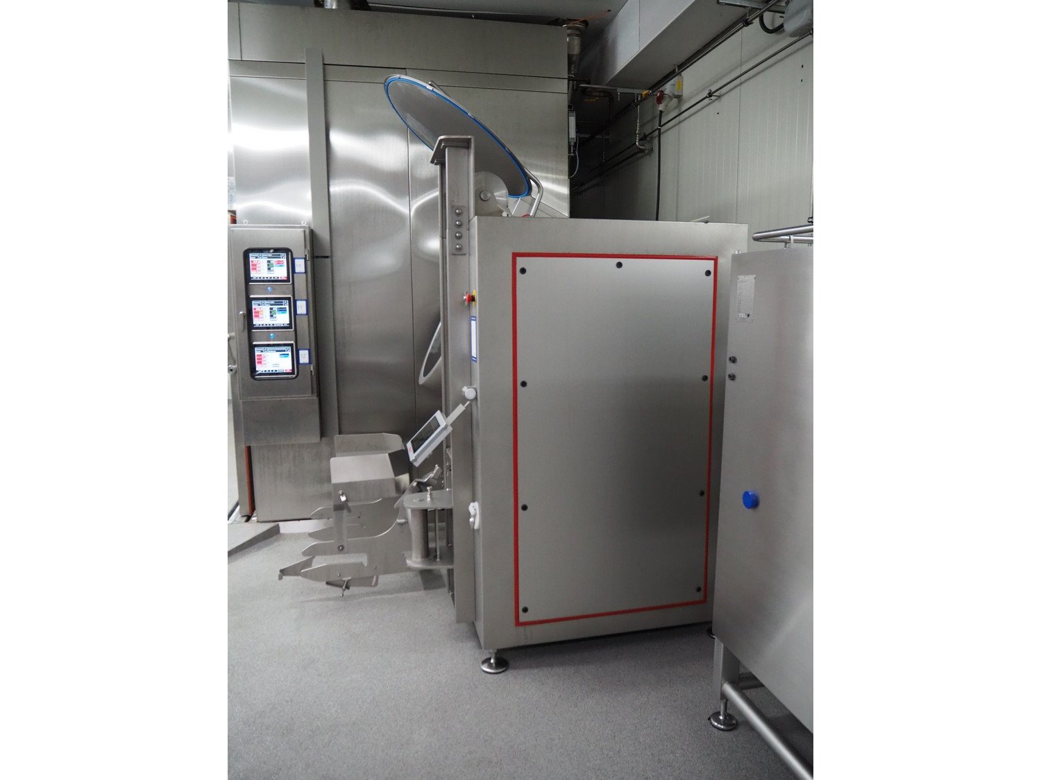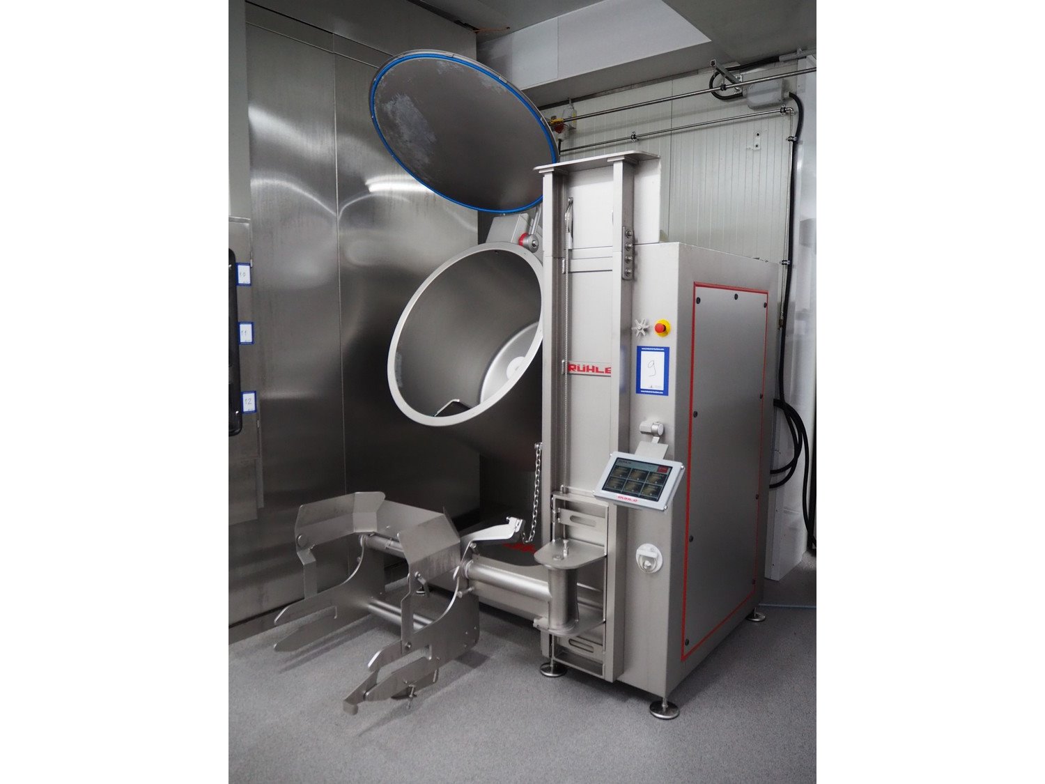 Rühle cooled vacuum mixer / tumbler with lifter for 200 liter meat bins, model: MPR 500, serial number: 10130541, year of construction: 2024, 400 V, 3 Ph, 50/60 Hz, 18.1 A, 8.8 kW, volume: 500 liter, built-in Busch vacuum pump, type: KC 0016 E 3Z0 MMZZ, year of construction: 2024, volume: 19 m³ per hour, total dimensions: 2000 mm x 2400 mm x 2350 mm. Tumbler need to be removed by crane.