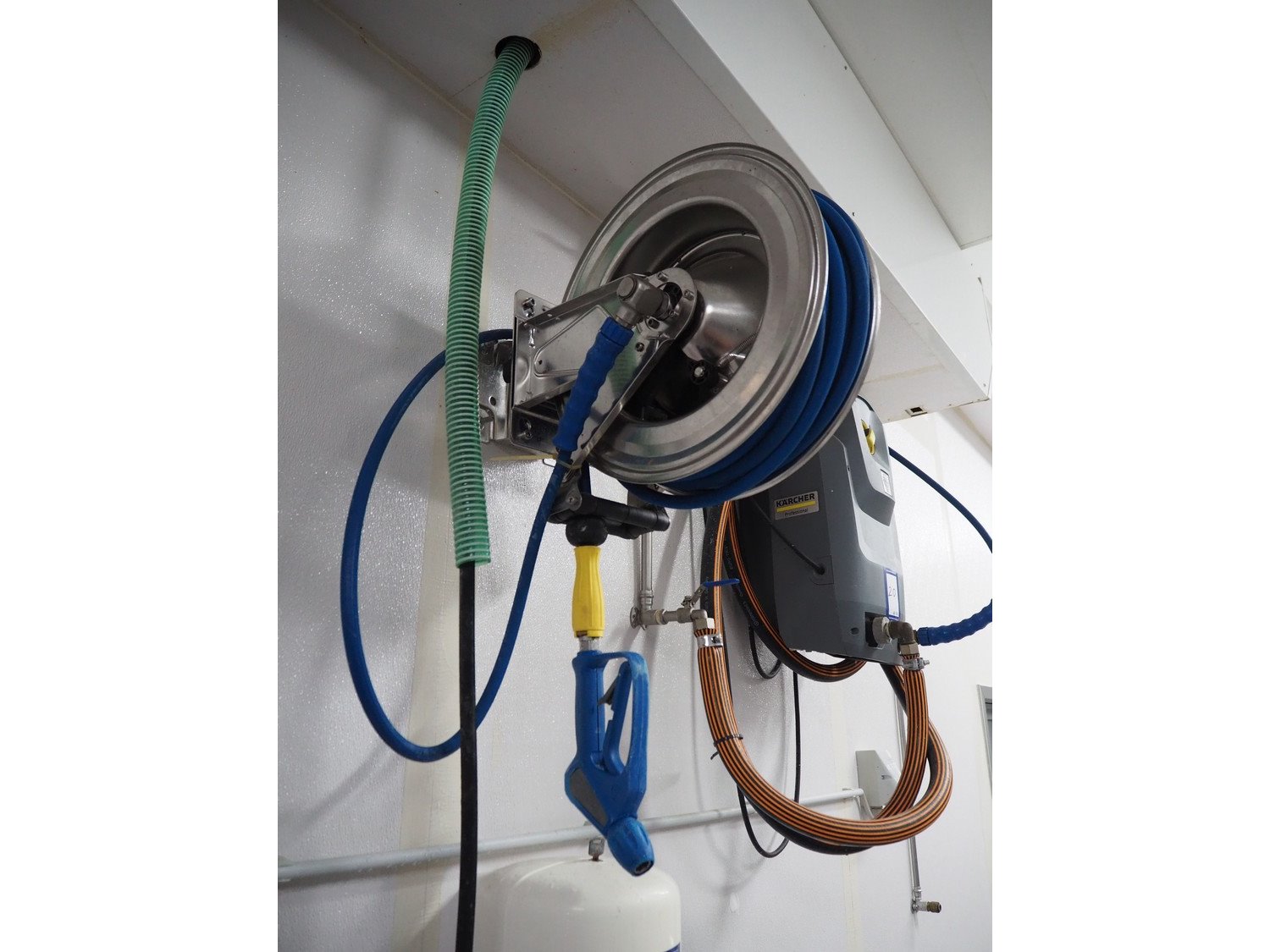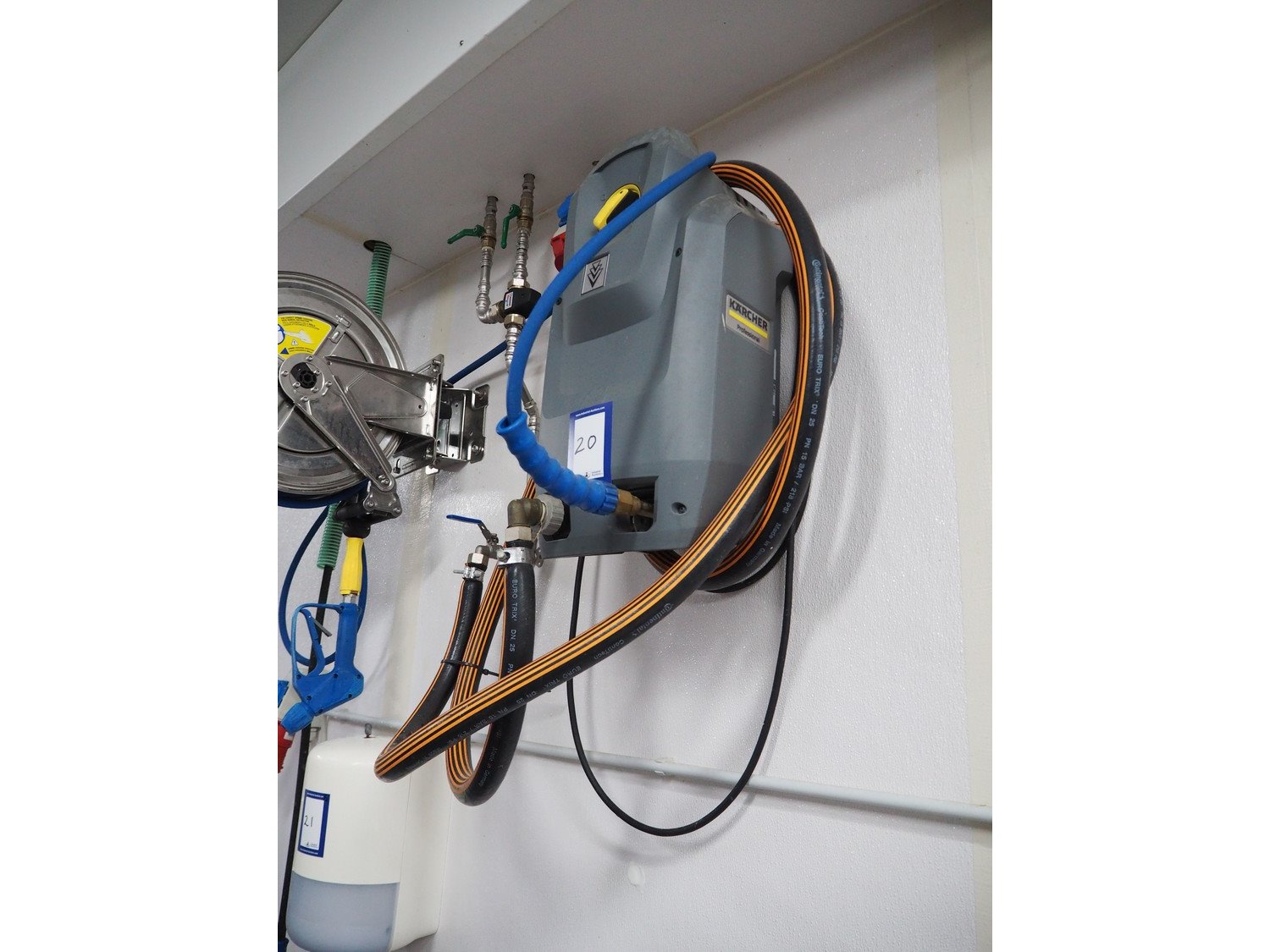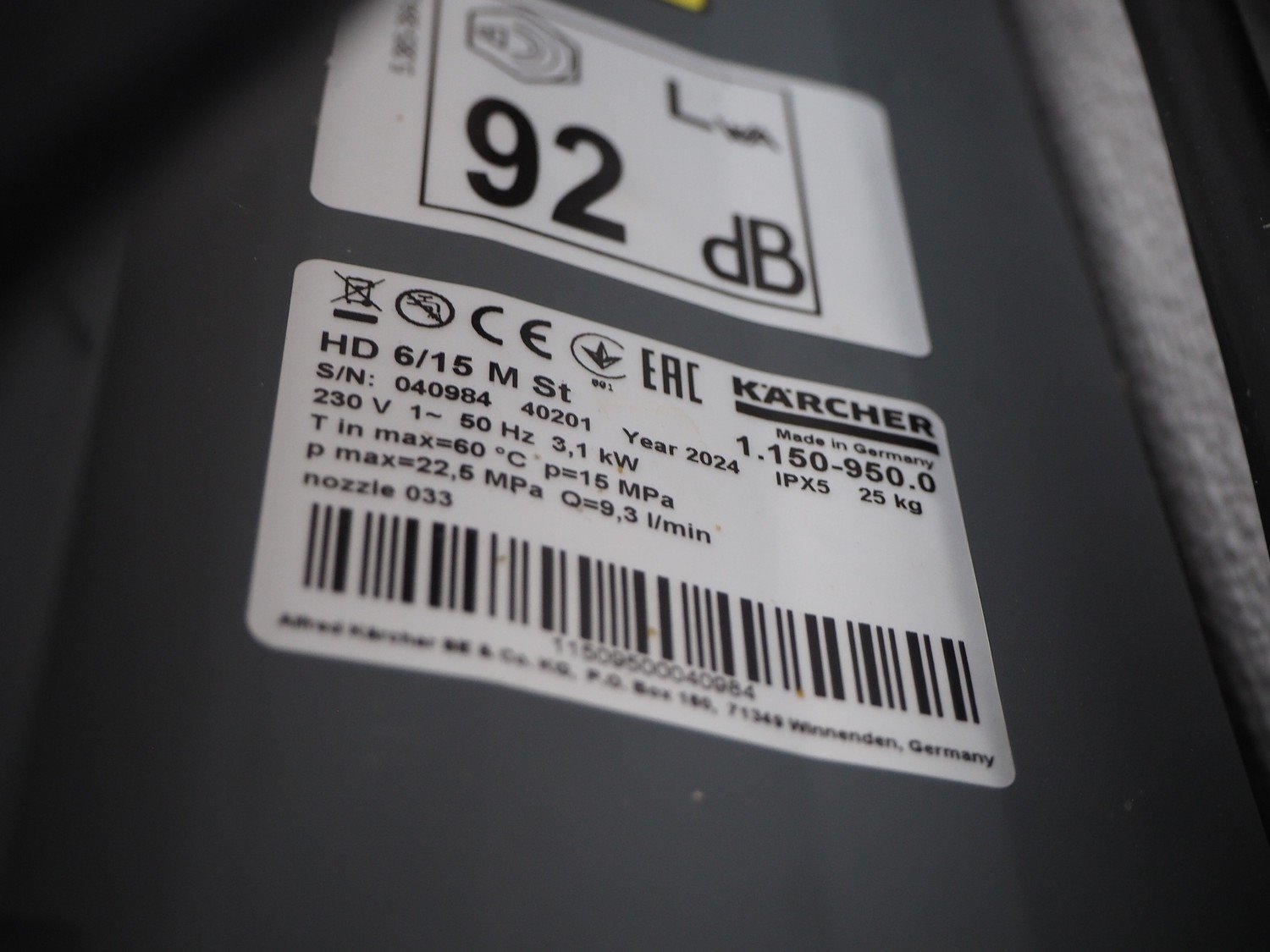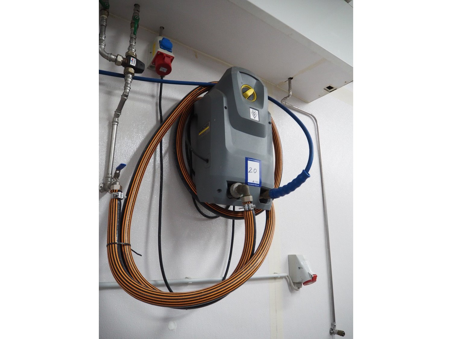 High pressure cleaning installation consisting of Kärcher high pressure cleaner, model: HD 6/15 M St, serial number: 040984, year of construction: 2024, 230 V, 1 Ph, 50 Hz, capacity: 9.3 liter per minute, dimensions: 300 mm x 300 mm x 600 mm and s/s hose reel with hose and spraying gun, model pistol: ST-2700, maximum: 150˚C, 45 liter per minute, dimensions hose reel: 500 mm x 200 mm x 500 mm.