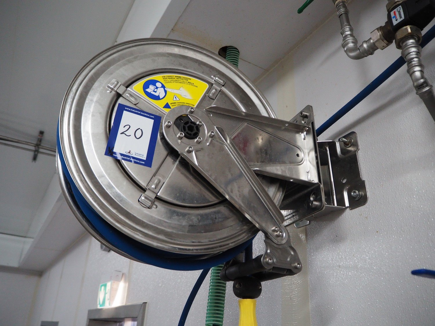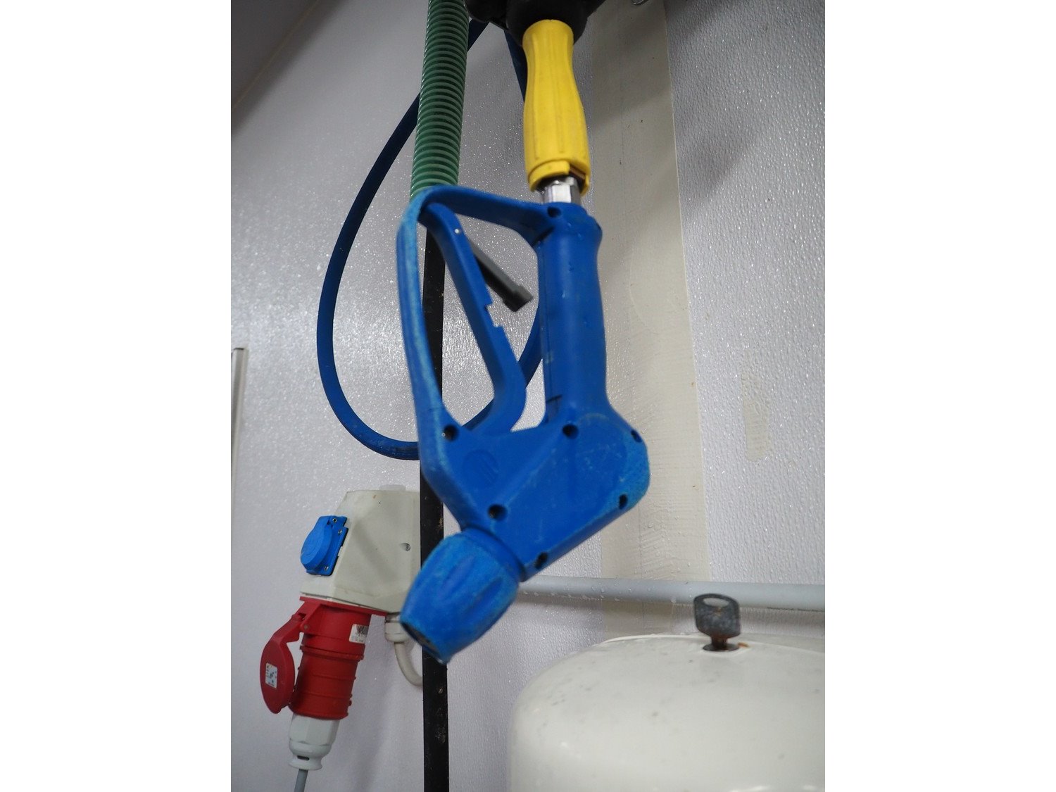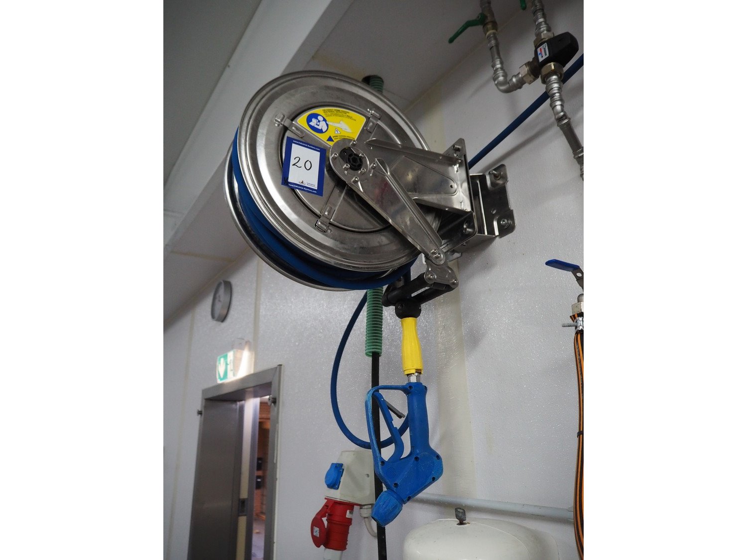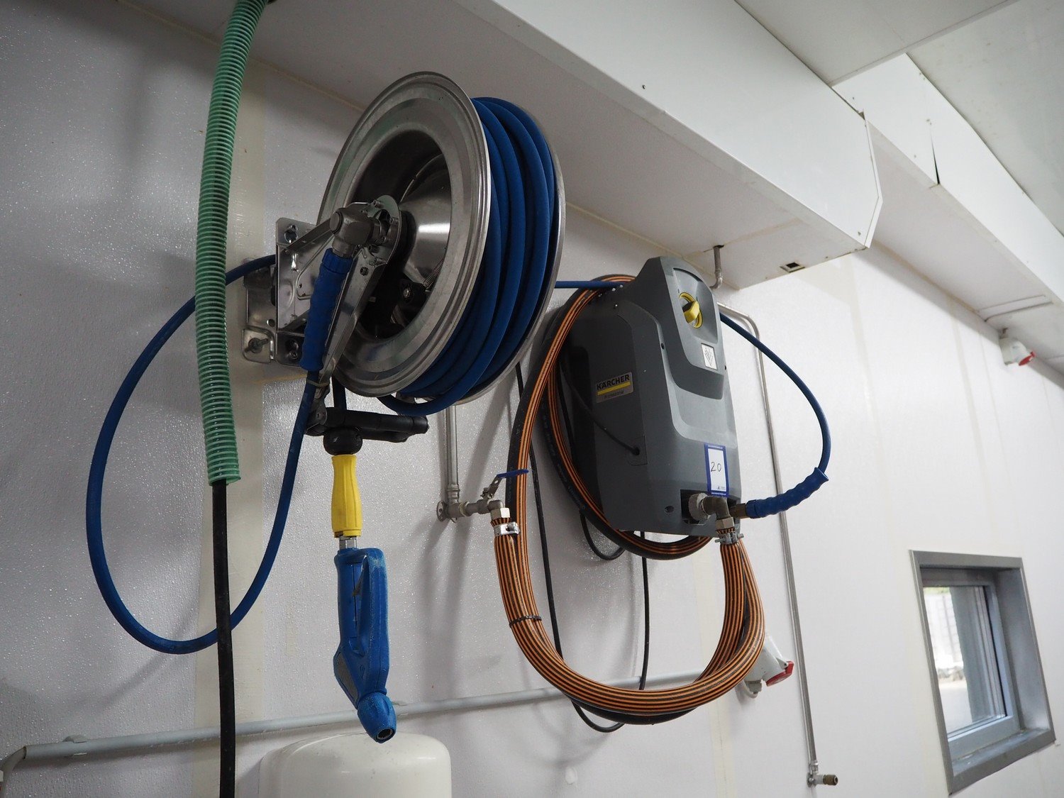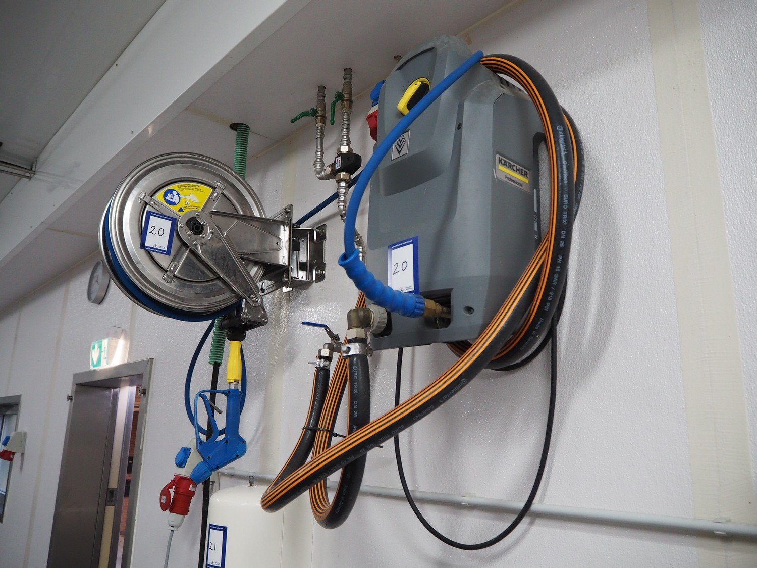 High pressure cleaning installation consisting of Kärcher high pressure cleaner, model: HD 6/15 M St, serial number: 040984, year of construction: 2024, 230 V, 1 Ph, 50 Hz, capacity: 9.3 liter per minute, dimensions: 300 mm x 300 mm x 600 mm and s/s hose reel with hose and spraying gun, model pistol: ST-2700, maximum: 150˚C, 45 liter per minute, dimensions hose reel: 500 mm x 200 mm x 500 mm.