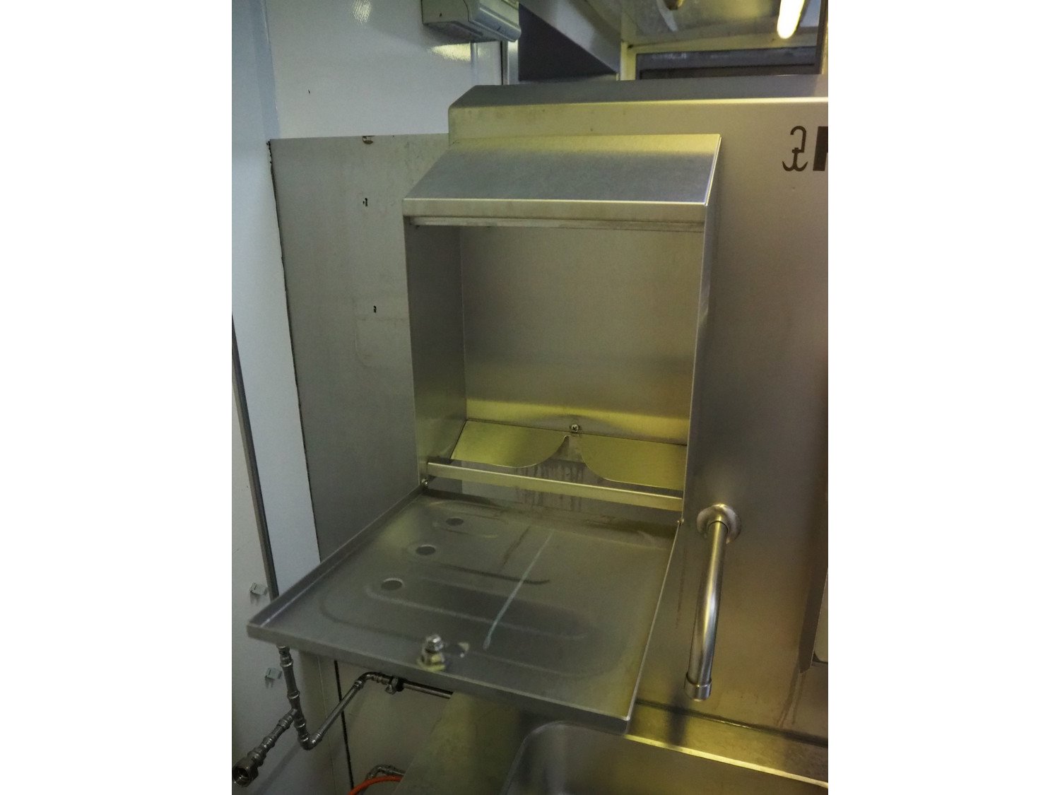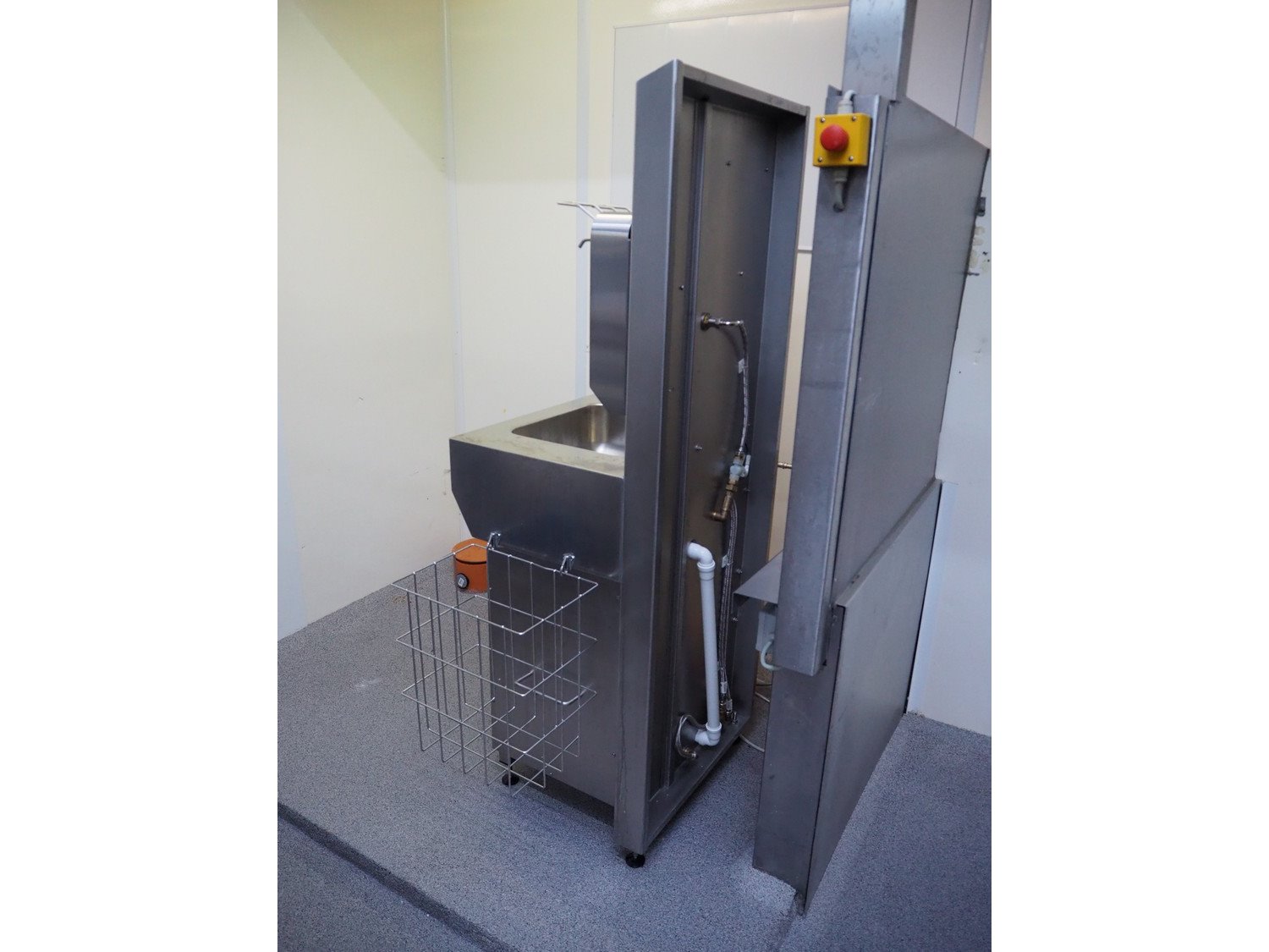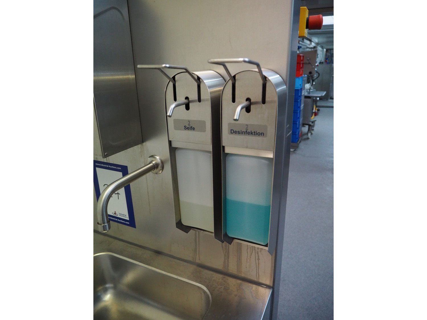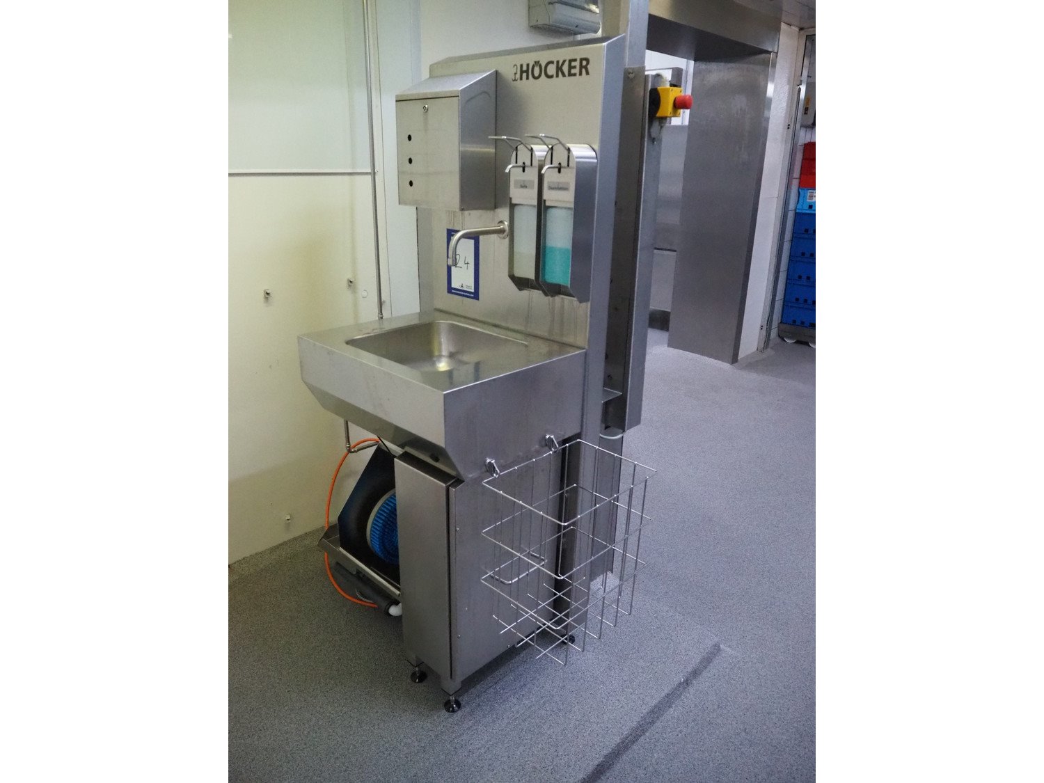 Hӧcker hygiene station consisting of sole cleaner, s/s sink with 1 faucet, paper dispenser, 2 soap dispenser and waste bin, serial number: 24-26-002, year of construction: 2024, 400 V, 3 Ph, 50-60 Hz, 300 W, dimensions: 1100 mm x 600 mm x 1700 mm.