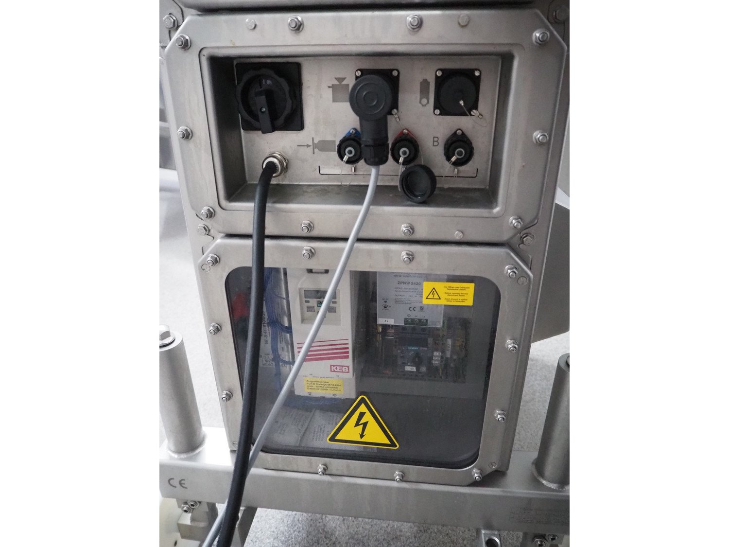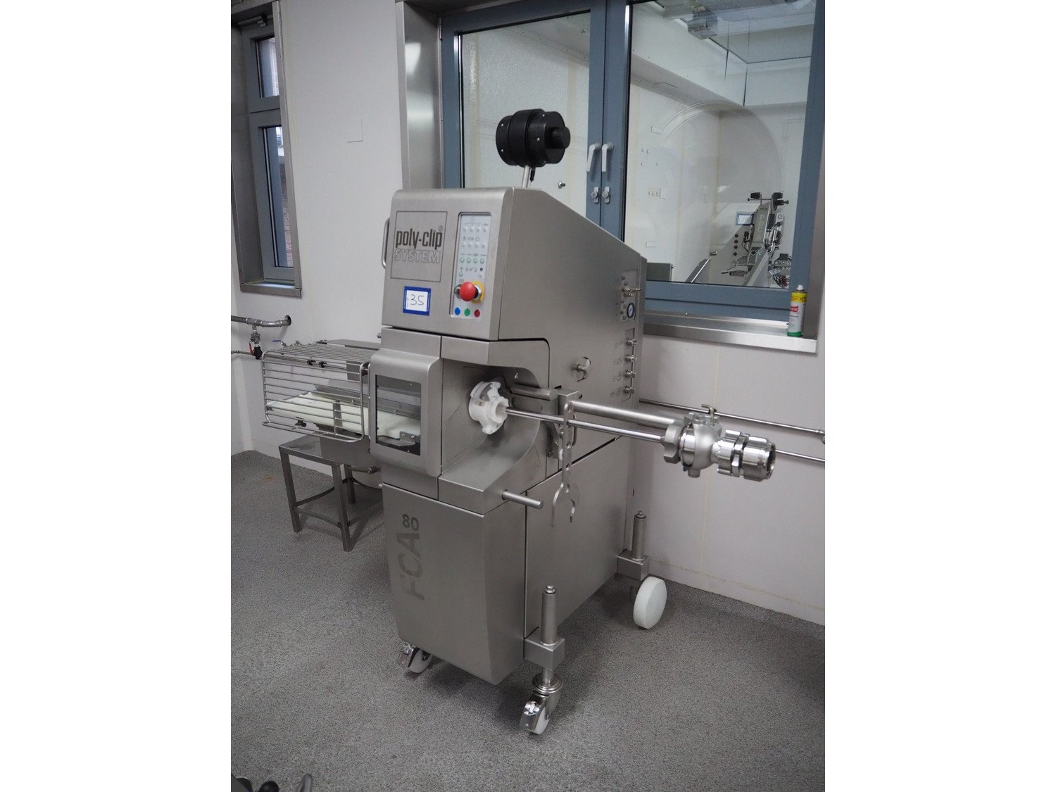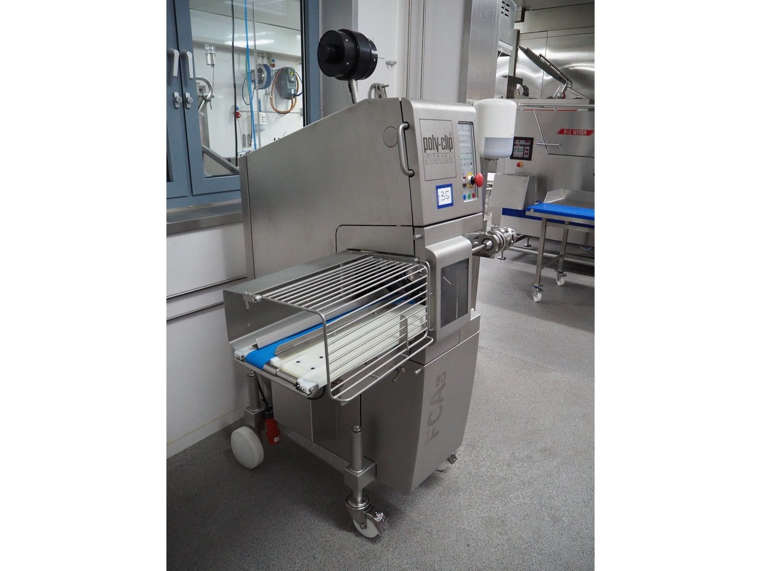 Poly-Clip System GmbH & Co. KG. mobile automatic double clipper, type: FCA 80, number: 1543, year of construction: 2024, 400 V, 3 Ph, 50/60 Hz, 16 A, 3 kW, 5-7 bar, plastic belt, belt width: 75 mm, total dimensions: 1700 mm x 1100 mm x 1950 mm.