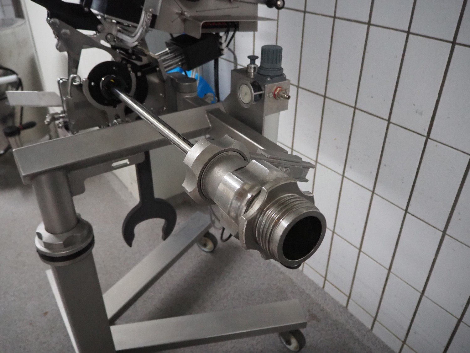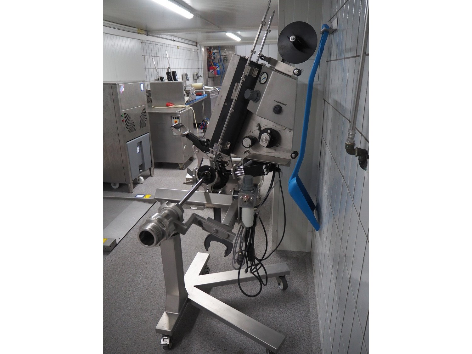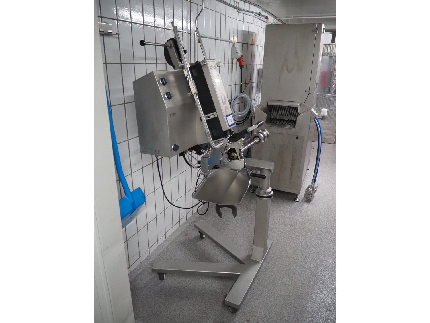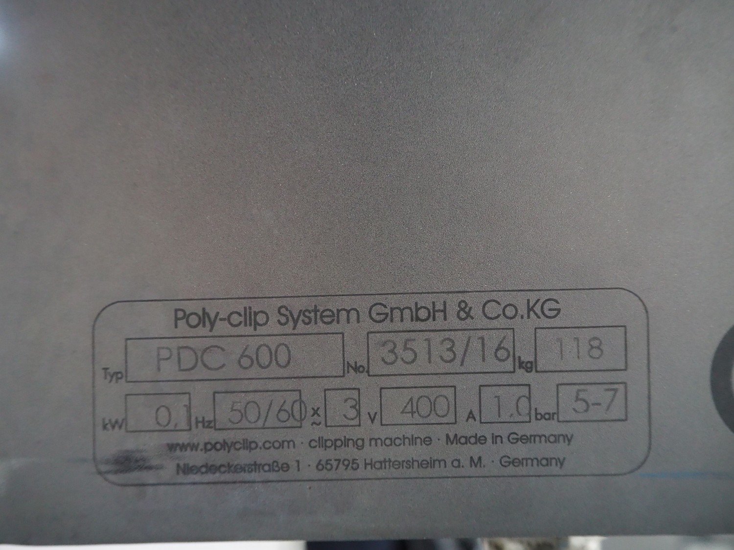 Poly-Clip System GmbH & Co. KG. mobile semi automatic double clipper, type: PDC 600, number: 3513, year of construction: 2016, 400 V, 3 Ph, 50/60 Hz, 1.0 bar, 0.1 kW, 5-7 bar, weight: 118 kg, total dimensions: 1100 mm x 800 mm x 1850 mm.