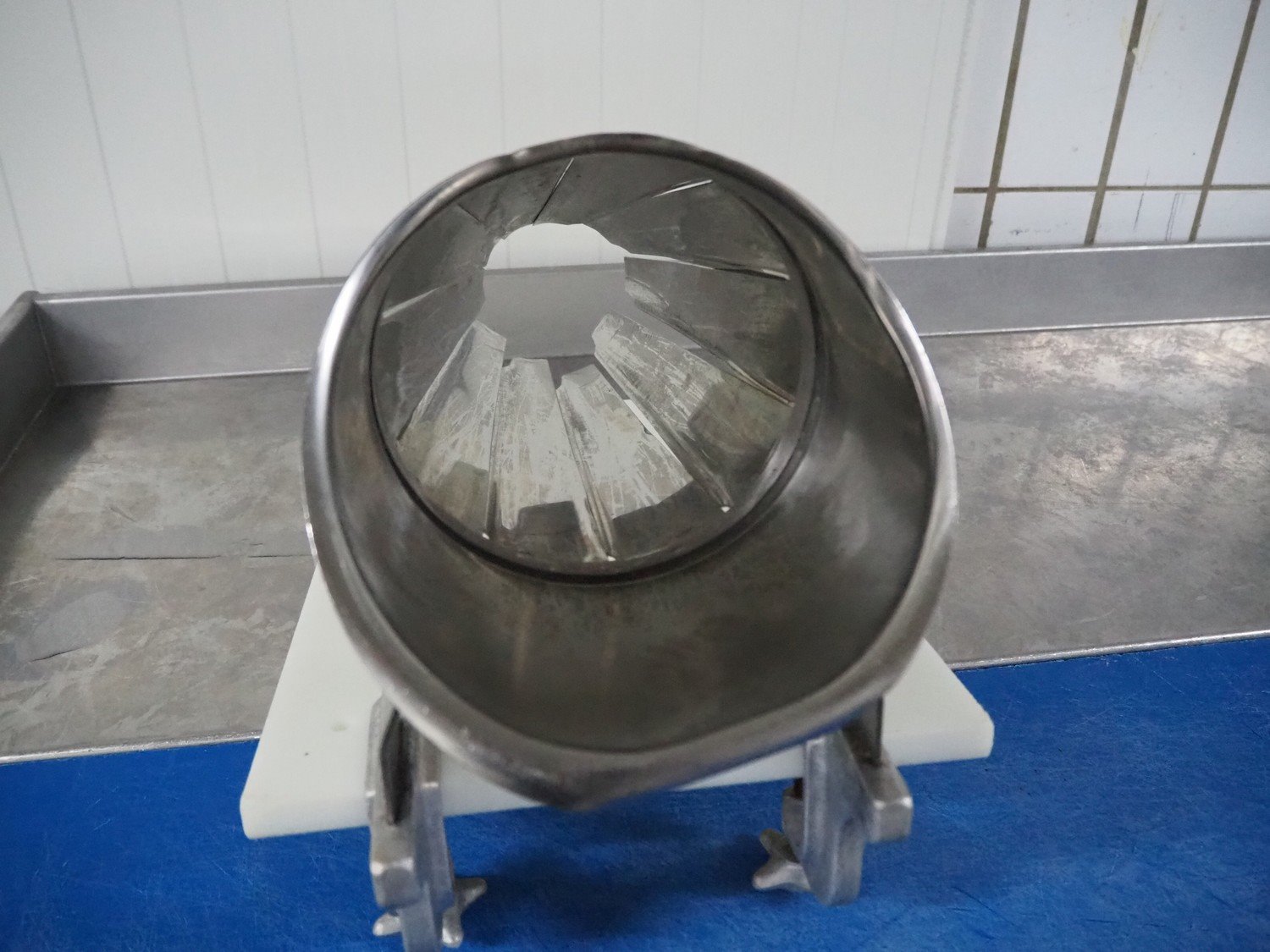 S/s netting machine on plastic plate, dimensions plate: 530 mm x 320 mm, diameter netting machine: 185 mm, total dimensions: 630 mm x 320 mm x 370 mm.