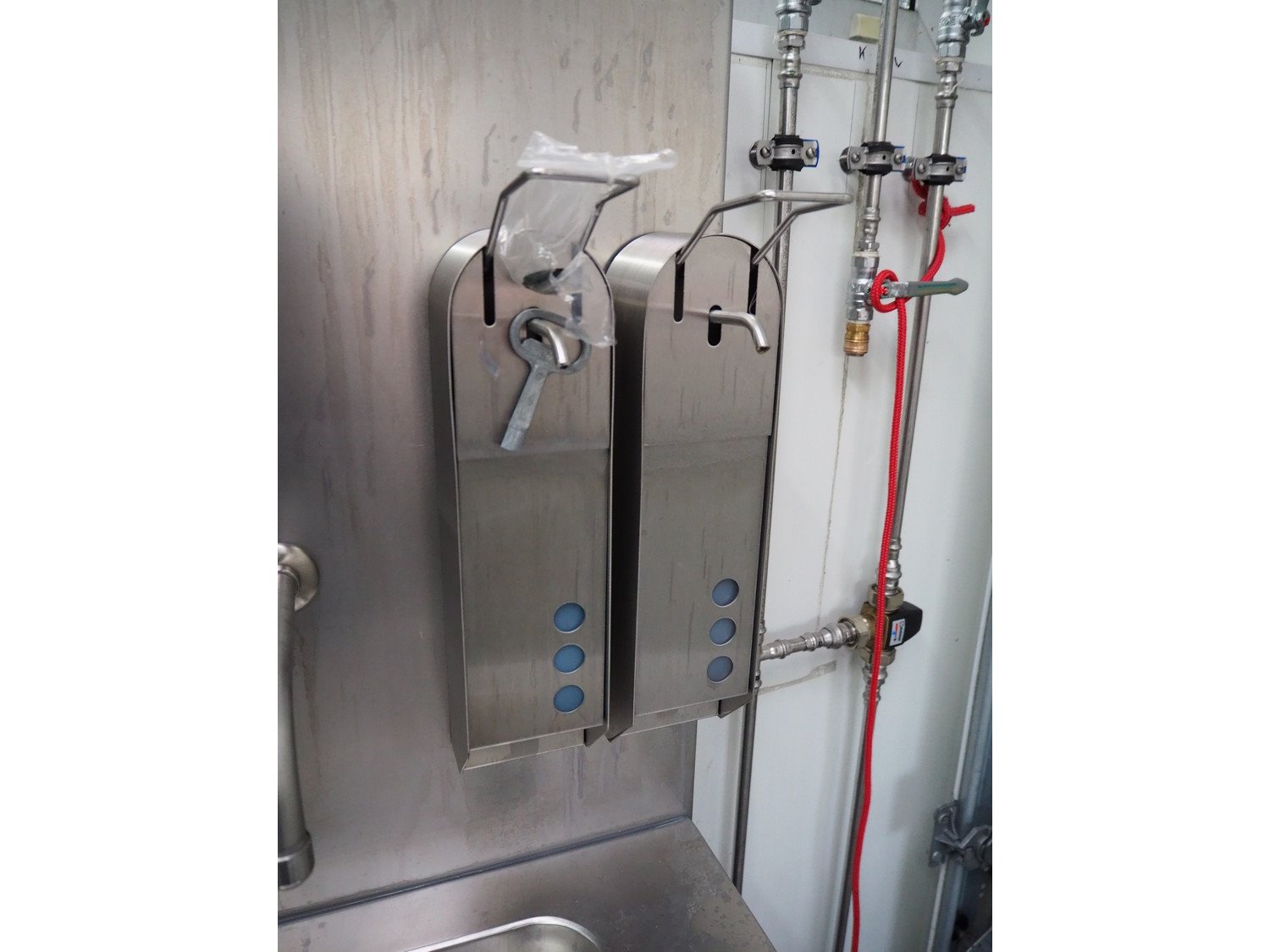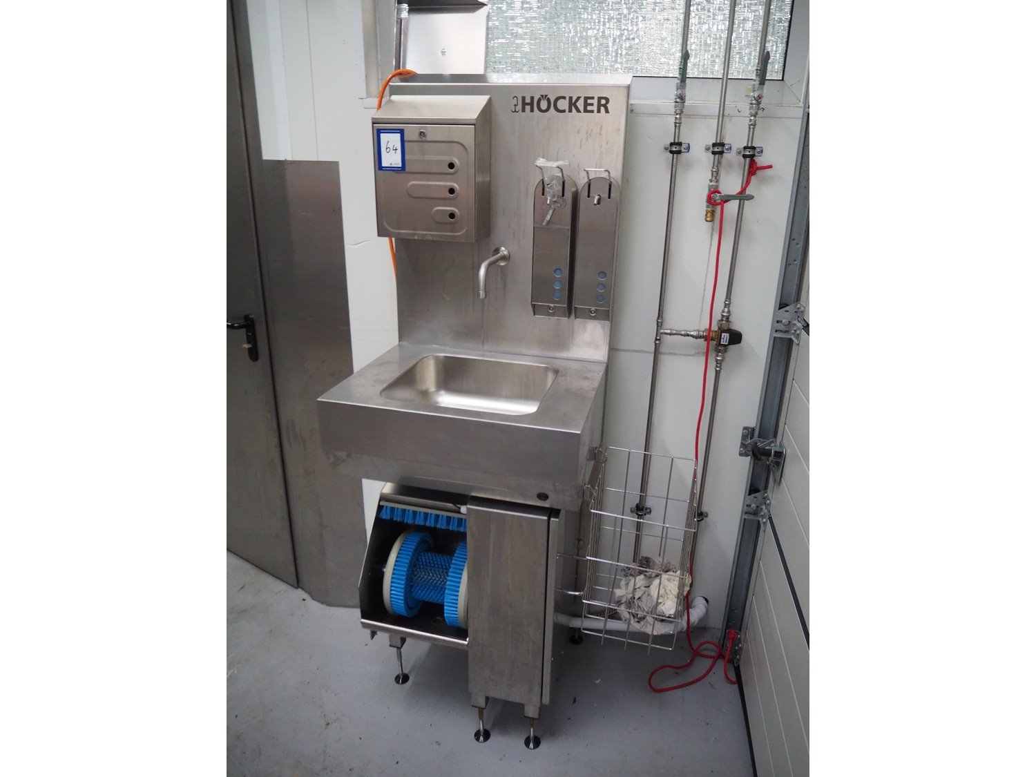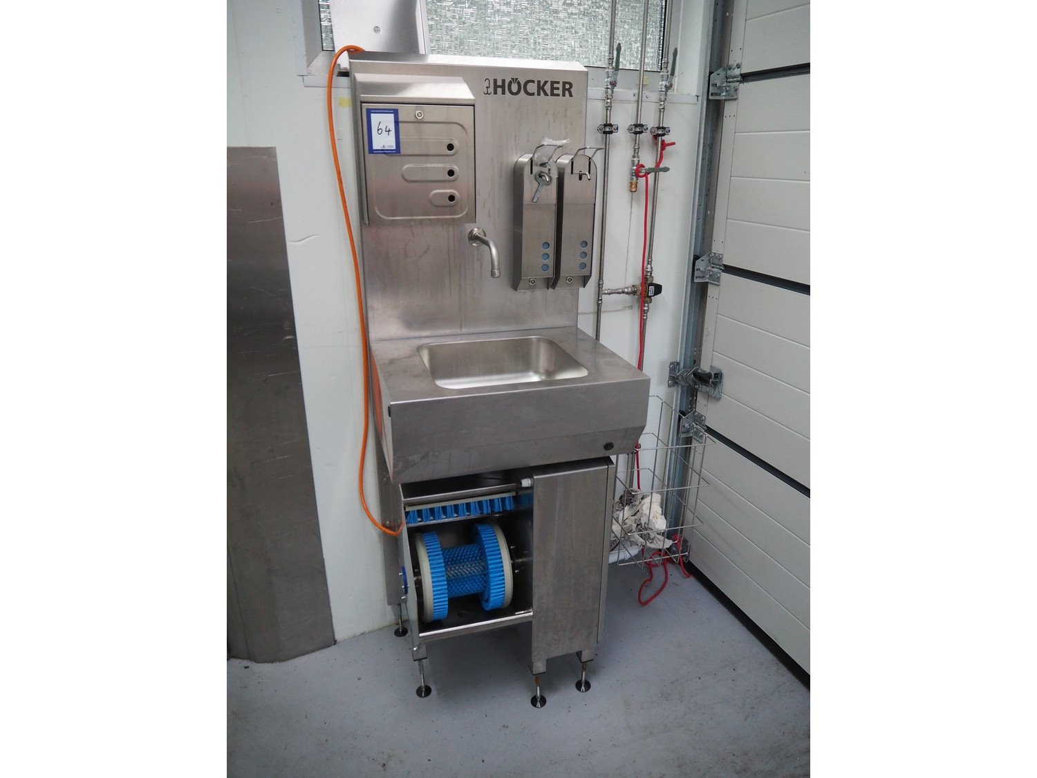 Hӧcker hygiene station consisting of sole cleaner, s/s sink with 1 faucet, paper dispenser, 2 soap dispenser and waste bin, serial number: 22-48-001, 400 V, 3 Ph, 50-60 Hz, 0.25 kW, dimensions: 1100 mm x 600 mm x 1700 mm.
