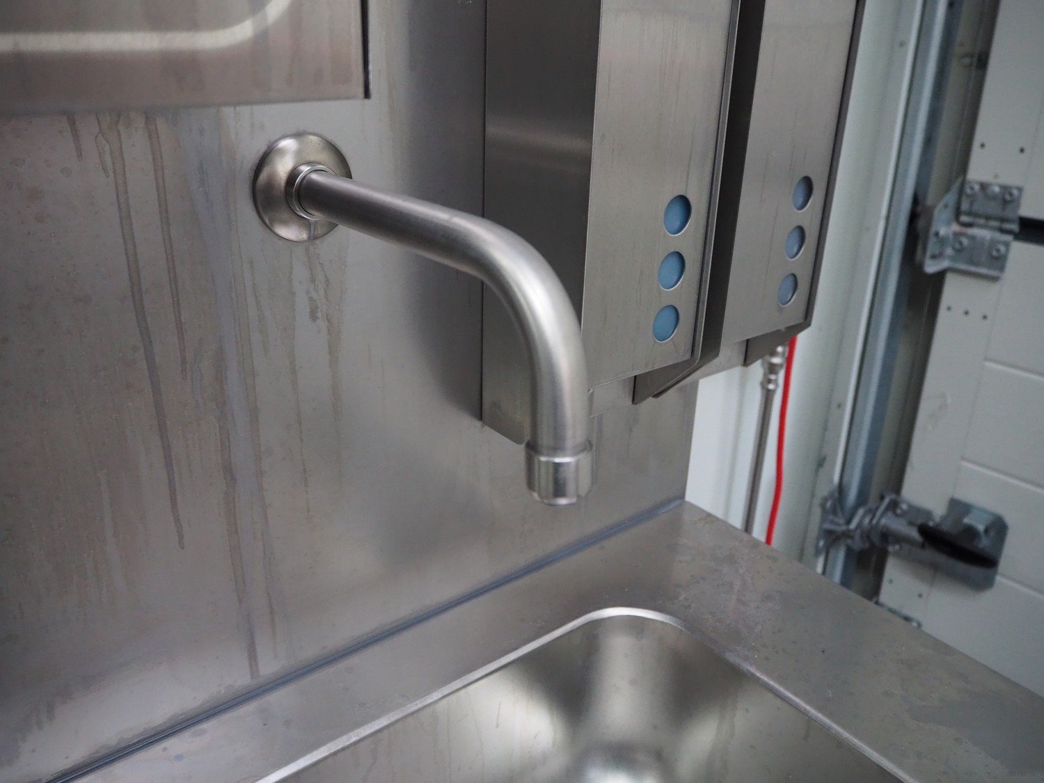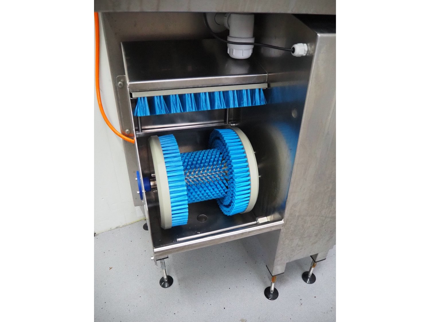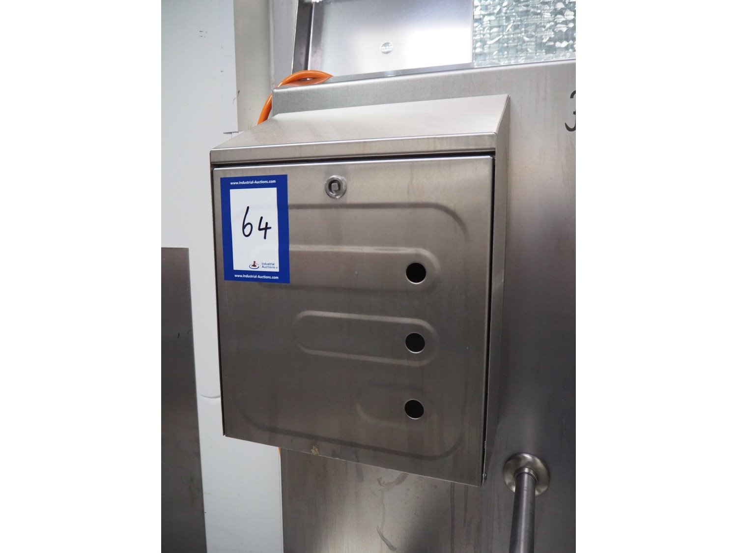 Hӧcker hygiene station consisting of sole cleaner, s/s sink with 1 faucet, paper dispenser, 2 soap dispenser and waste bin, serial number: 22-48-001, 400 V, 3 Ph, 50-60 Hz, 0.25 kW, dimensions: 1100 mm x 600 mm x 1700 mm.