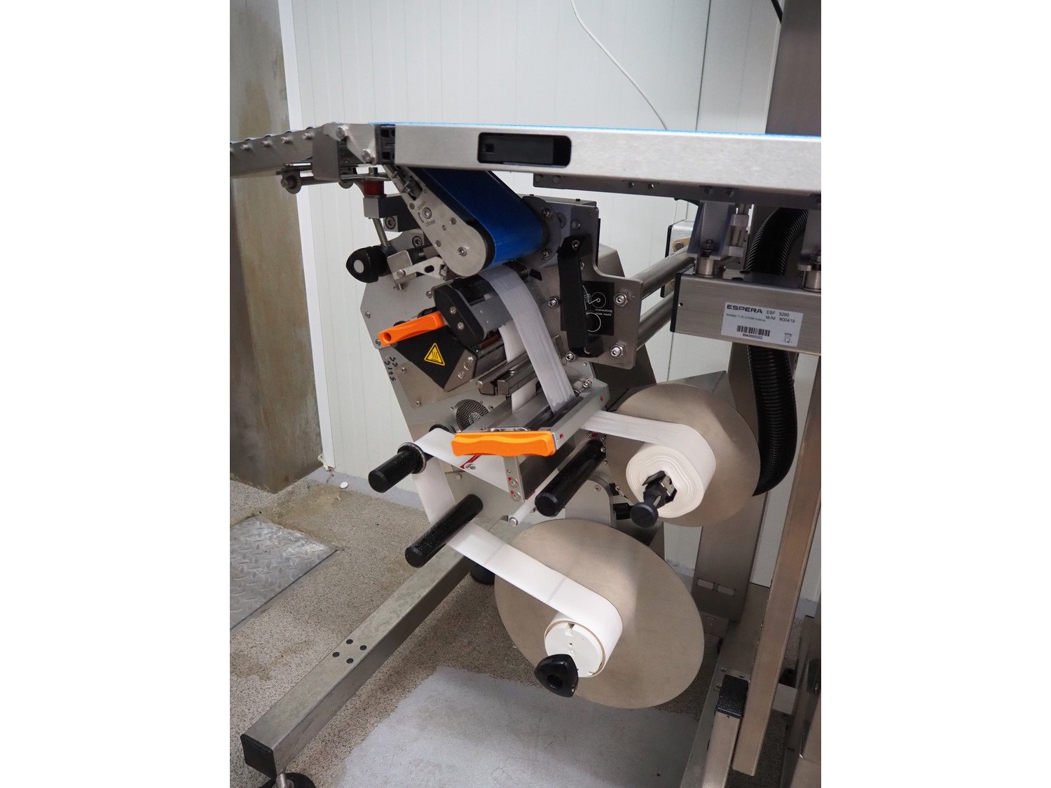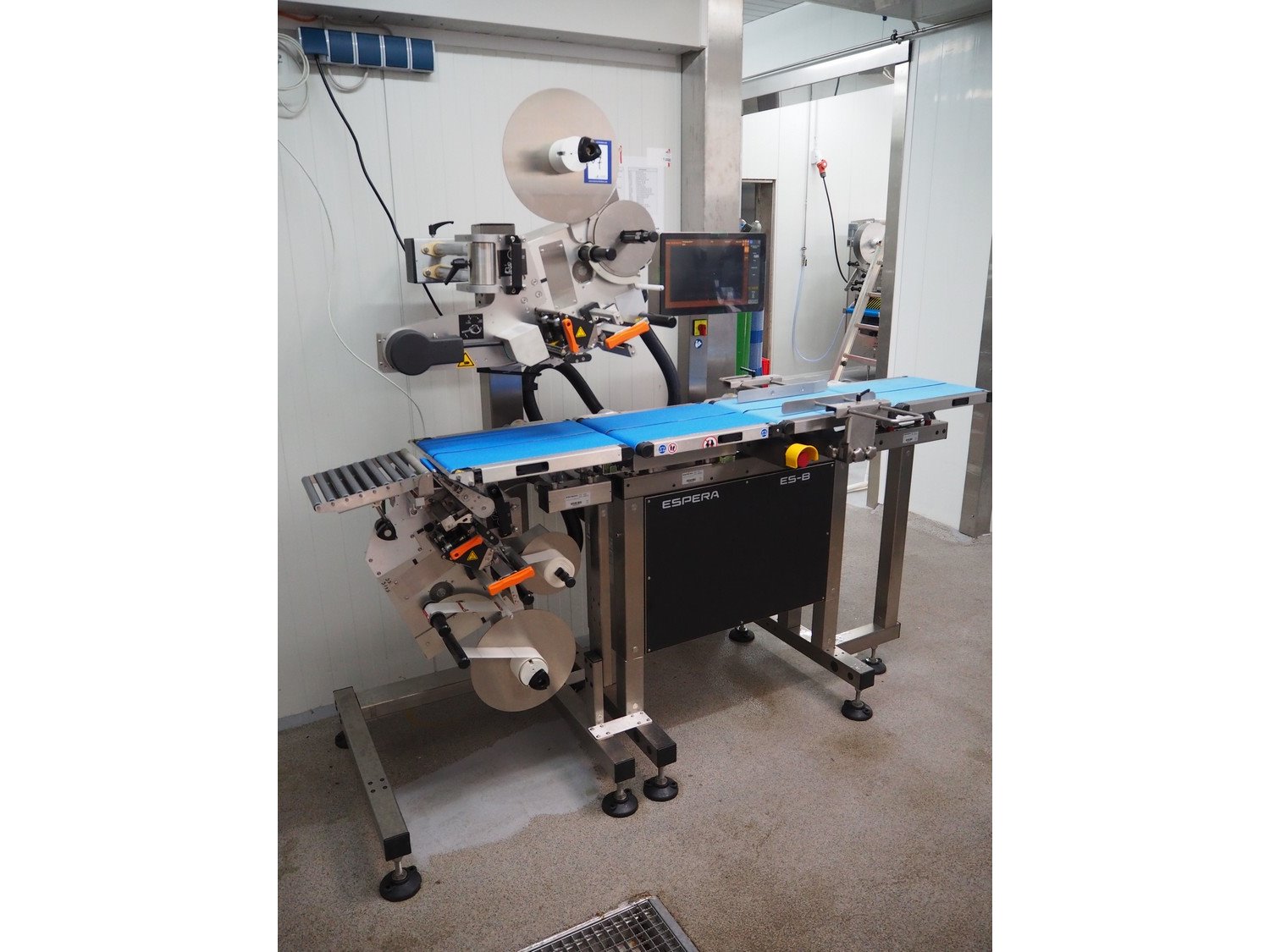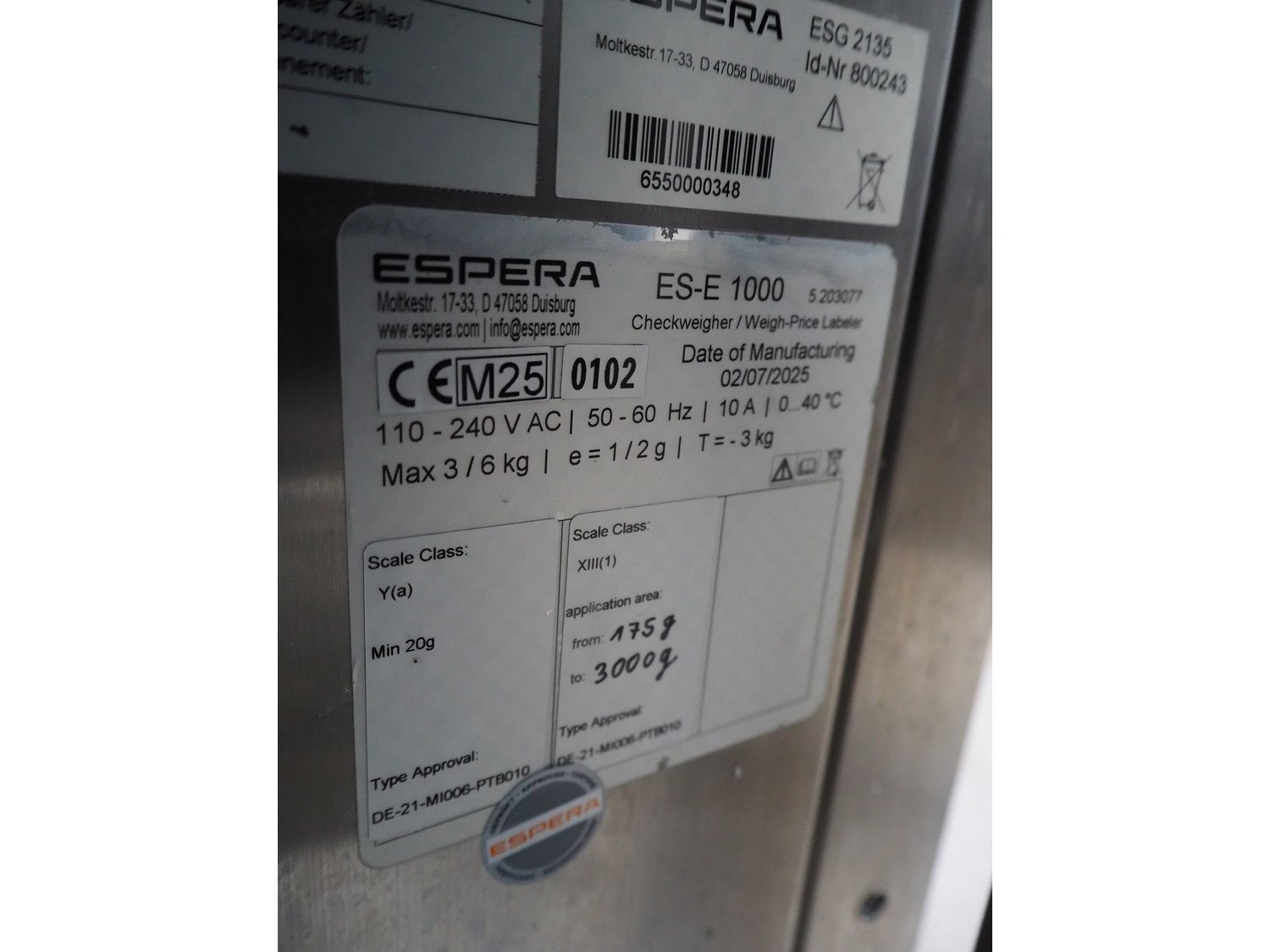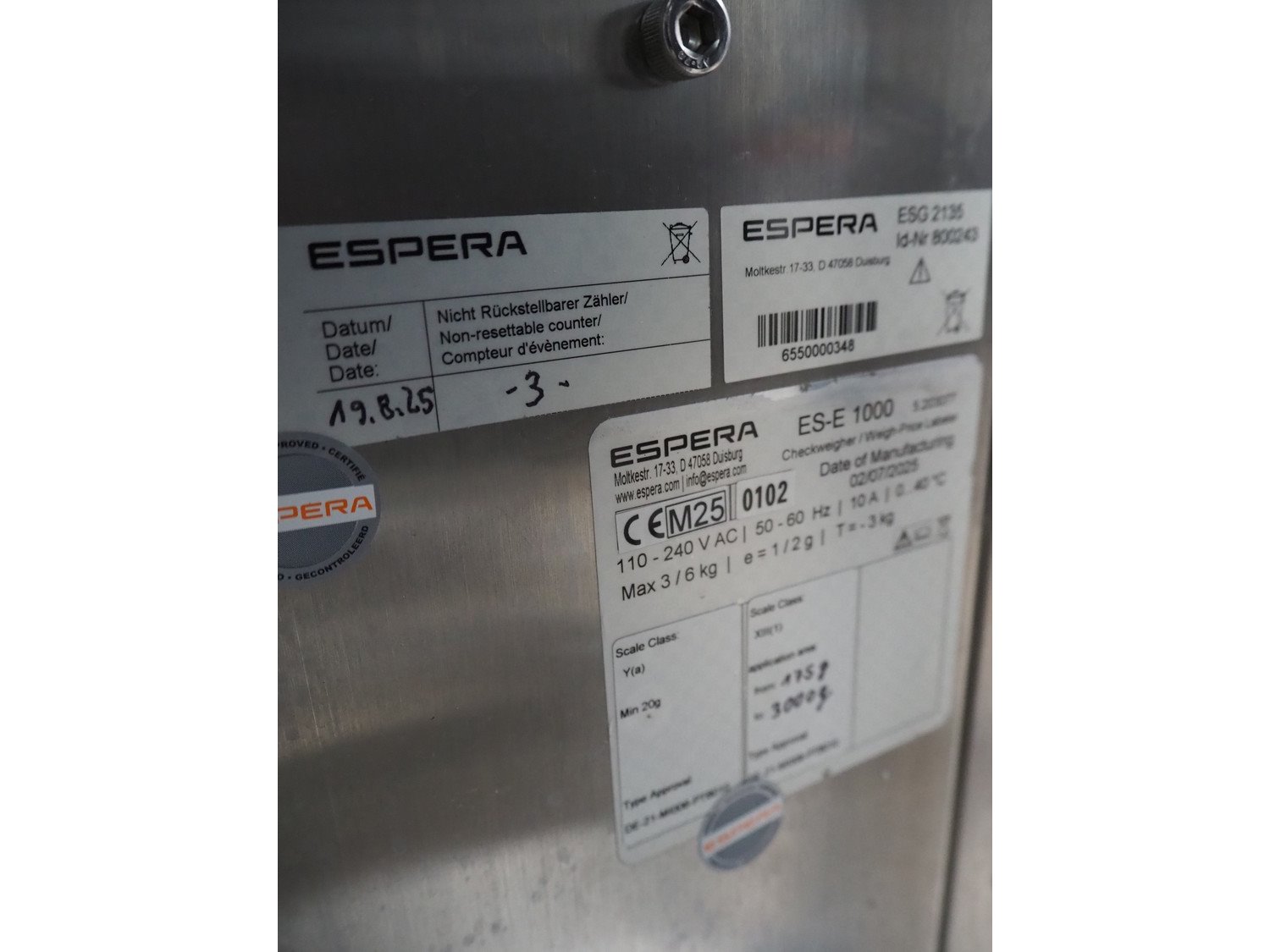 Espera weighing and labelling machine with bottom and top taper, model: ES-B, model checkweigher: ES-E 1000, year of construction: 2025, 110 - 240 V, 50 - 60 Hz, 10 A, maximum: 3 / 6 kg, e: 1/2 gram, plastic belt, belt width: (2x) 145 mm, total dimensions: 2100 mm x 900 mm x 1850 mm.
