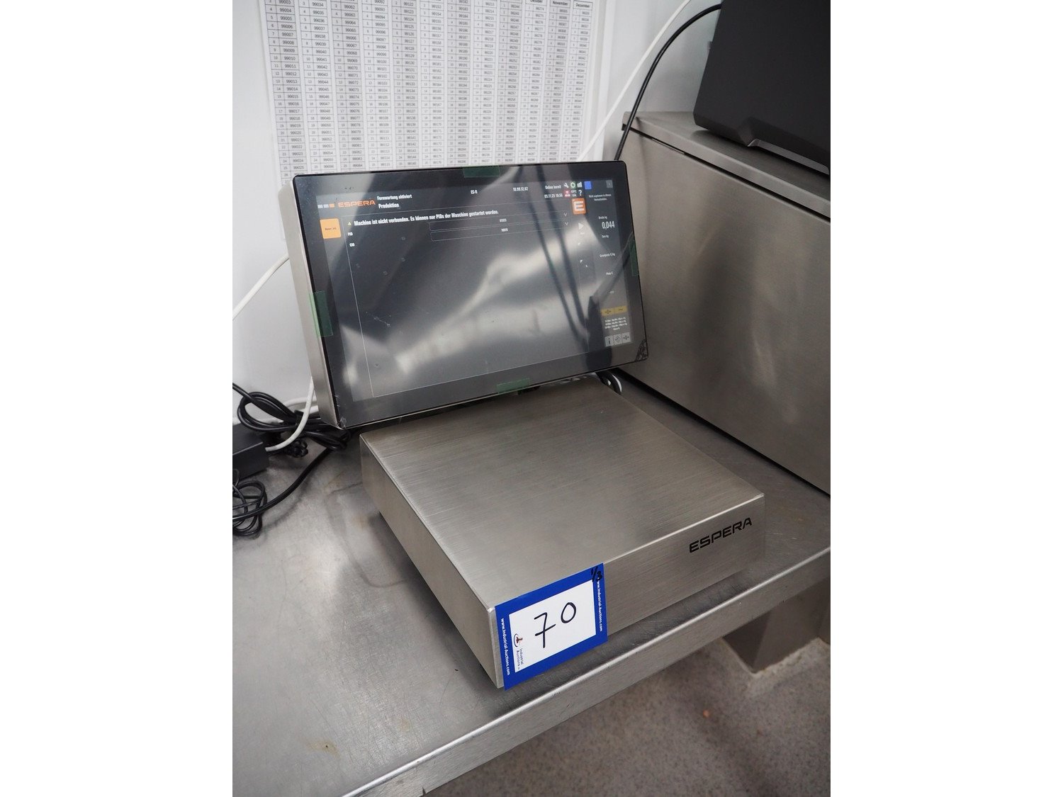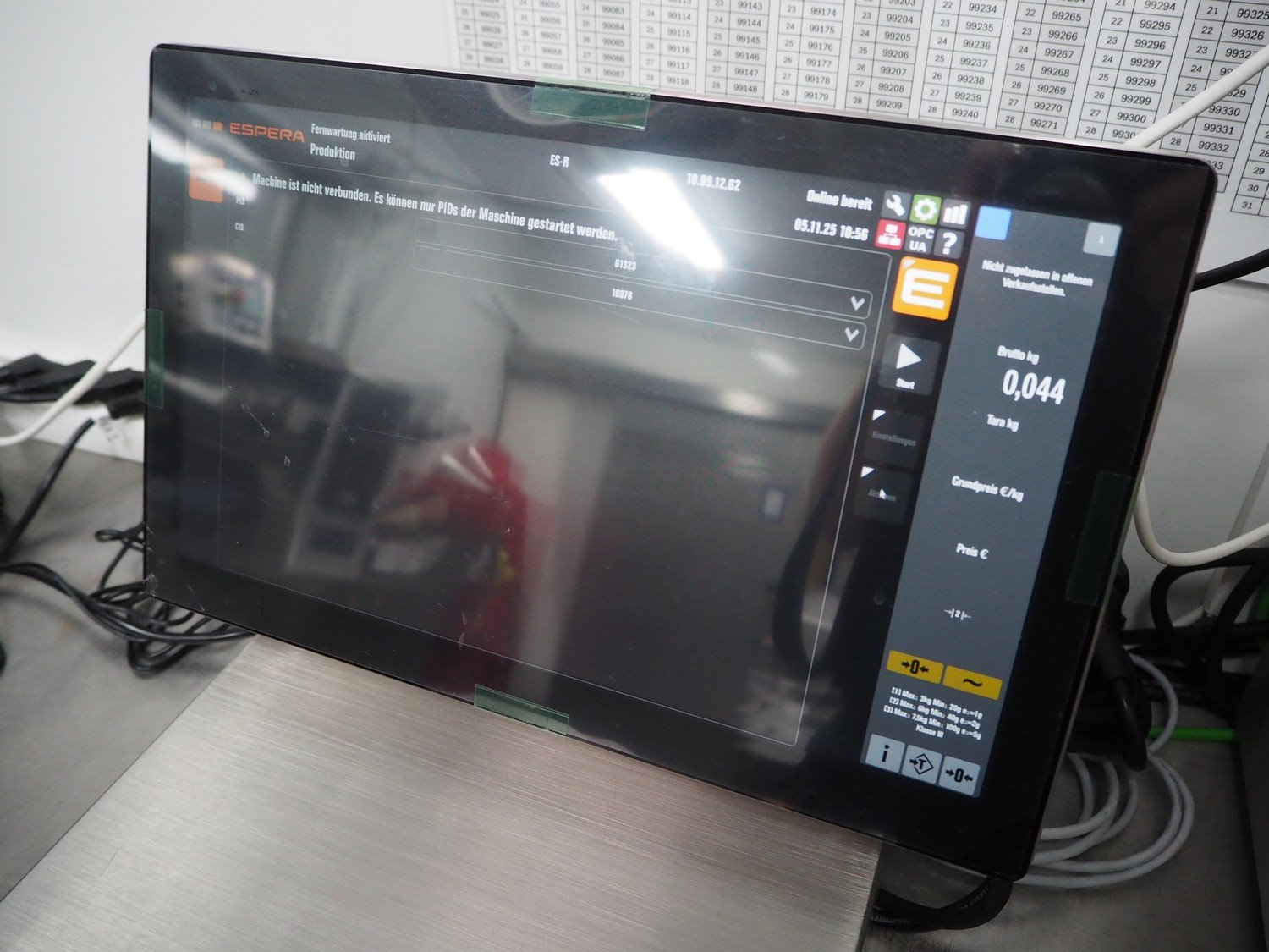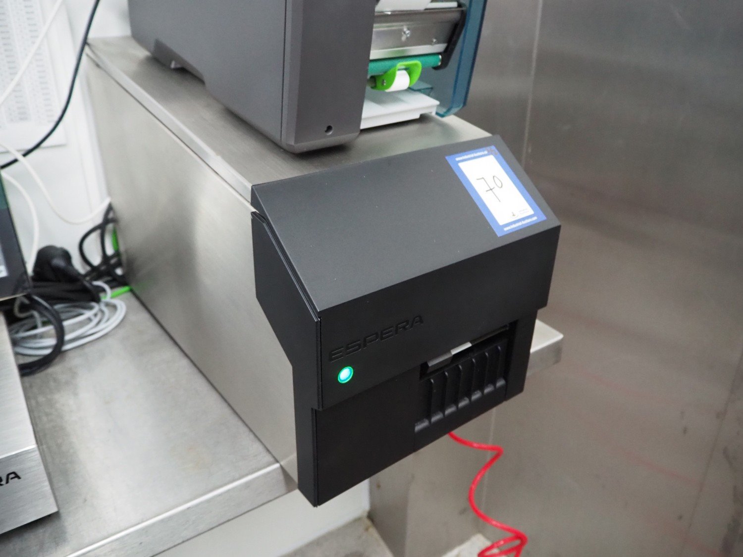 Espera weighing scale with label printer and control panel, model weighing scale: ES-M 1000, maximum: 3 / 6 / 7.5 kg, minimum: 20 gram / 40 gram / 100 gram, e = 1 gram / 2 gram / 5 gram, dimensions weighing scale: 300 mm x 300 mm x 90 mm, Espera label printer, model: ESD 3005, 95 - 255 V AC / 2 A / 50-60 Hz, dimensions label printer: 250 mm x 380 mm x 300 mm.