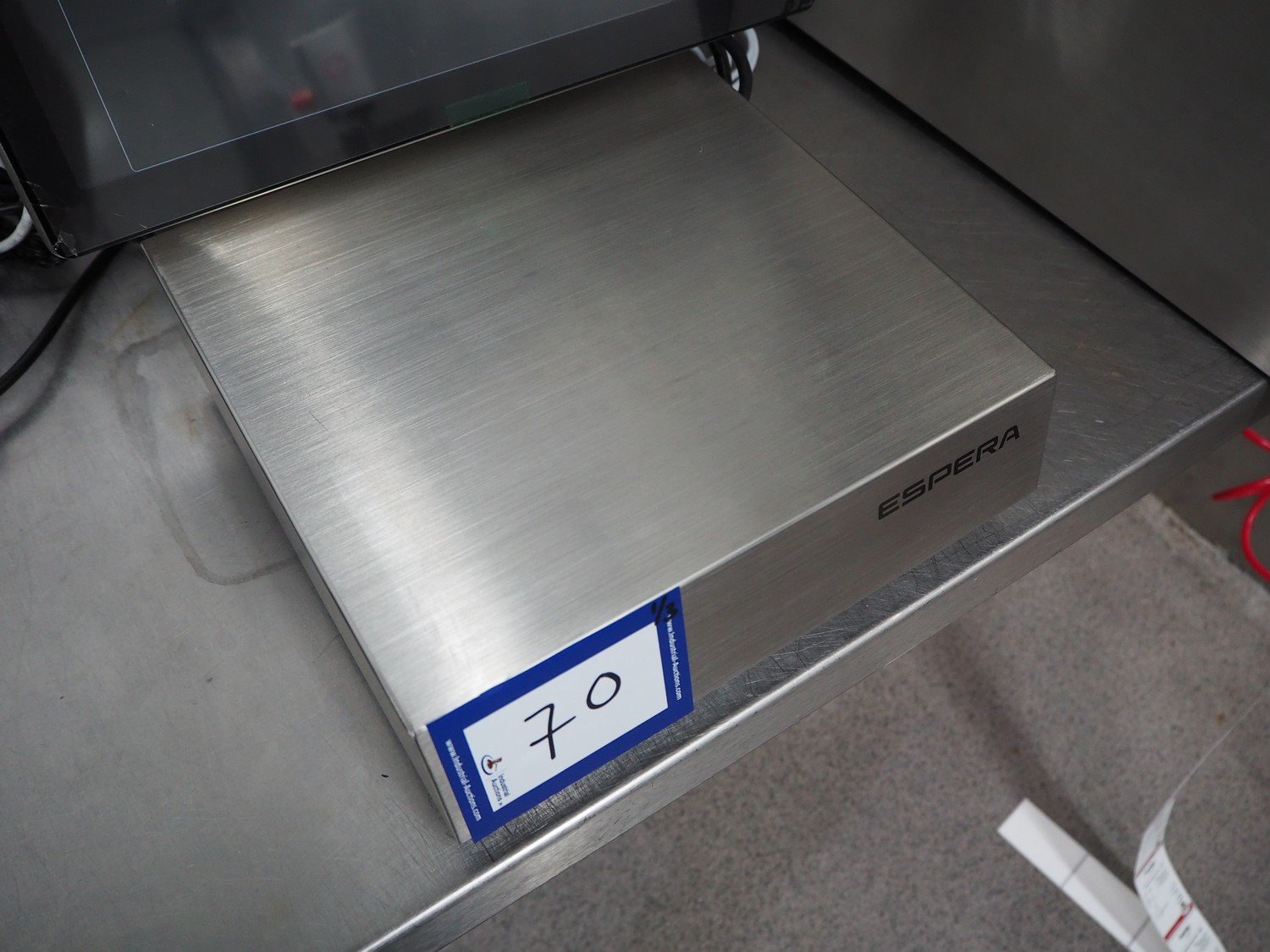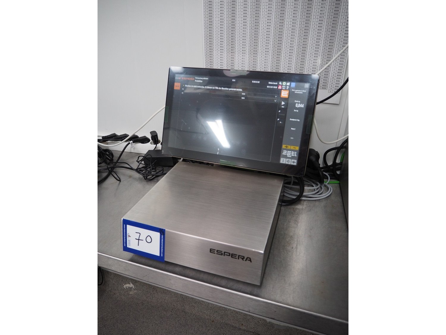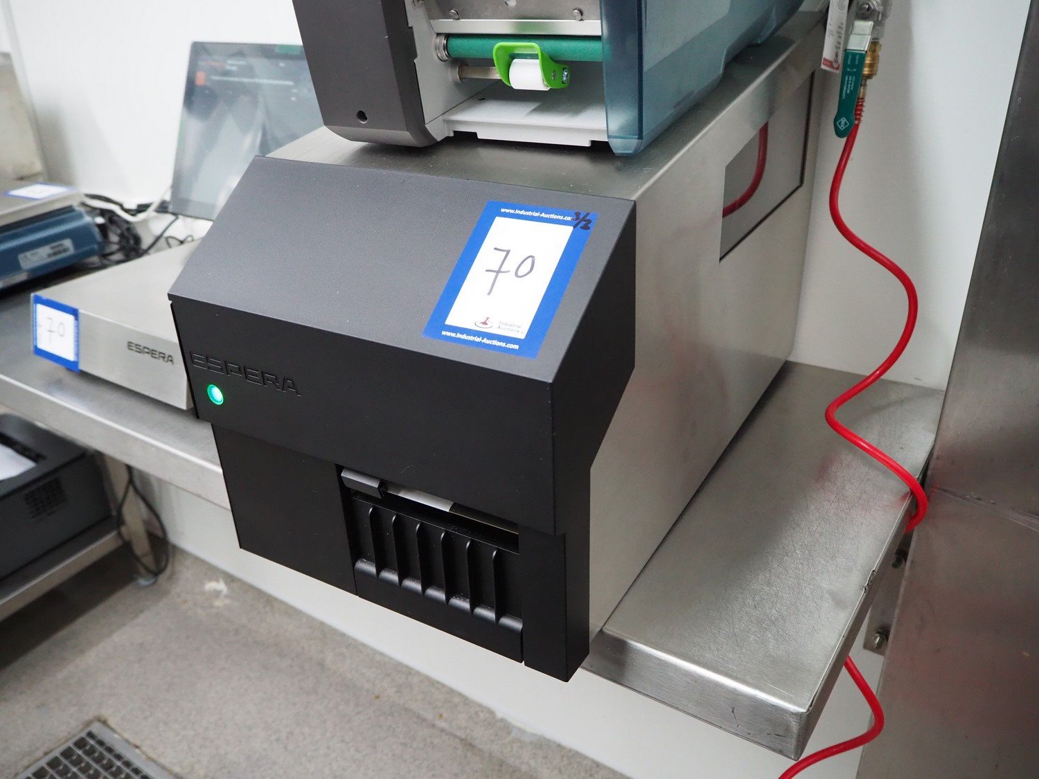 Espera weighing scale with label printer and control panel, model weighing scale: ES-M 1000, maximum: 3 / 6 / 7.5 kg, minimum: 20 gram / 40 gram / 100 gram, e = 1 gram / 2 gram / 5 gram, dimensions weighing scale: 300 mm x 300 mm x 90 mm, Espera label printer, model: ESD 3005, 95 - 255 V AC / 2 A / 50-60 Hz, dimensions label printer: 250 mm x 380 mm x 300 mm.