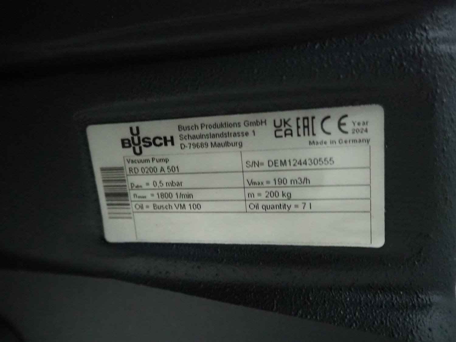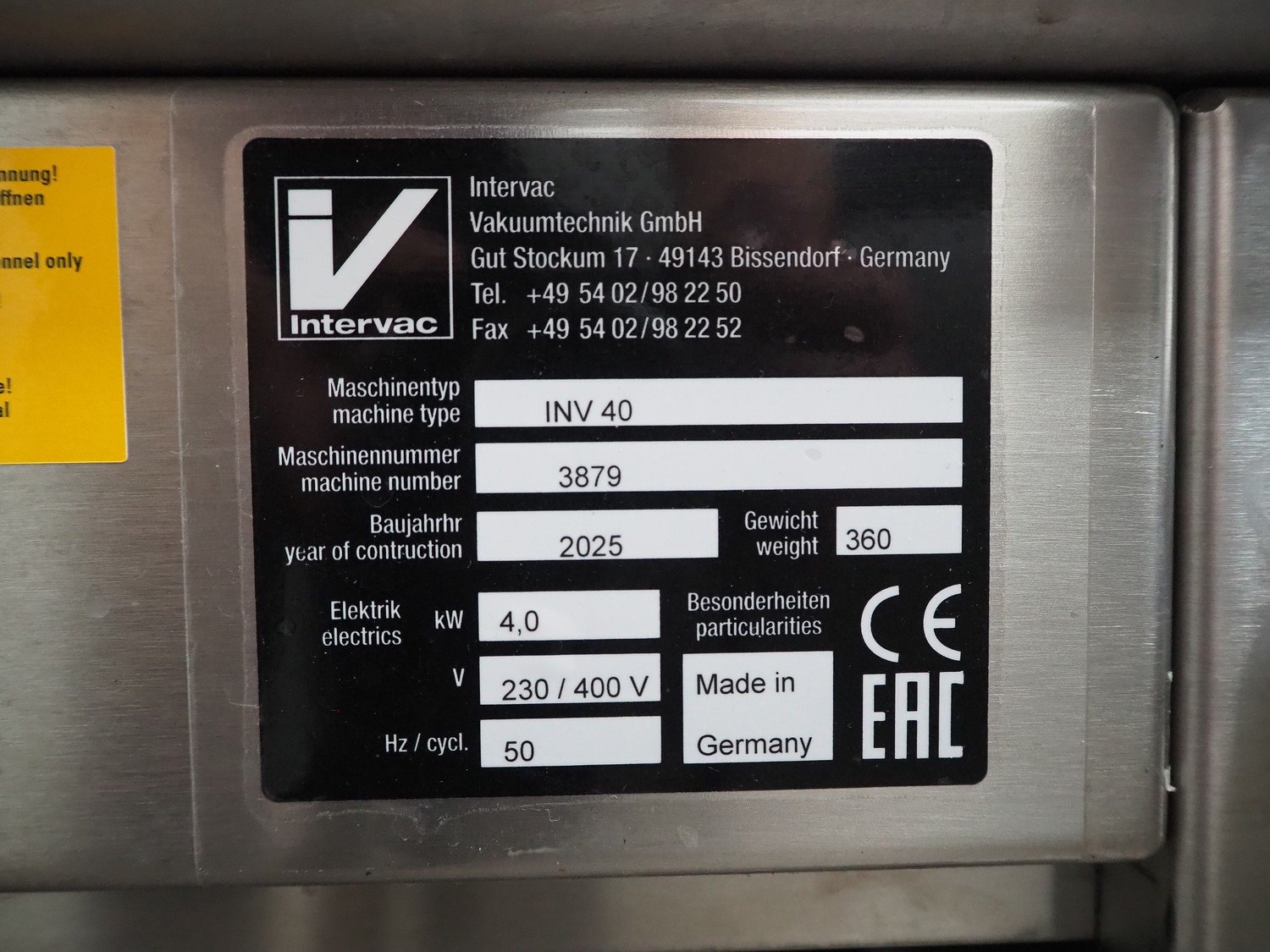 Intervac Vakuumtechnik GmbH mobile vacuum machine, machine type: INV 40, machine number: 3879, year of construction: 2025, 230 / 400 V, 50 Hz, 4.0 kW, weight: 360 kg, seal length: 840 mm / 640 mm, Busch vacuum pump, model: RD 0200 A 501, year of construction: 2024, capacity: 190 m³ per hour, total dimensions: 1000 mm x 1100 mm x 1250 mm.