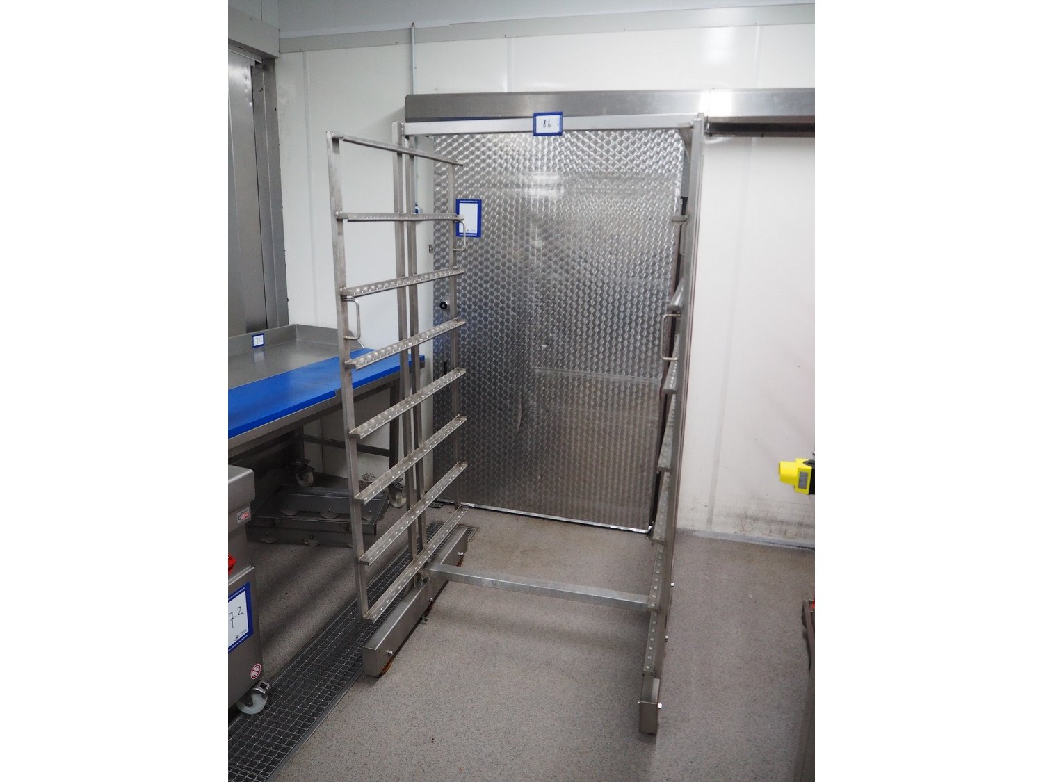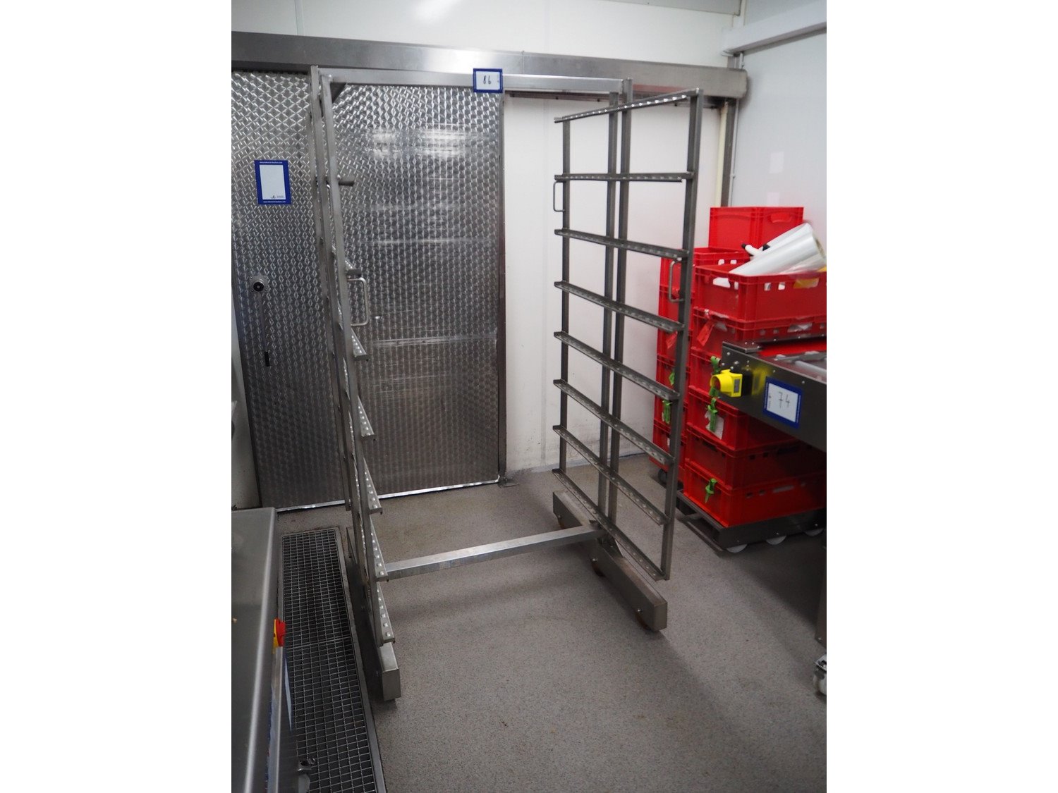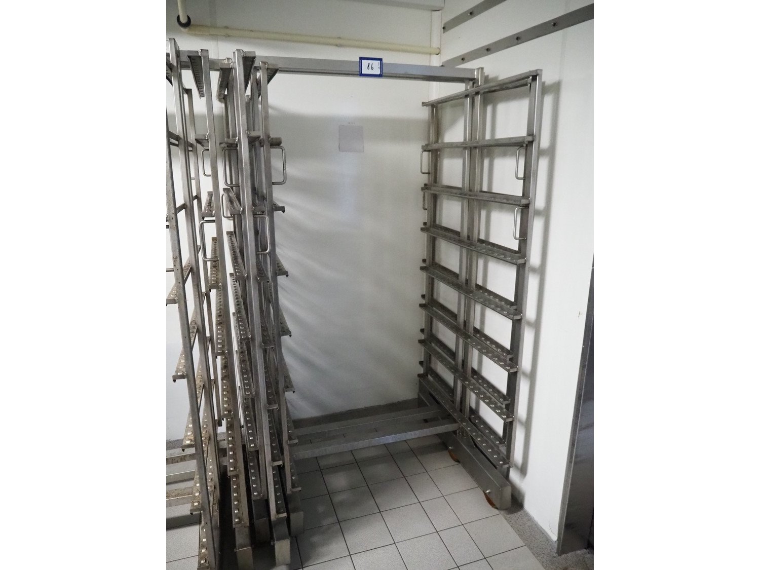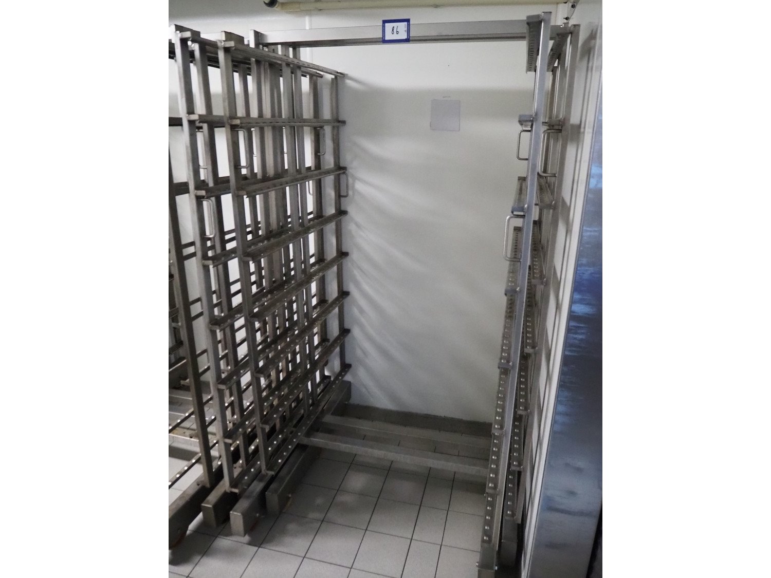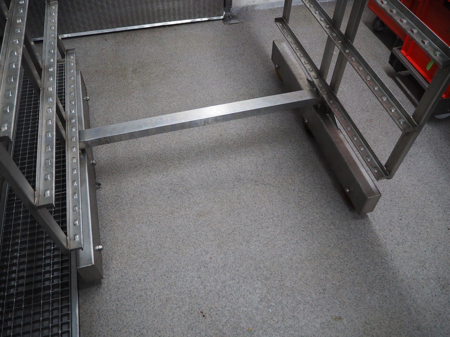 2 s/s smoke trolleys, 8 floors, dimensions floors: (8x) 930 mm x 980 mm, total dimensions: (2x) 1050 mm x 990 mm x 1980 mm.