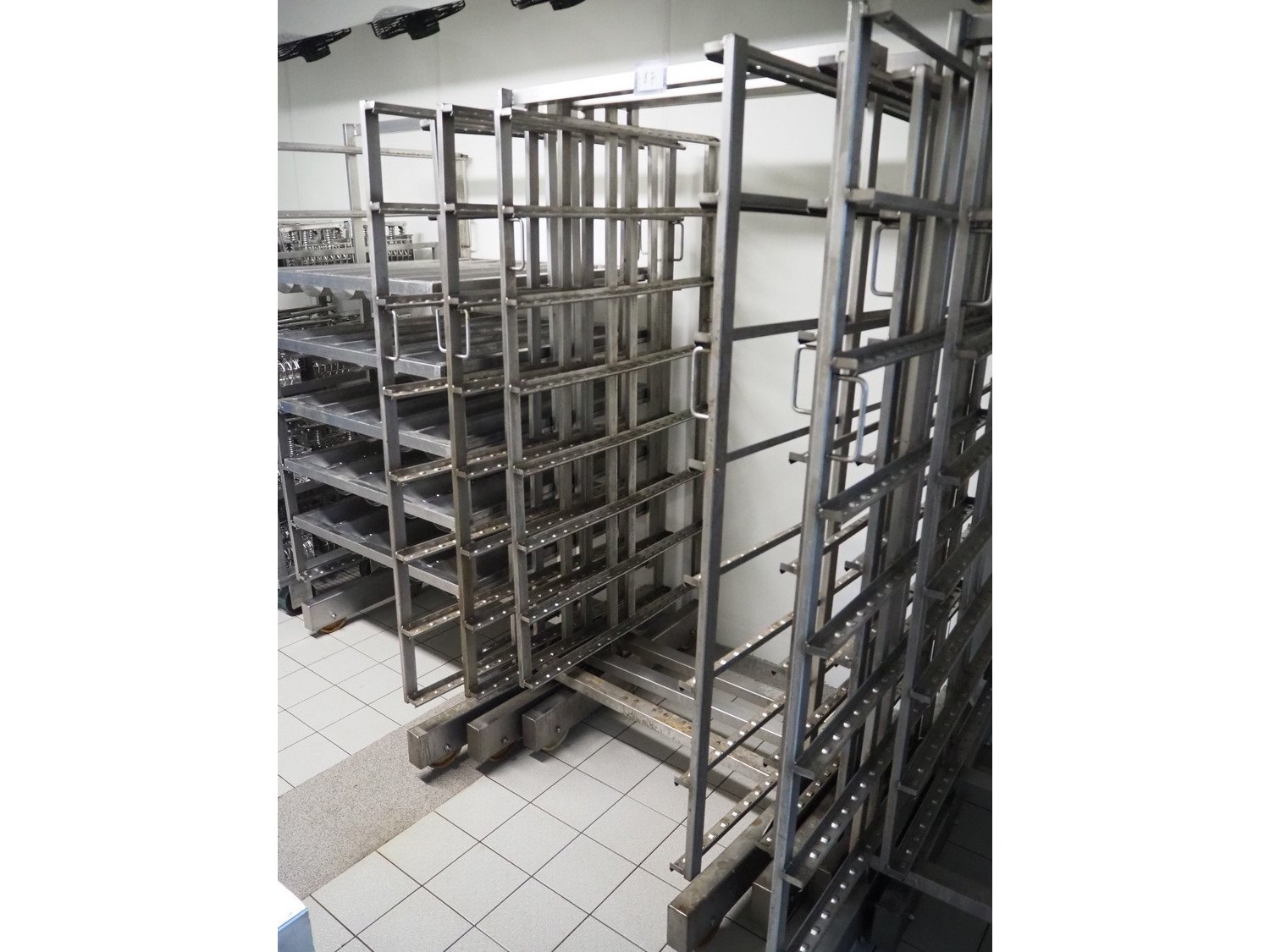 3 s/s smoke trolleys, 8 floors, dimensions floors: (8x) 930 mm x 980 mm, total dimensions: (3x) 1050 mm x 990 mm x 1980 mm.