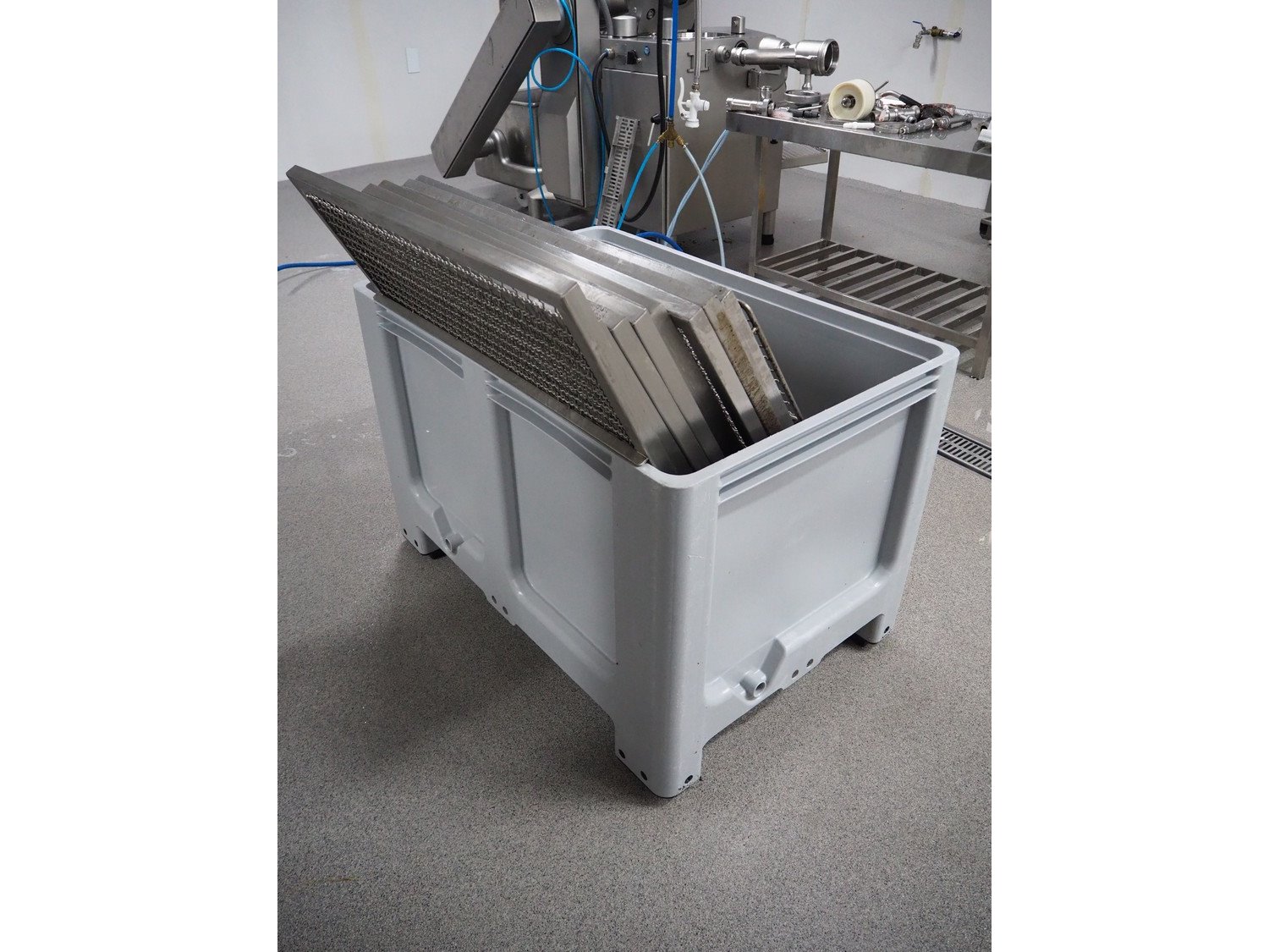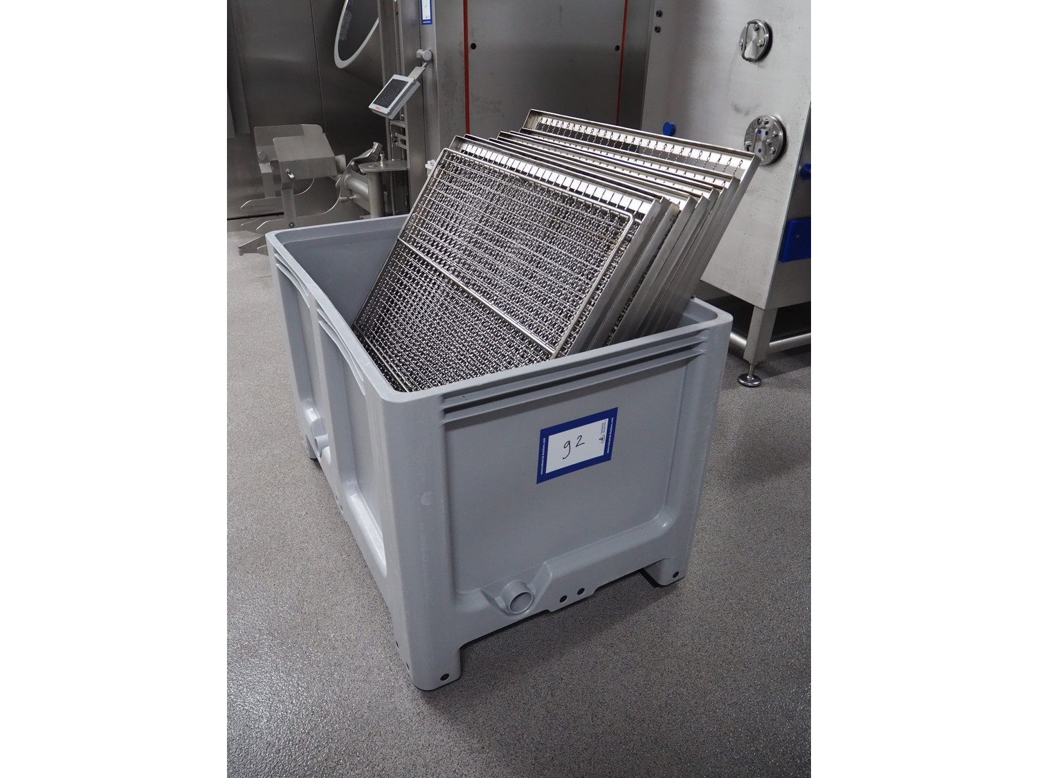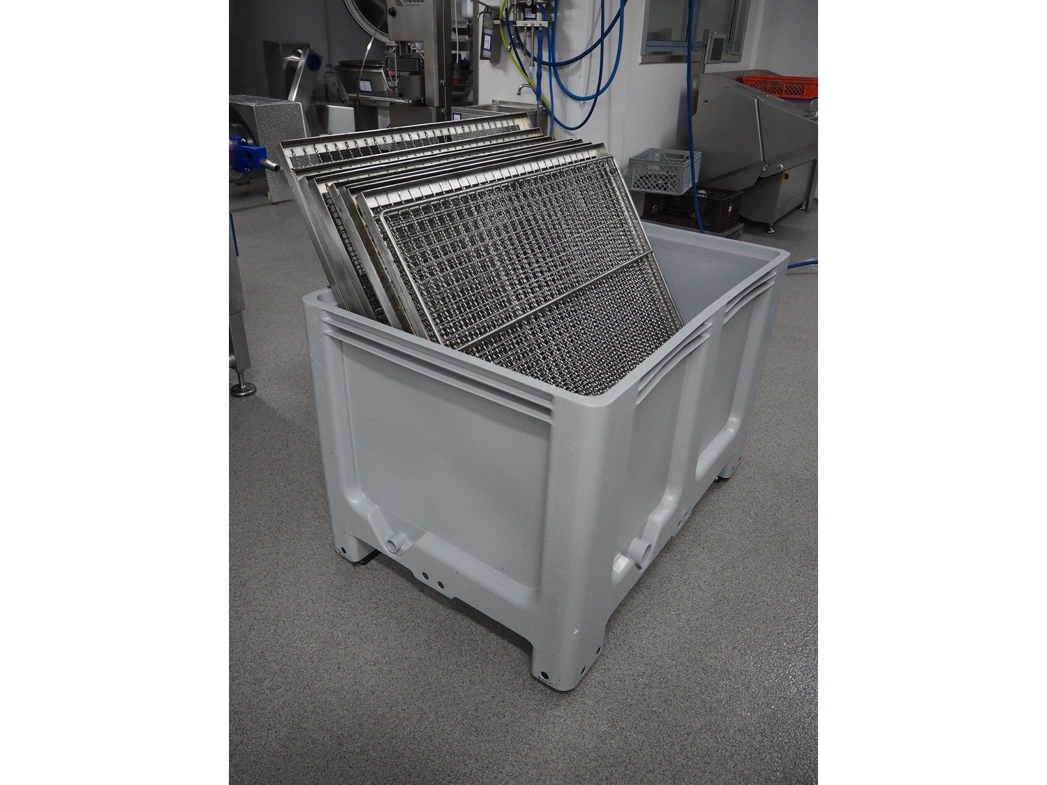 Plastic pallet box with 10 s/s cooking plates, dimensions cooking plates: (10x) 1000 mm x 1000 mm, dimensions plastic pallet box: 1200 mm x 800 mm x 800 mm.