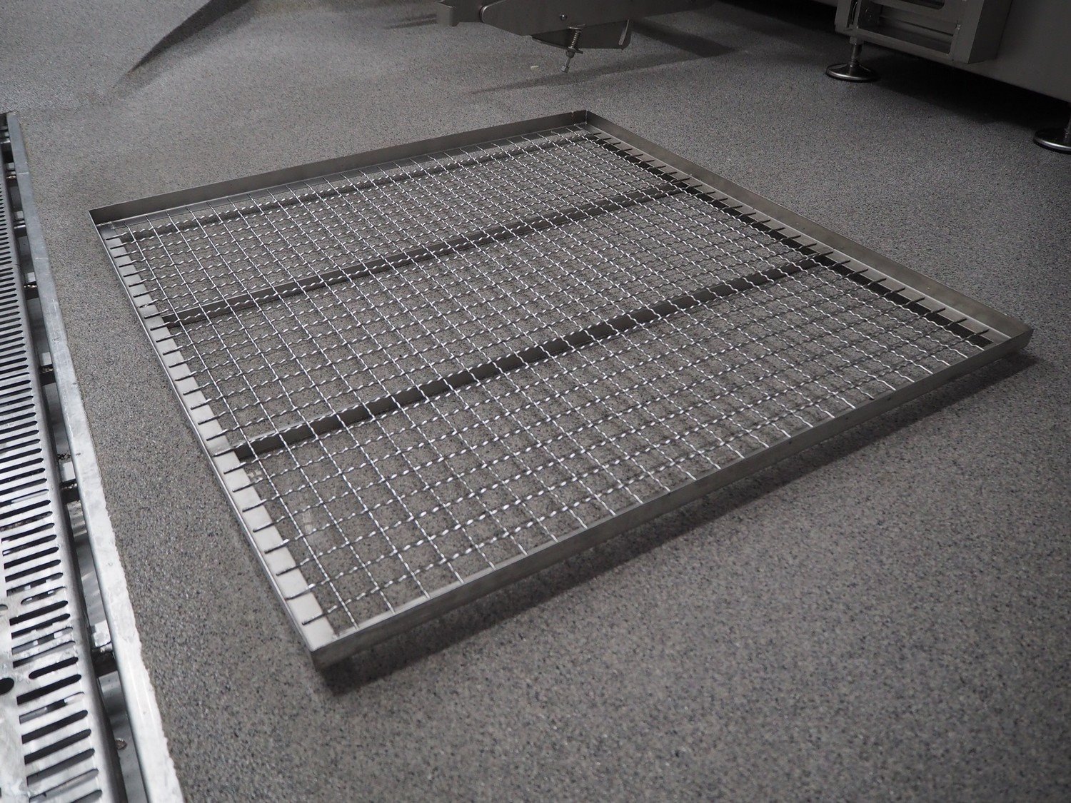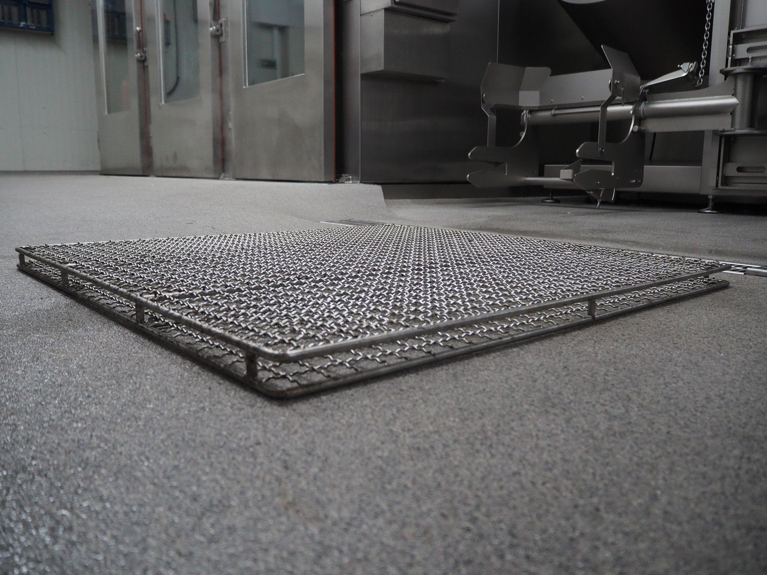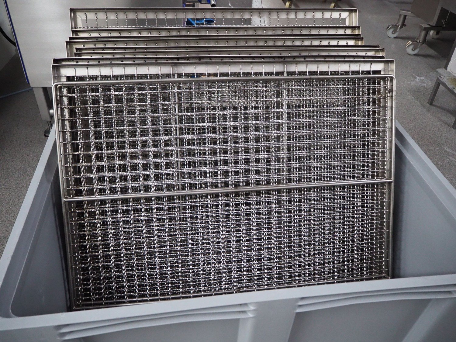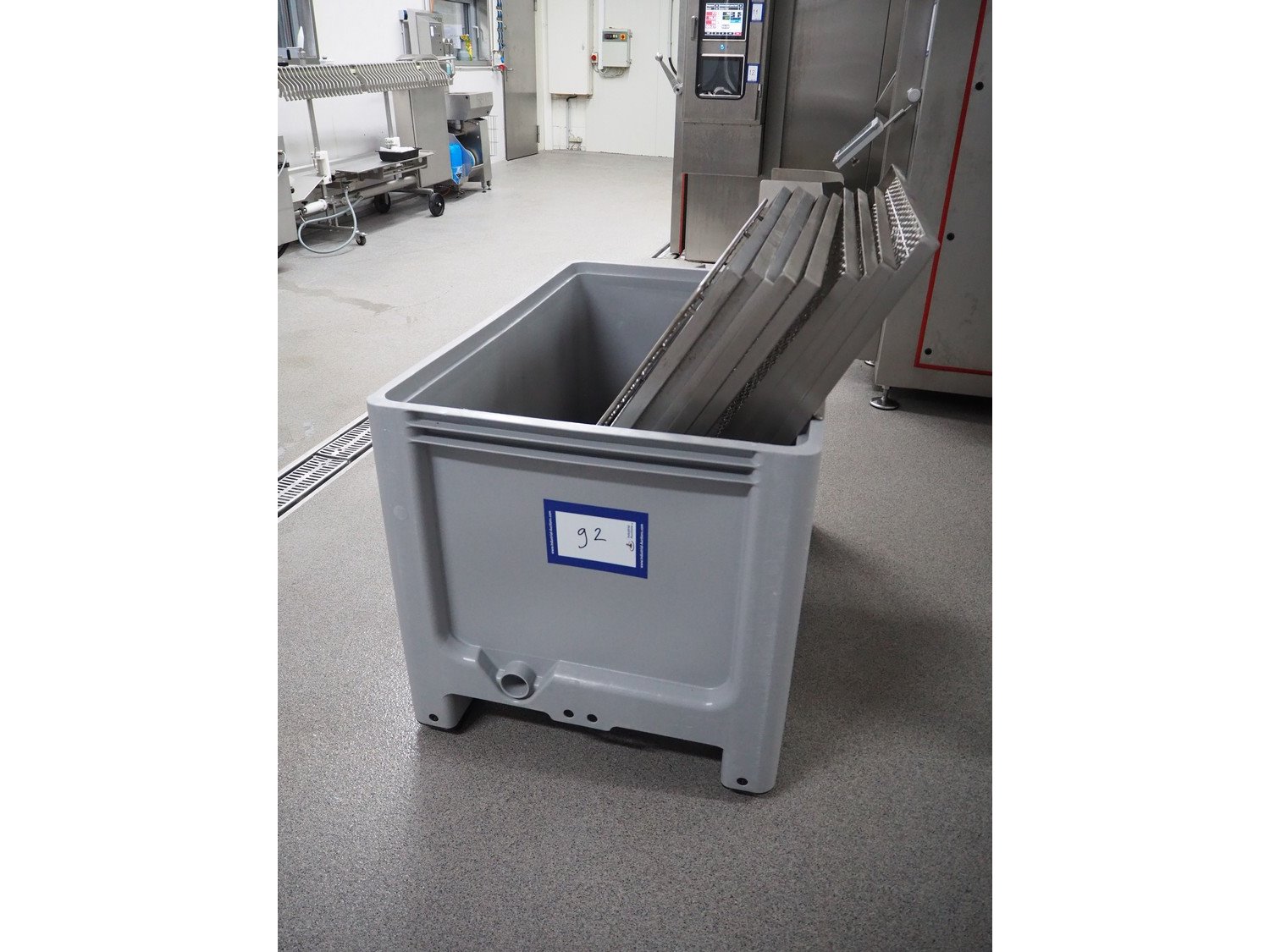 Plastic pallet box with 10 s/s cooking plates, dimensions cooking plates: (10x) 1000 mm x 1000 mm, dimensions plastic pallet box: 1200 mm x 800 mm x 800 mm.
