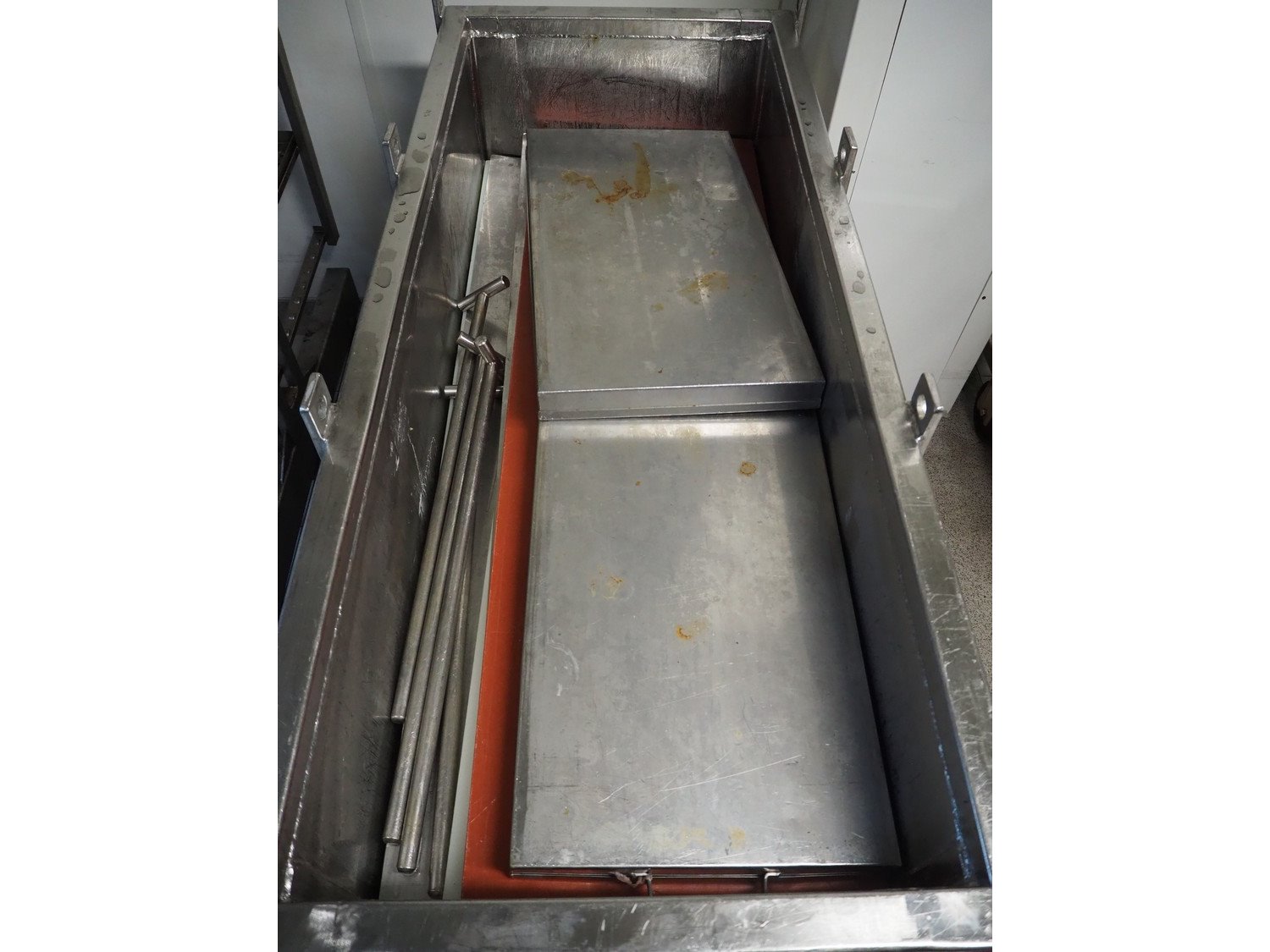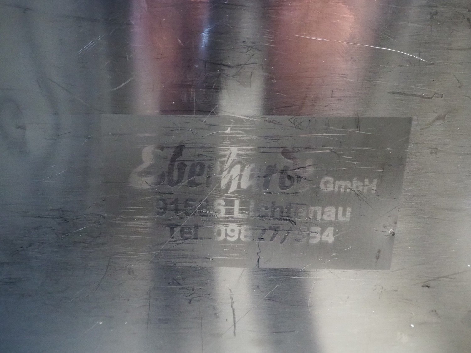 Eberhardt GmbH mobile ham press, inside dimensions: 1300 mm x 510 mm, total dimensions: 1550 mm x 620 mm x 930 mm. Including various s/s and plastic plates.