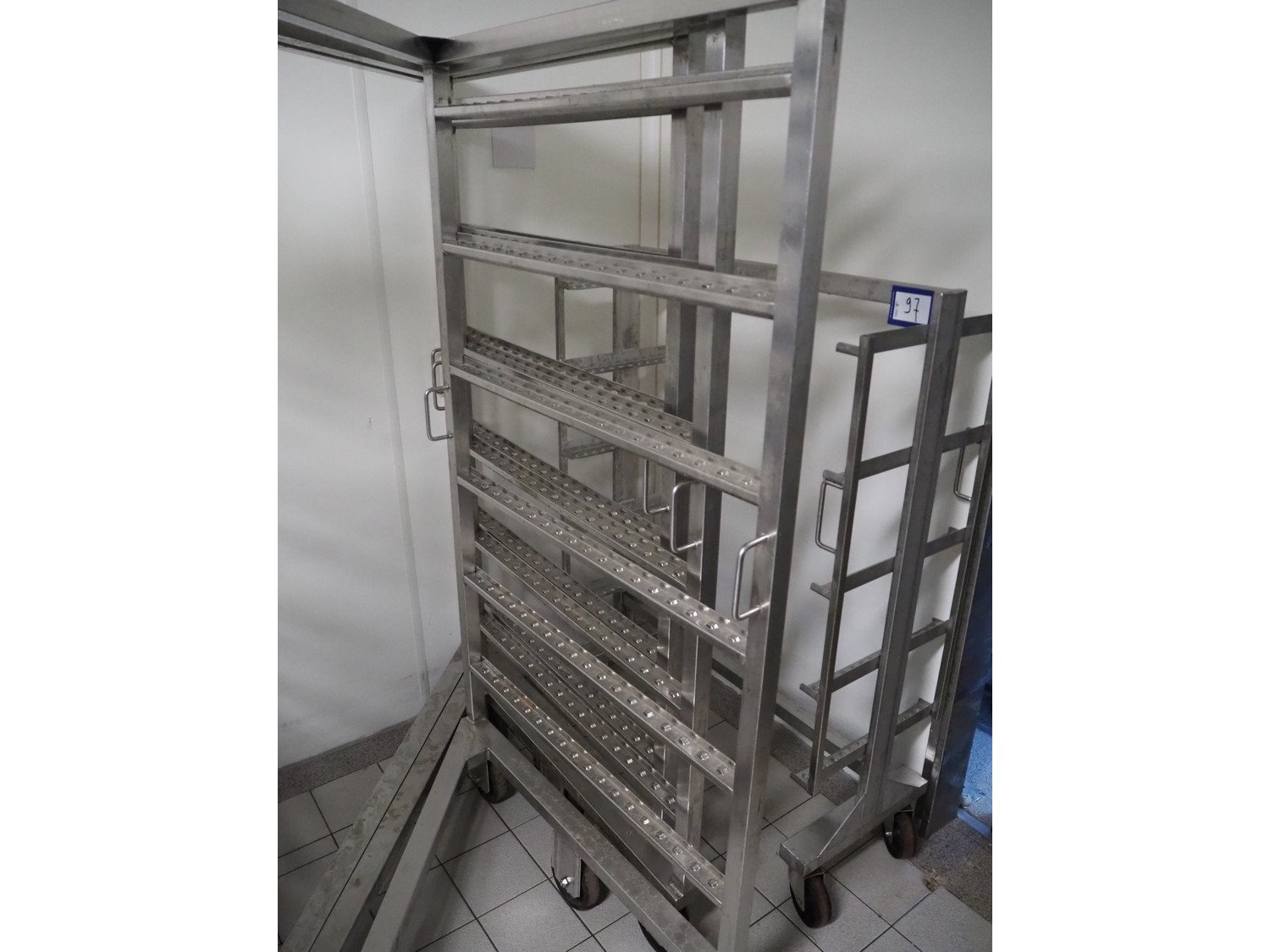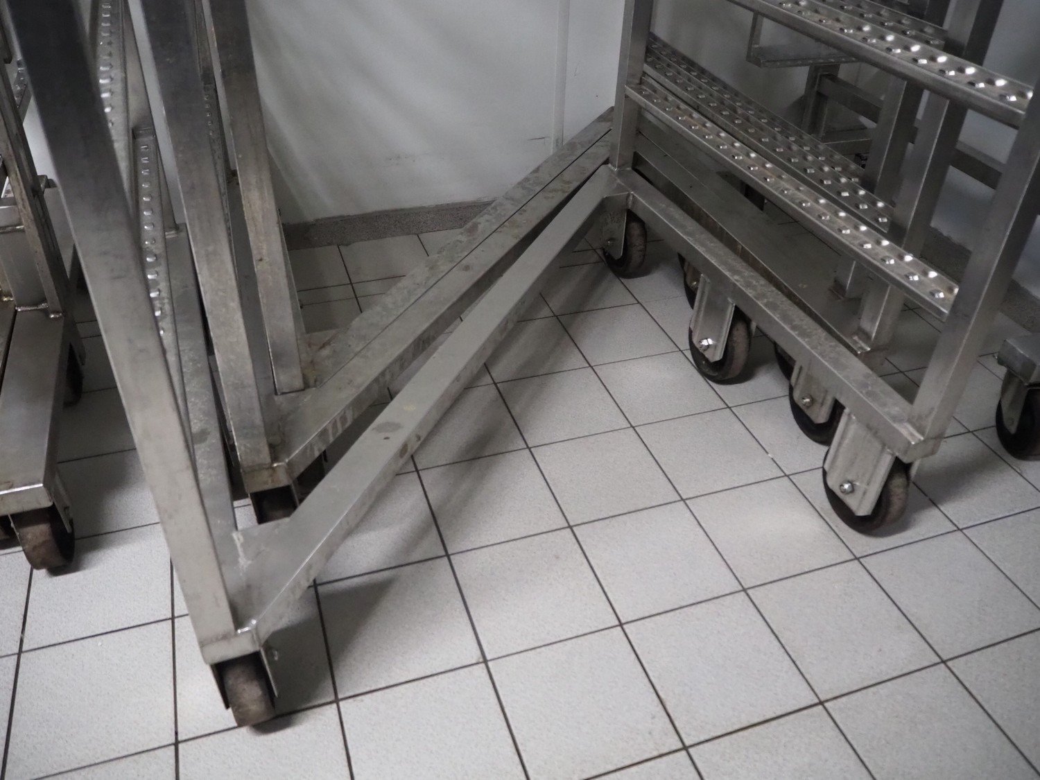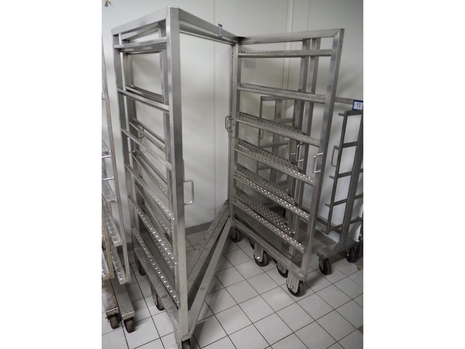 3 s/s smoke trolleys, Z-model, 6 floors, dimensions floors: (6x) 1000 mm x 940 mm, total dimensions: (3x) 1020 mm x 1020 mm x 1900 mm.