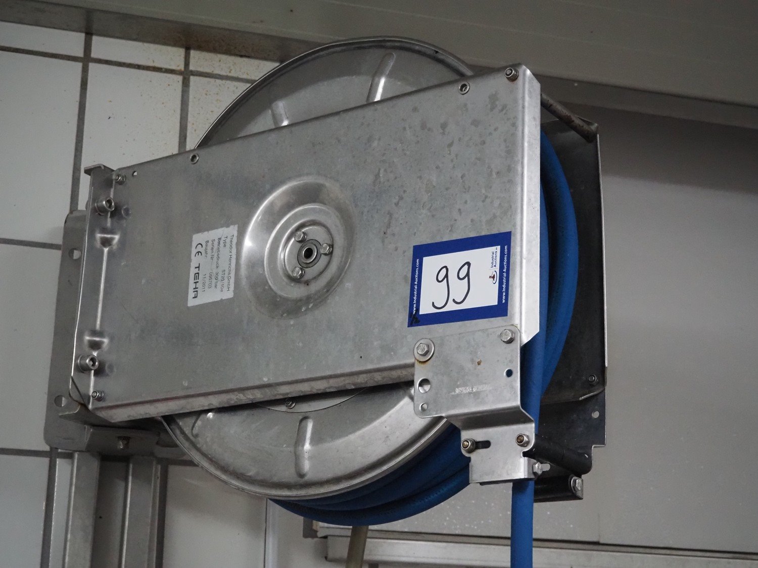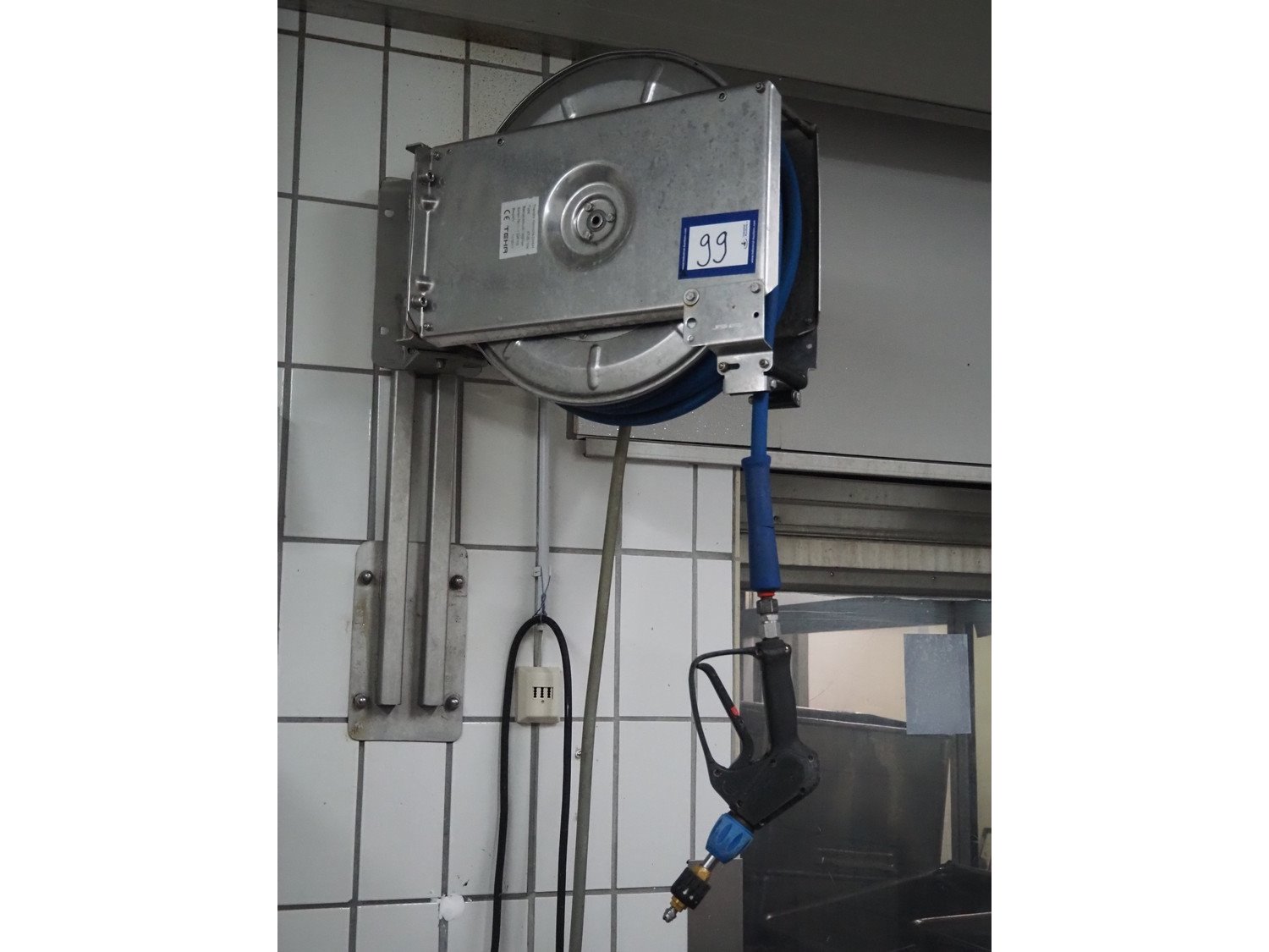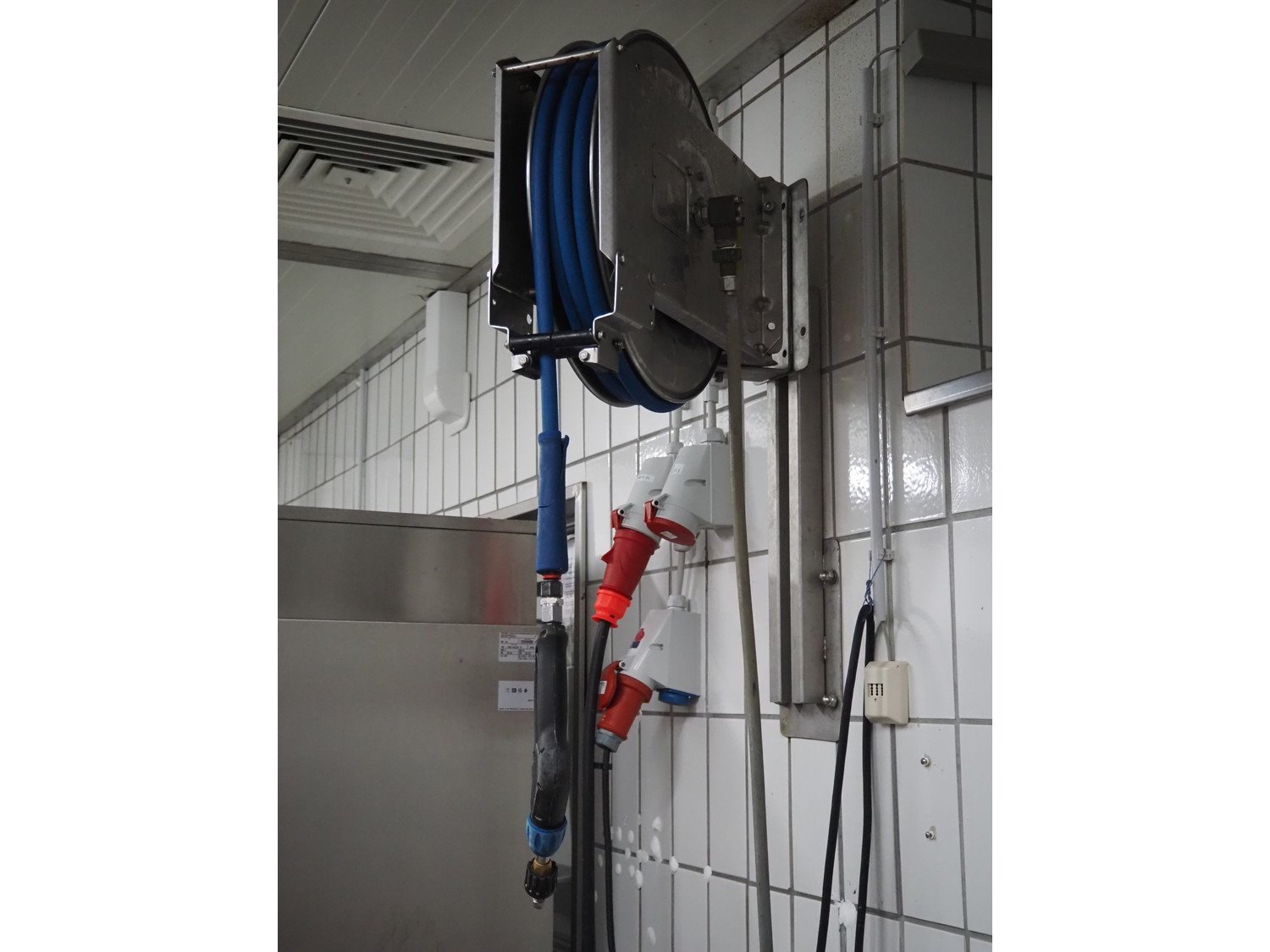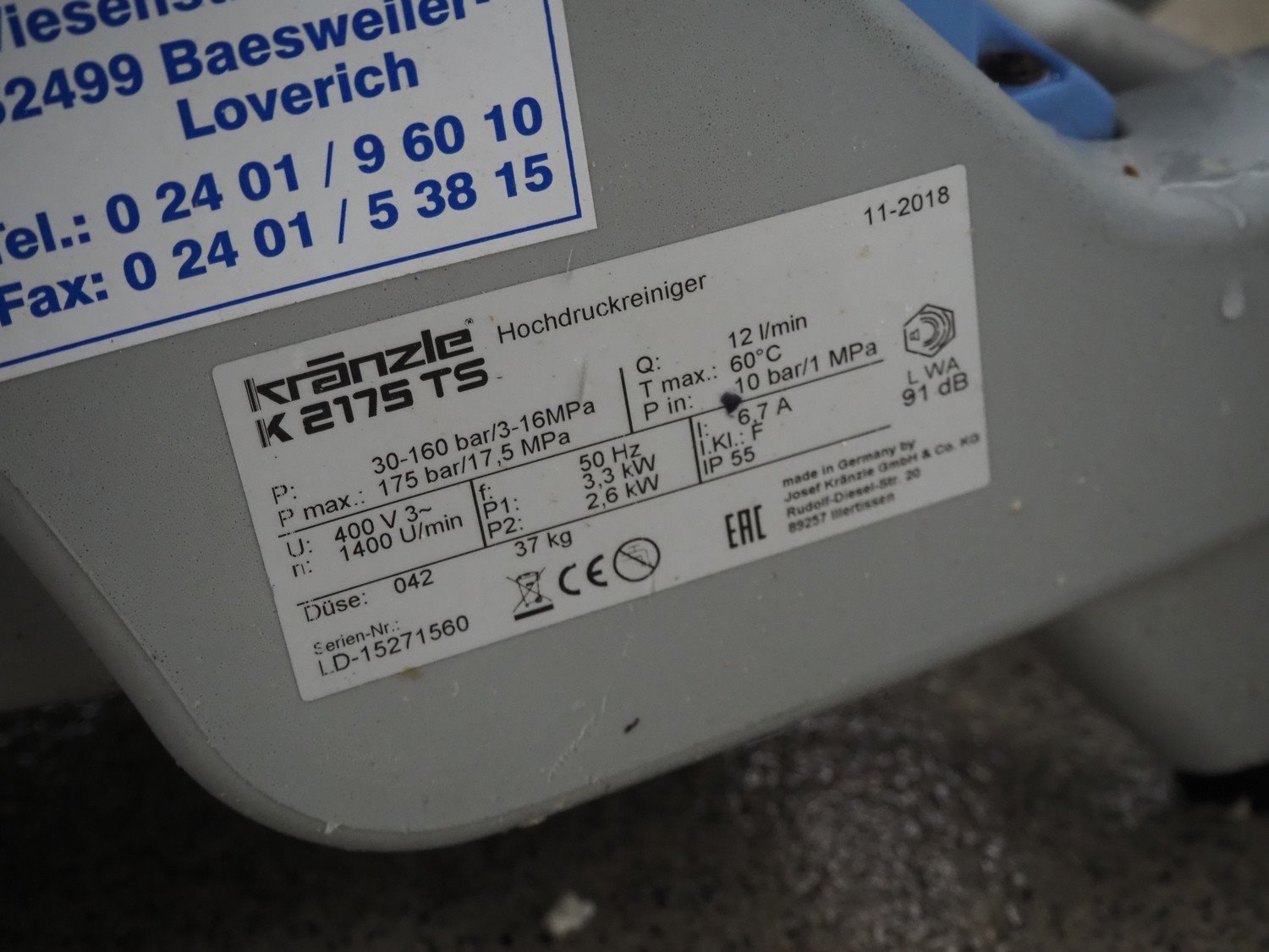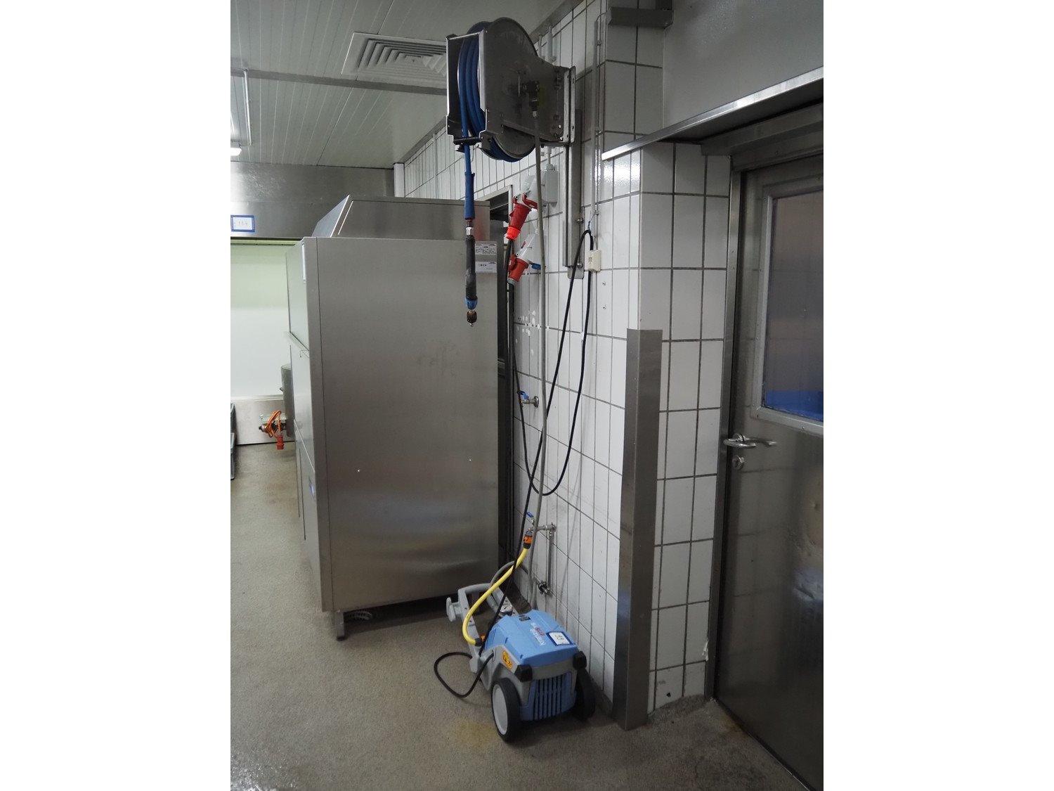 High pressure cleaning installation consisting of Kränzle high pressure cleaner, model: K 2175 TS, year of construction: 2018, capacity: 12 liter per minute, dimensions: 900 mm x 350 mm x 400 mm, Theodor Henrichs GmbH s/s hose reel with hose and spraying gun, type: ST20/10e, serial number: 095703, year of construction: 2011, working pressure: 300 bar, dimensions: 500 mm x 250 mm x 500 mm.