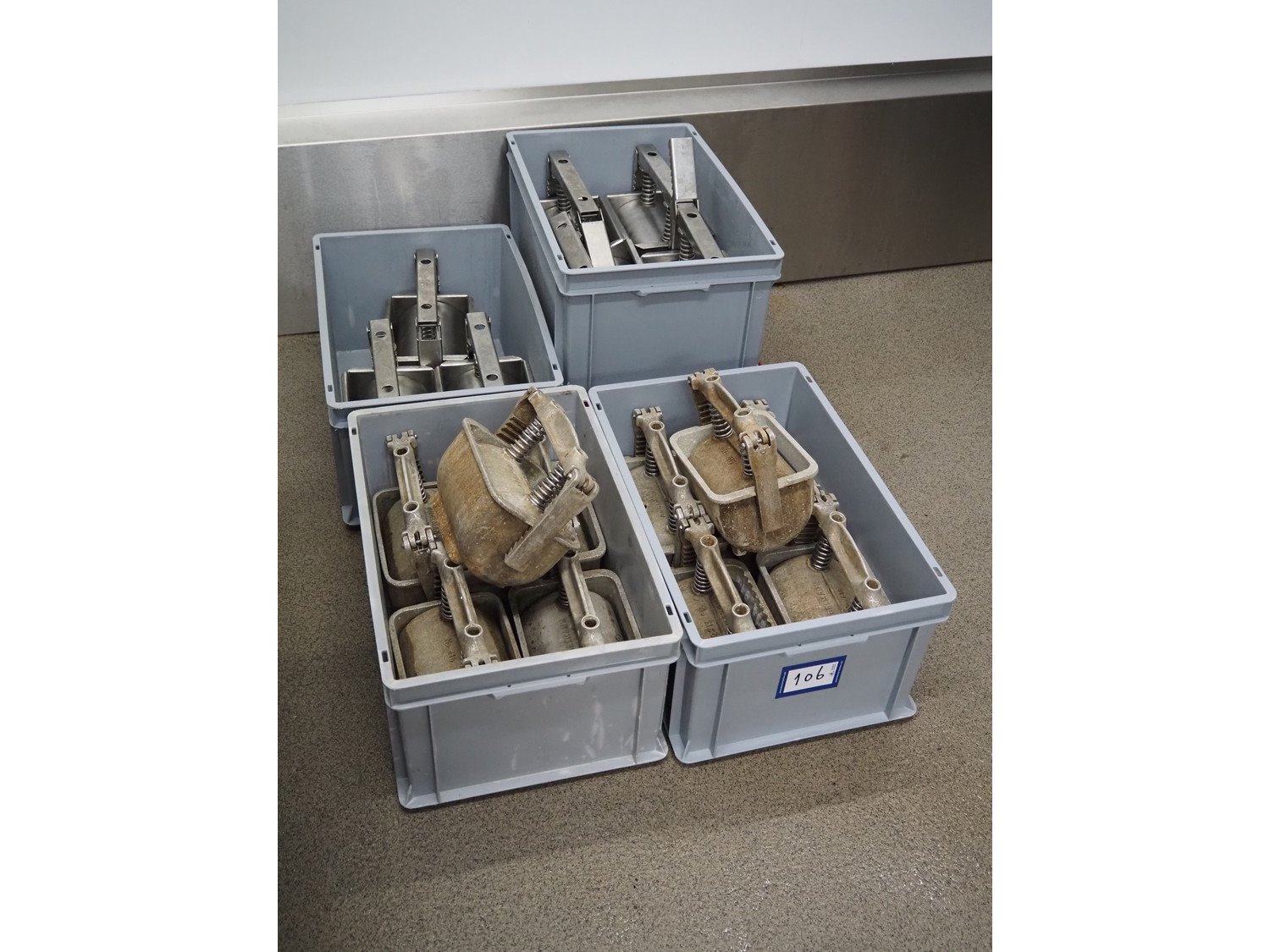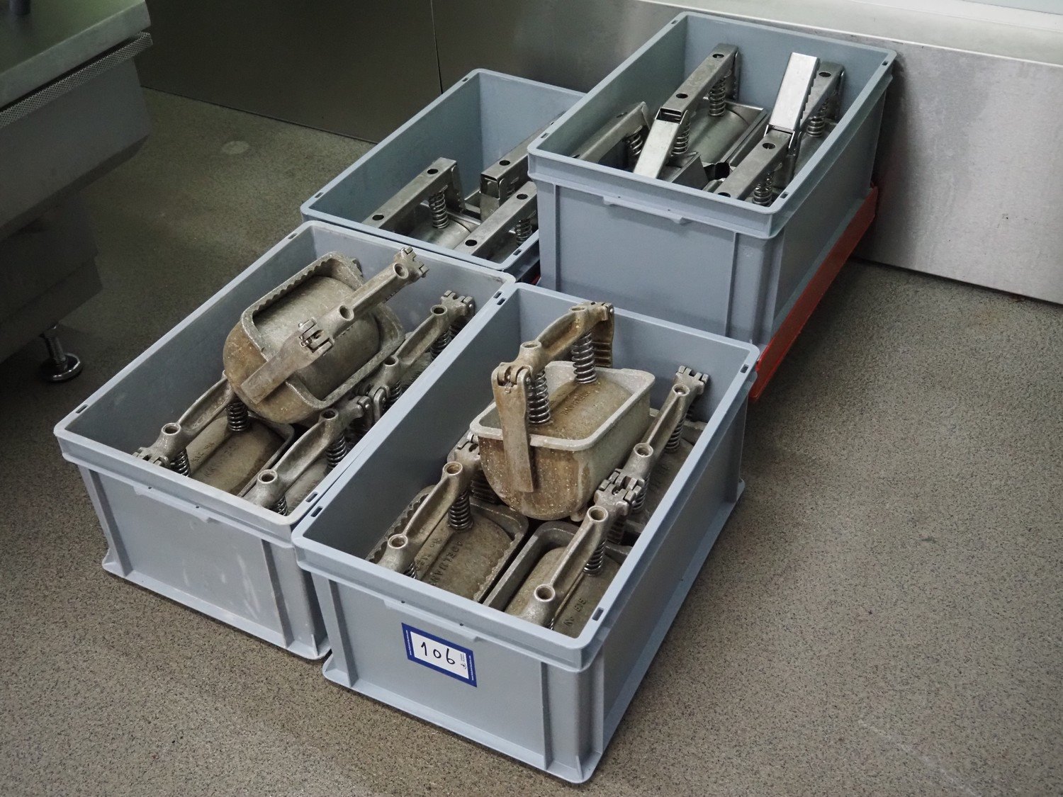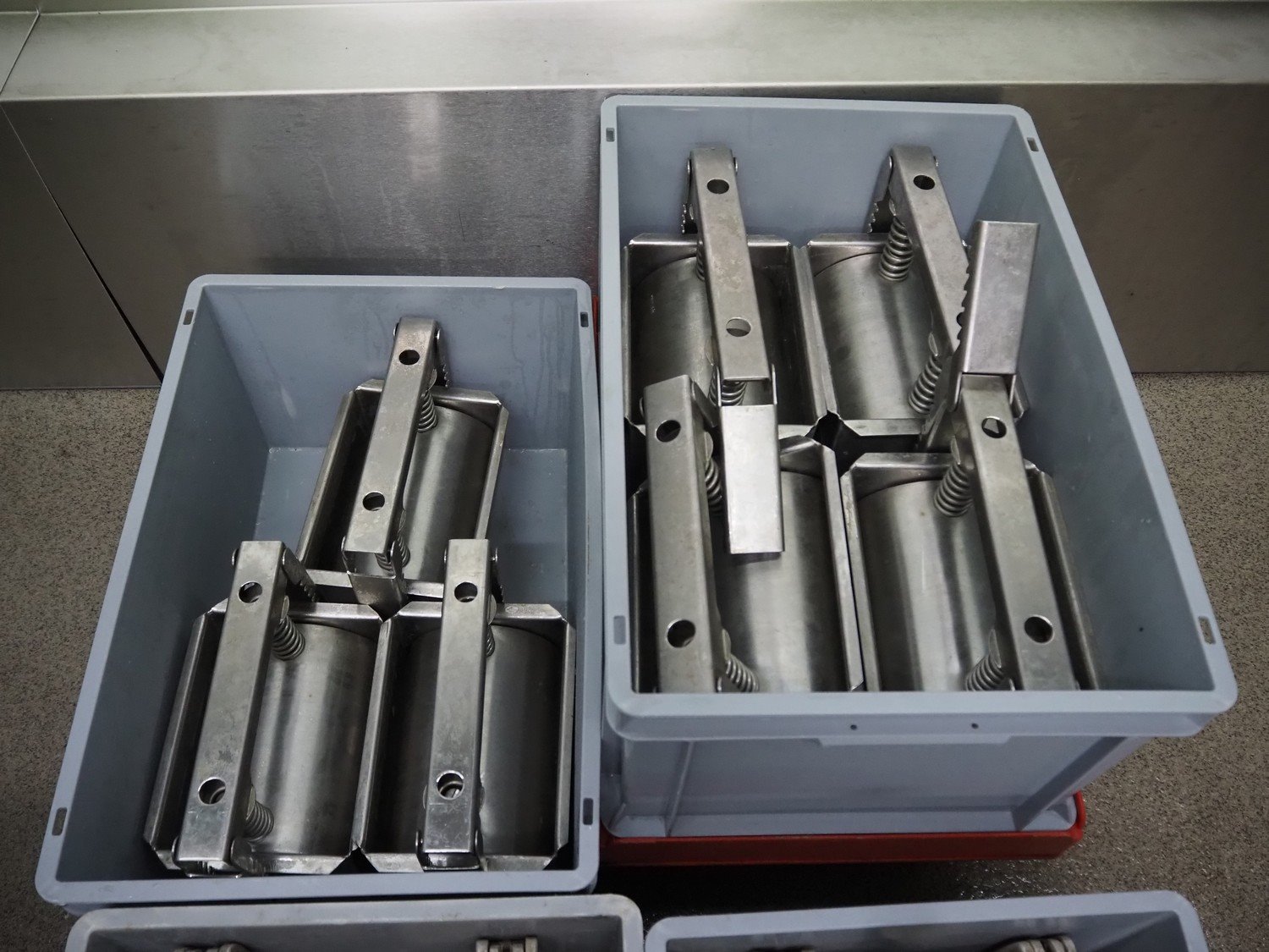4 plastic crates with 7 s/s ham moulds, inside dimensions: 220 mm x 160 mm x 140 mm, total dimensions: 270 mm x 180 mm x 240 mm, 10 Adelmann ham moulds, inside dimensions: 220 mm x 150 mm x 120 mm, total dimensions: 270 mm x 180 mm x 240 mm.