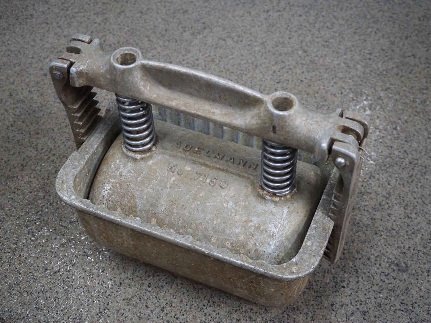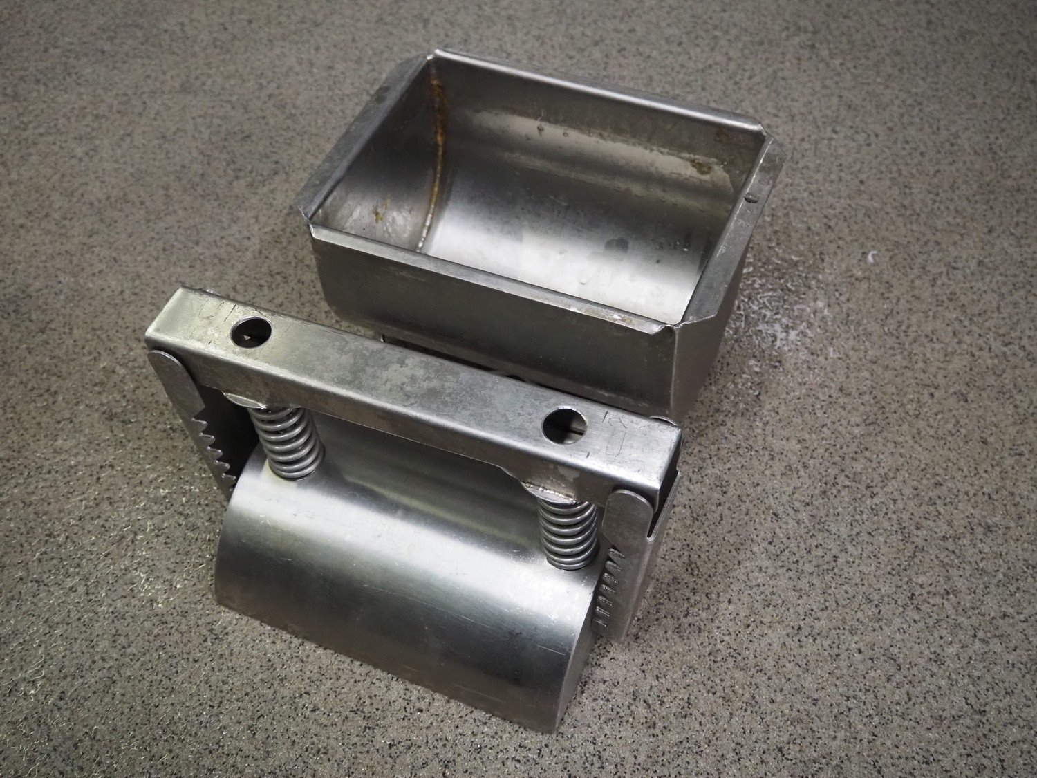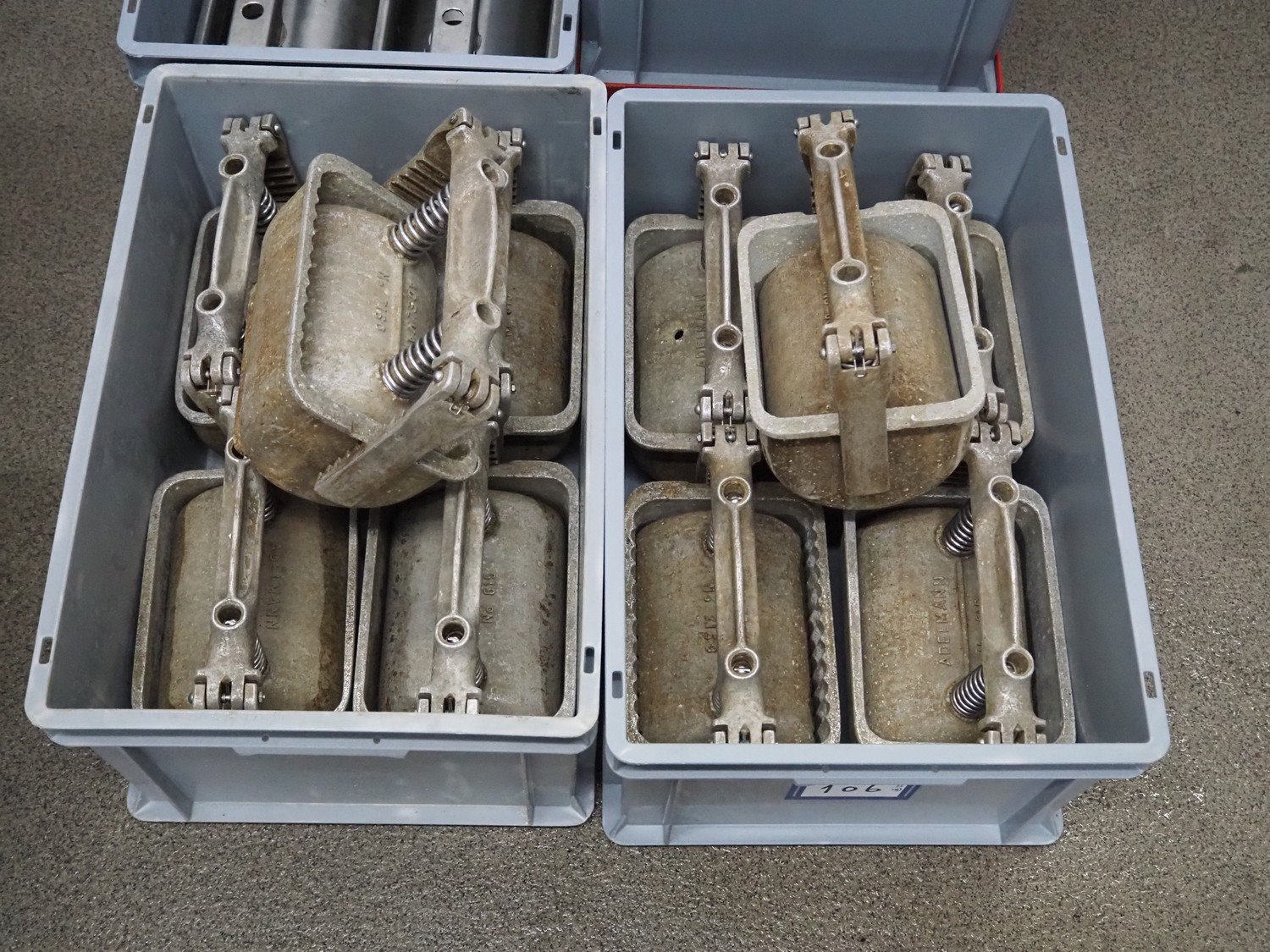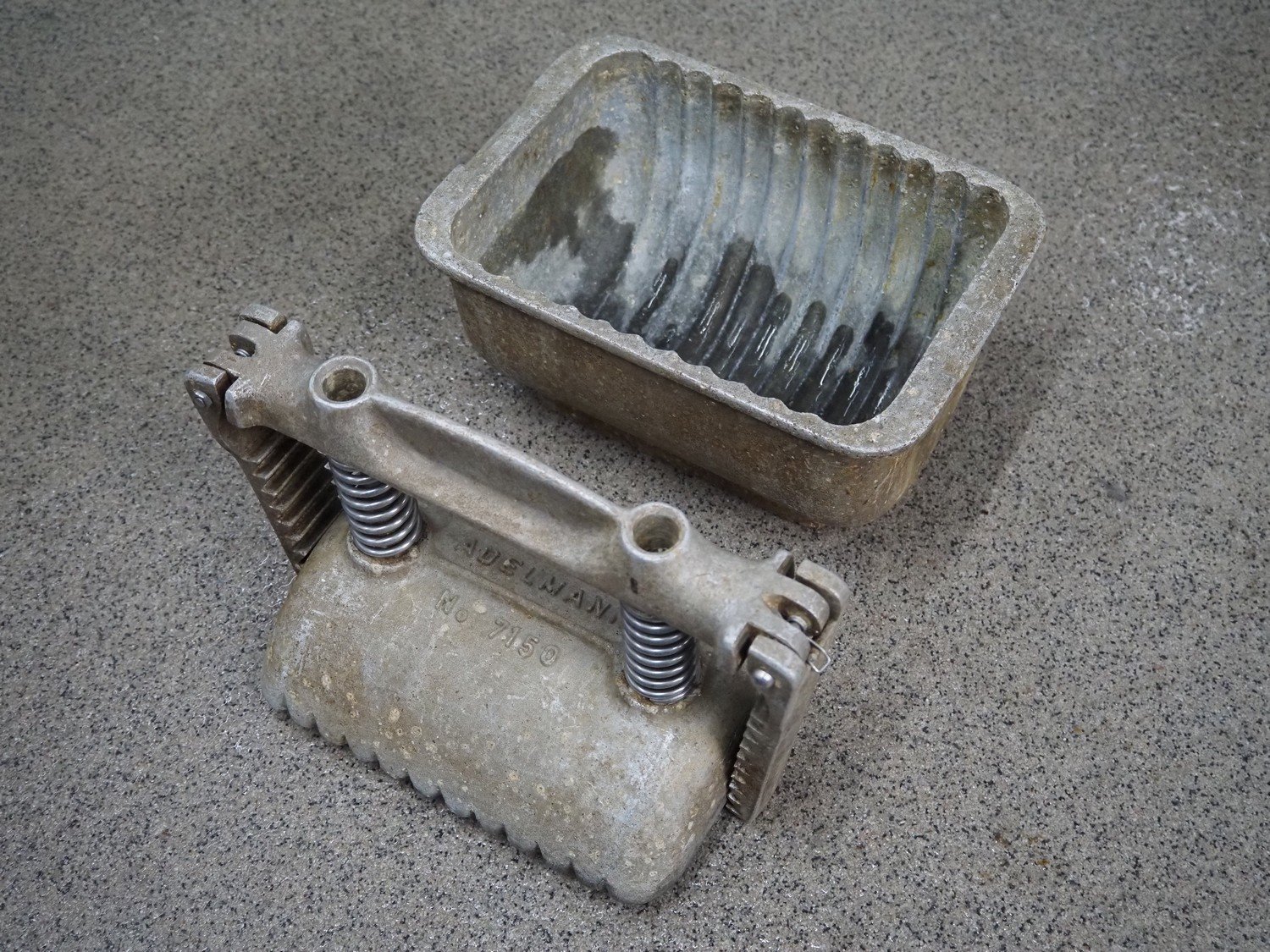 4 plastic crates with 7 s/s ham moulds, inside dimensions: 220 mm x 160 mm x 140 mm, total dimensions: 270 mm x 180 mm x 240 mm, 10 Adelmann ham moulds, inside dimensions: 220 mm x 150 mm x 120 mm, total dimensions: 270 mm x 180 mm x 240 mm.