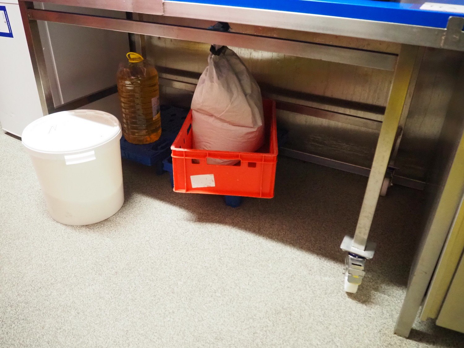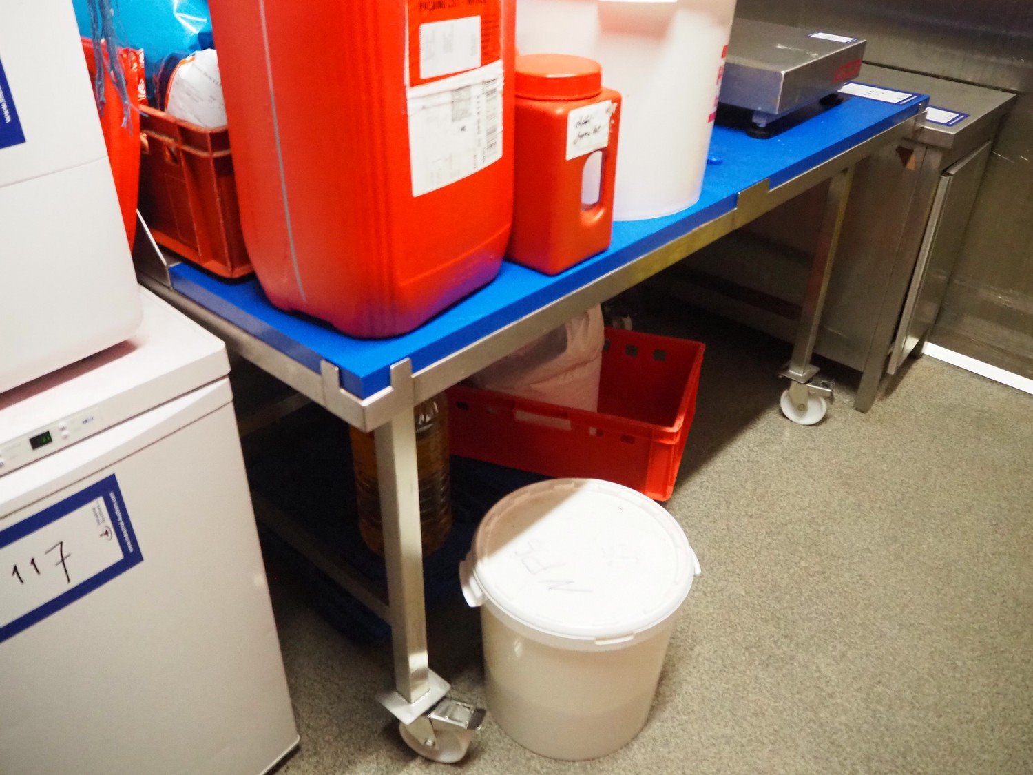 S/s mobile table with plastic worktop, dimensions plastic worktops: (2x) 850 mm x 400 mm, total dimensions: 1700 mm x 900 mm x 920 mm.