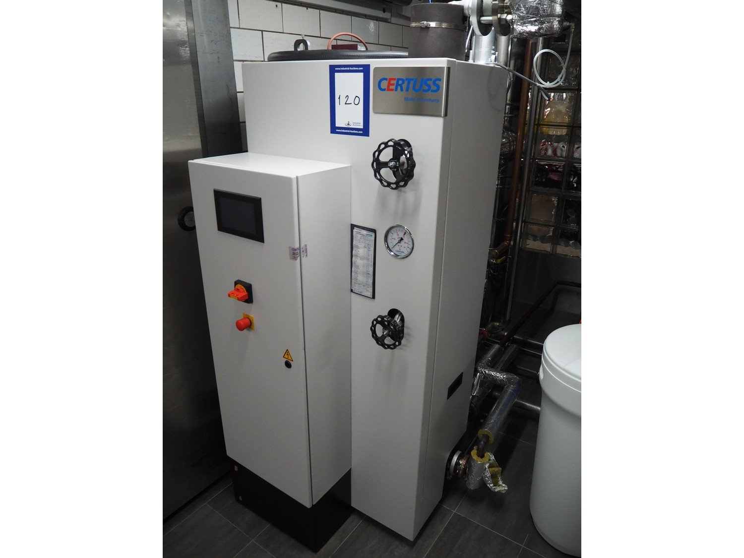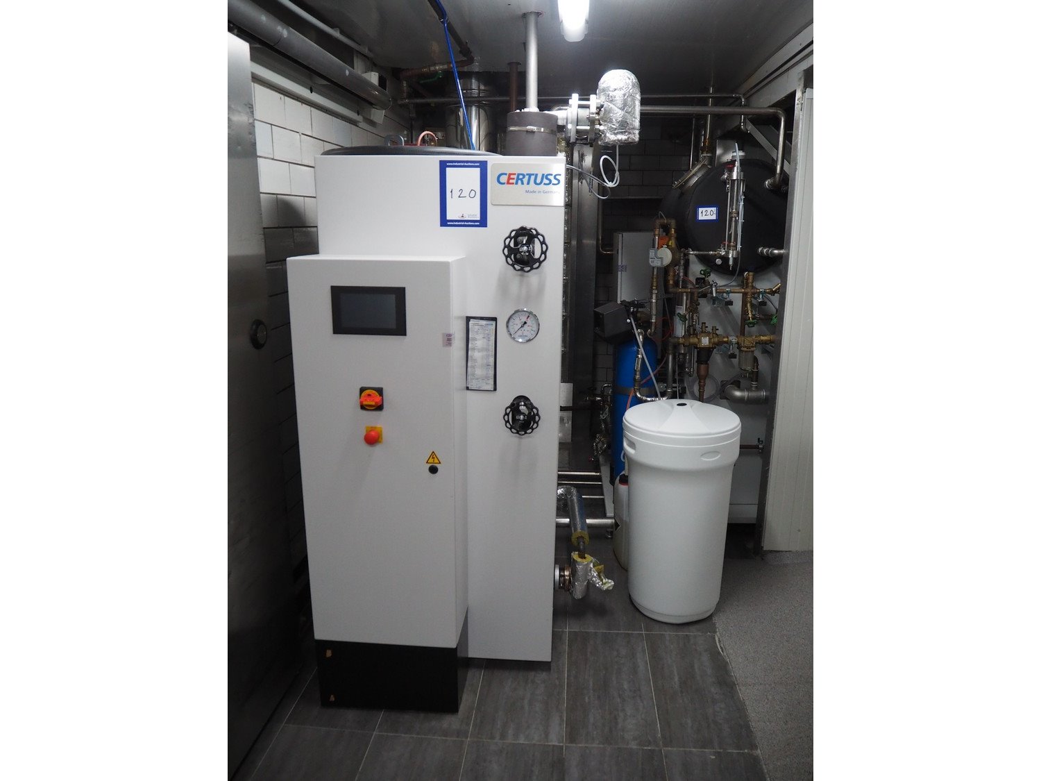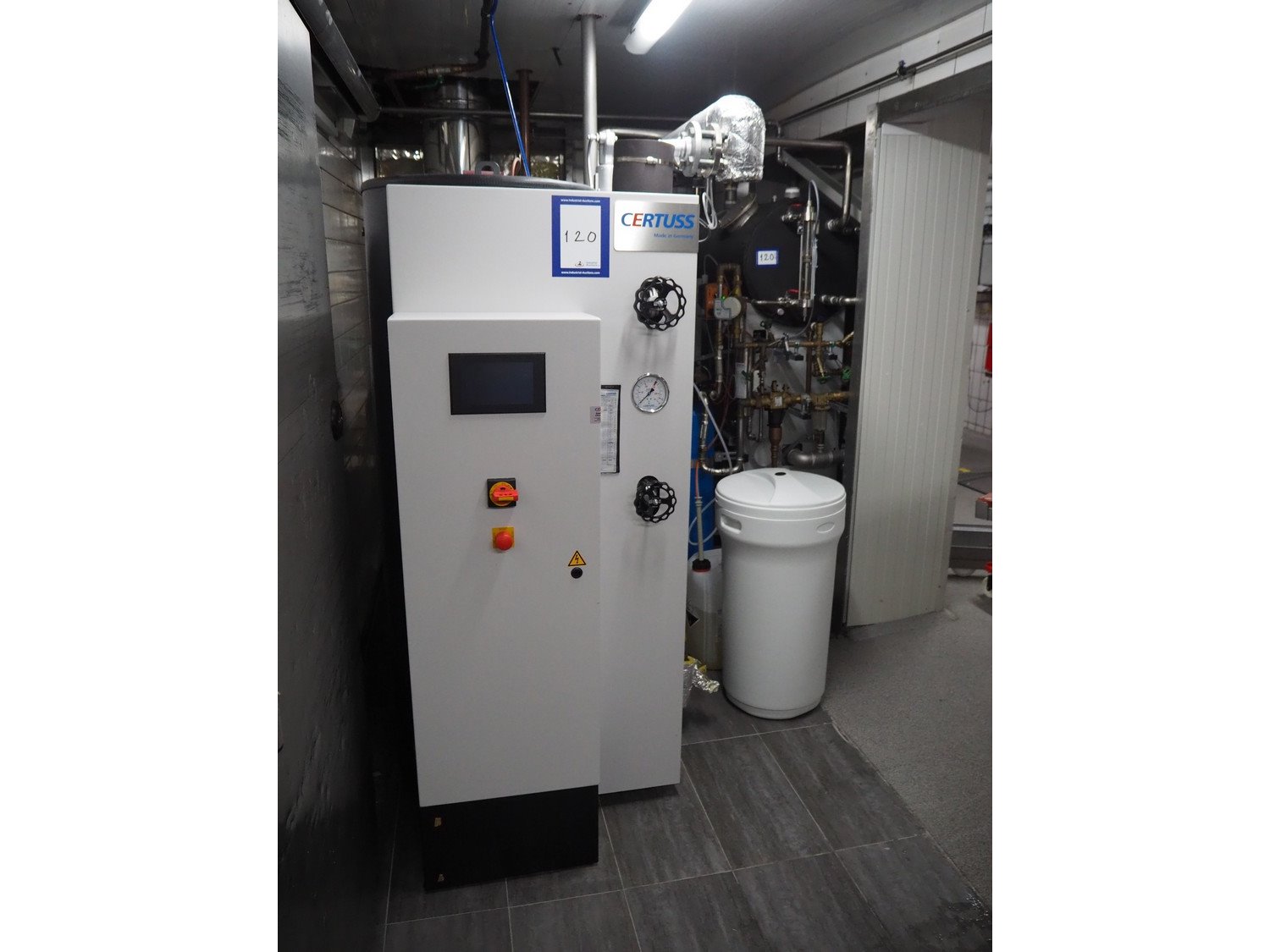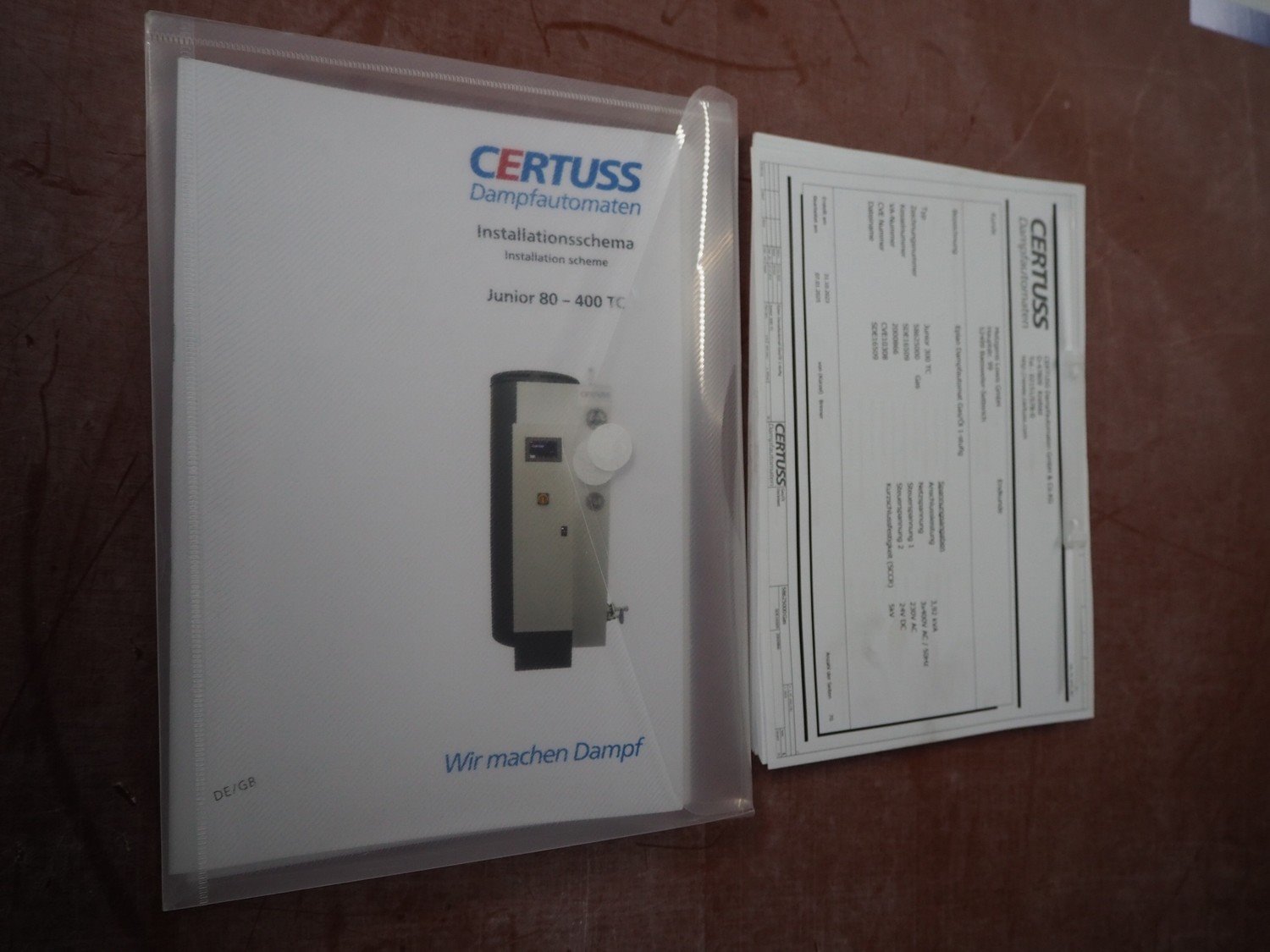 Certuss GmbH steam generator, model: CERTUSS Junior 300 TC, production number: SDE16509, year of construction: 2024, capacity: 300 kg per hour, maximum working pressure: 10 bar, maximum working temperature: 184˚C, volume in liter: 32.48 liter, test pressure: 57 bar, dimensions: 1000 mm x 1500 mm x 2000 mm, Certuss GmbH CVE package plant unit, type: CERTUSS CVE 300 TC, serial number CVE10308, year of construction: 2025, 230 V, 50 Hz, 16 A, 4.42 kVa, dimensions: 1500 mm x 1000 mm x 2000 mm.