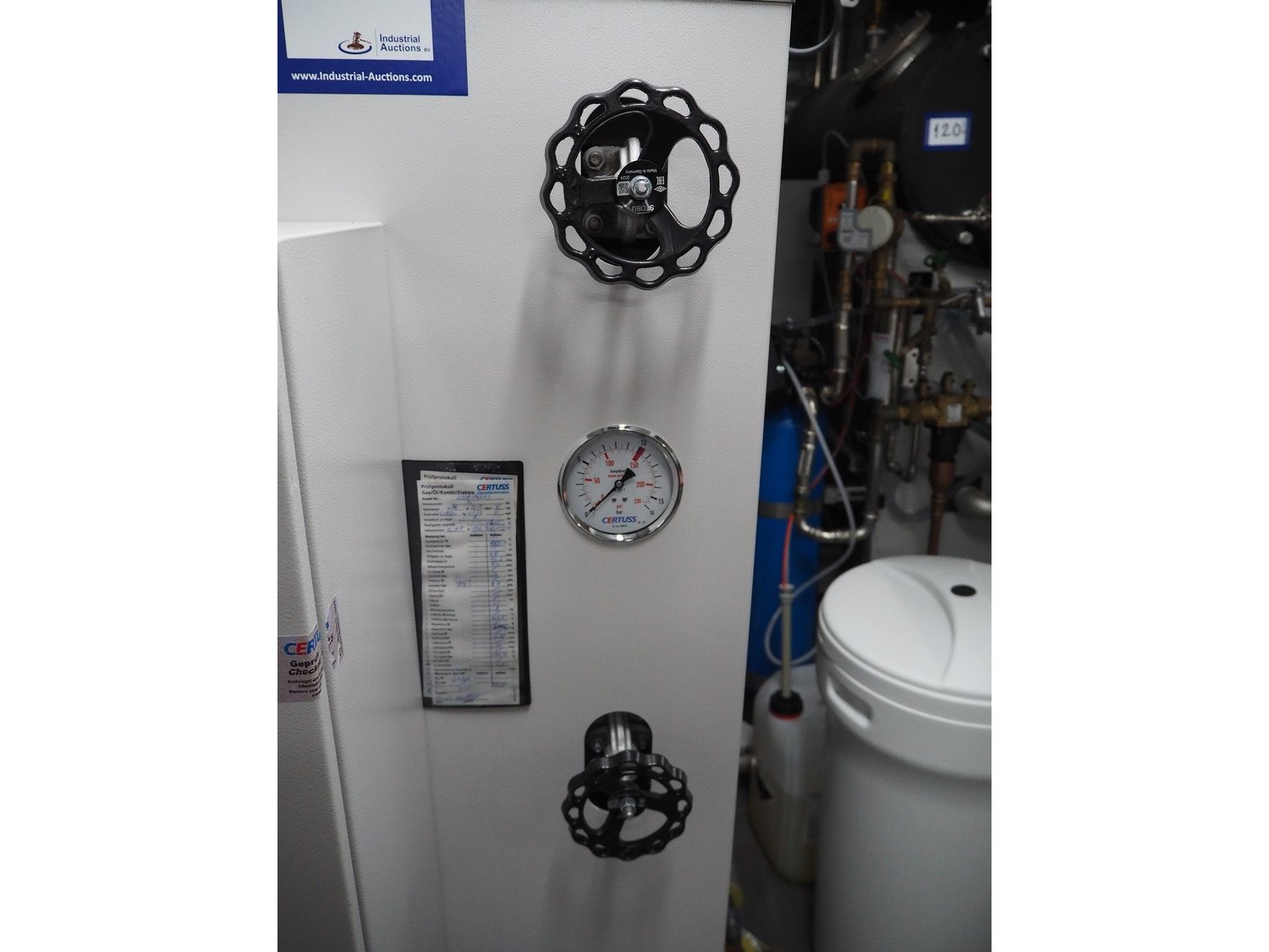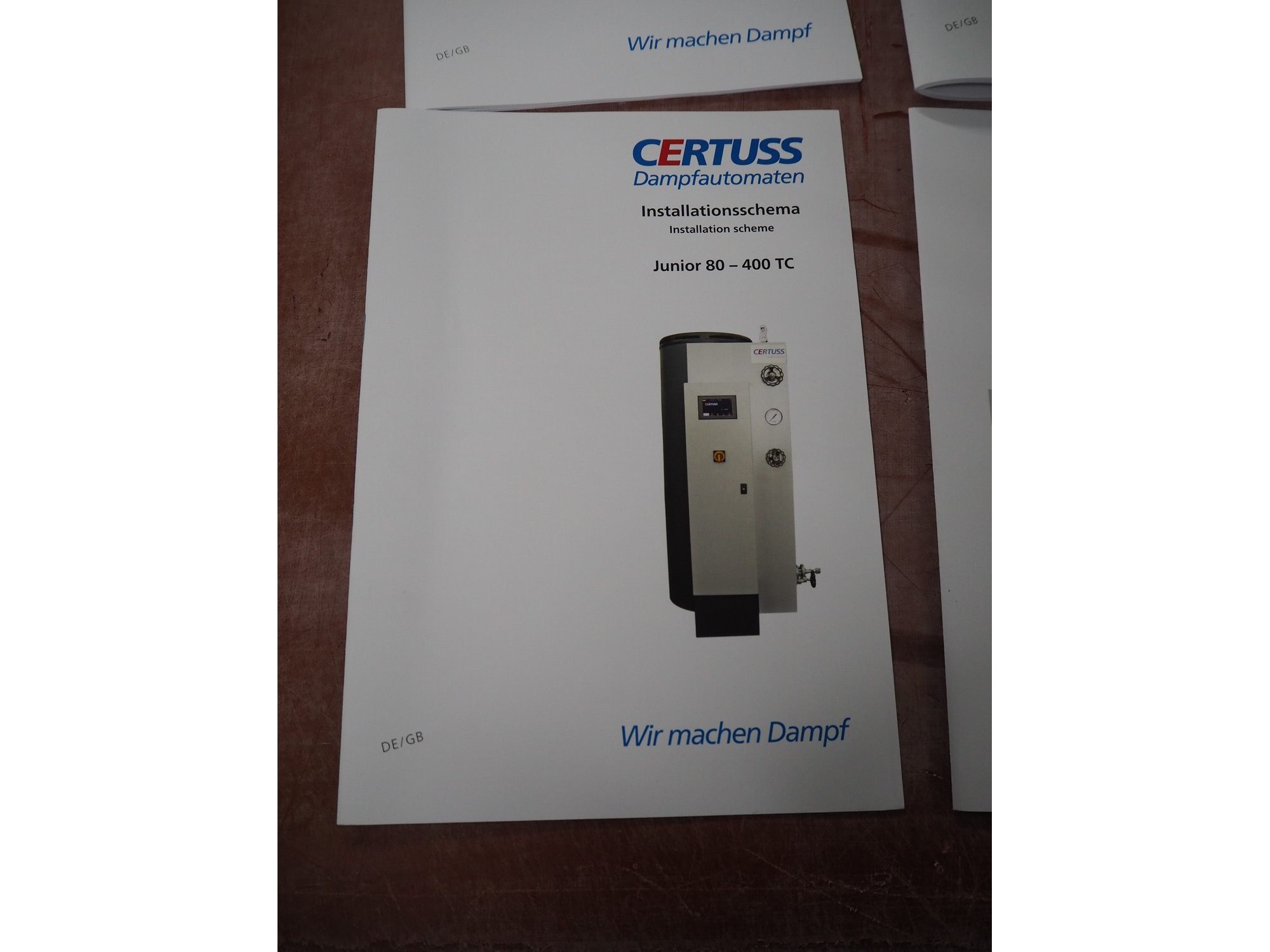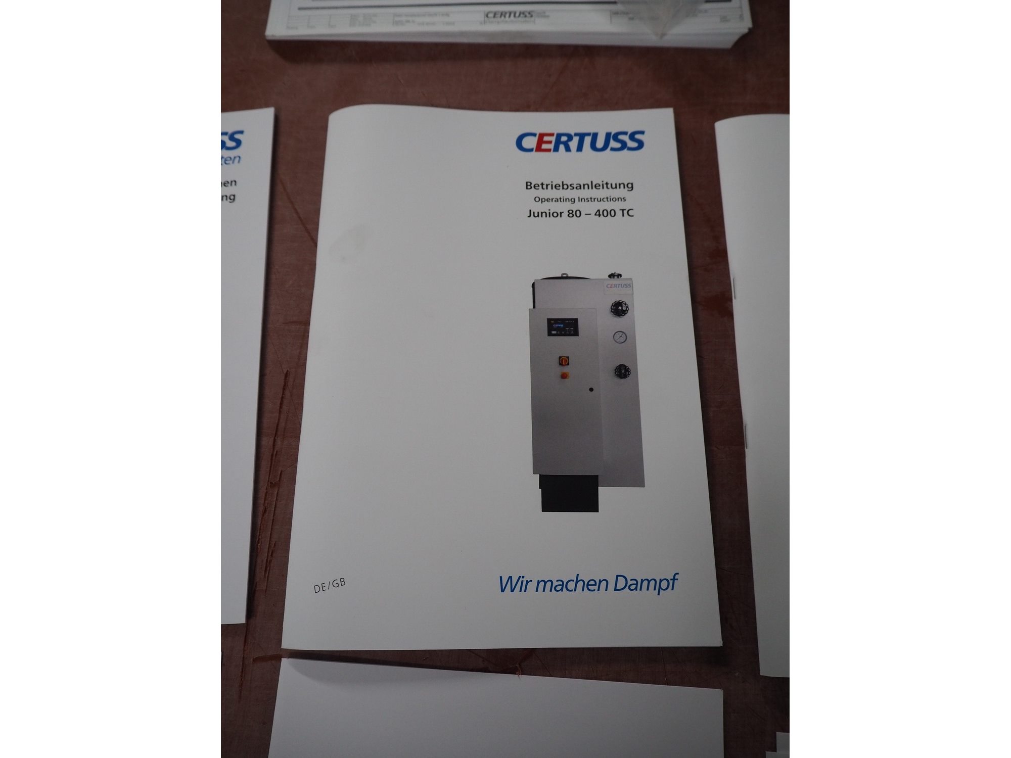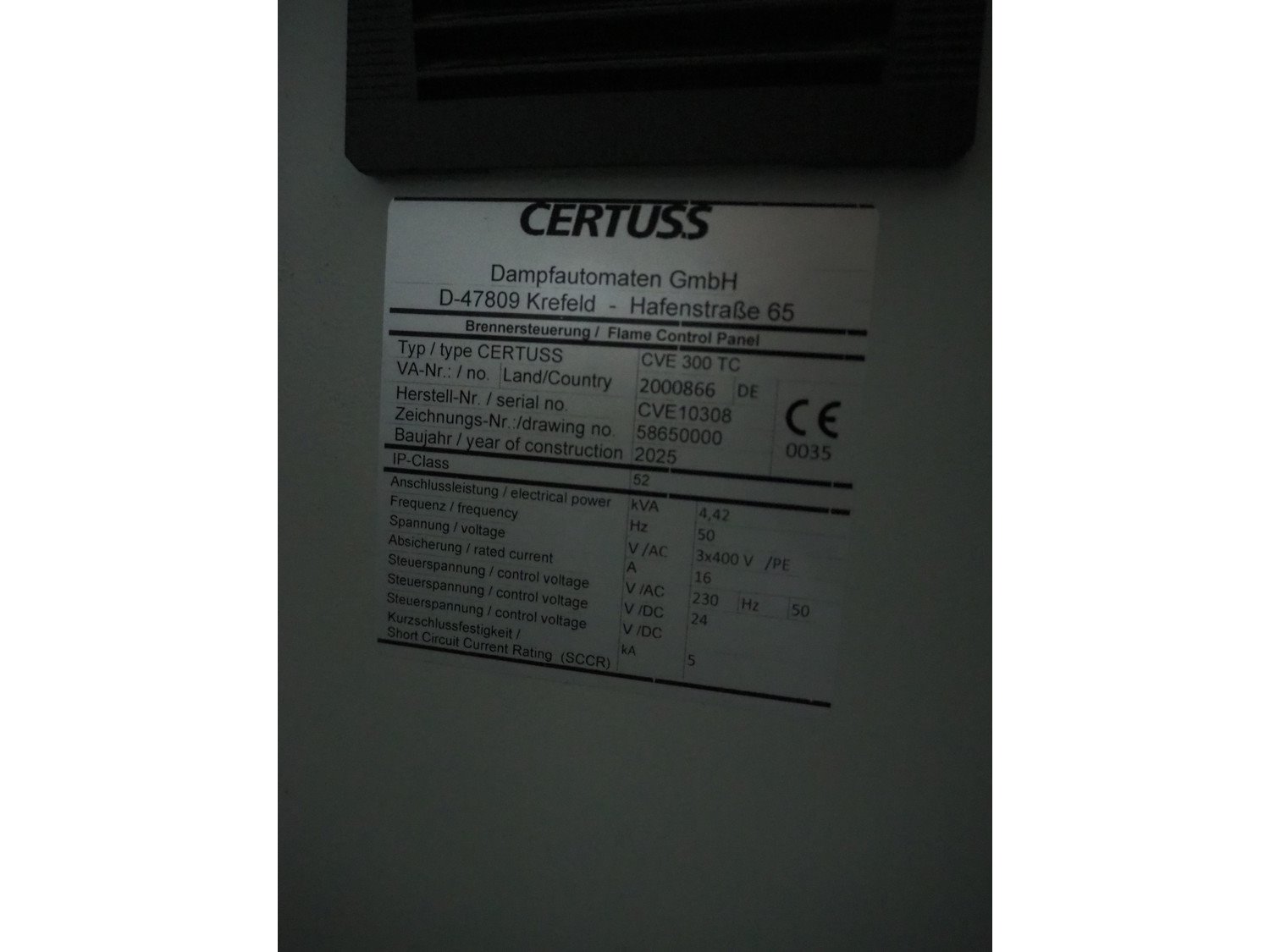 Certuss GmbH steam generator, model: CERTUSS Junior 300 TC, production number: SDE16509, year of construction: 2024, capacity: 300 kg per hour, maximum working pressure: 10 bar, maximum working temperature: 184˚C, volume in liter: 32.48 liter, test pressure: 57 bar, dimensions: 1000 mm x 1500 mm x 2000 mm, Certuss GmbH CVE package plant unit, type: CERTUSS CVE 300 TC, serial number CVE10308, year of construction: 2025, 230 V, 50 Hz, 16 A, 4.42 kVa, dimensions: 1500 mm x 1000 mm x 2000 mm.