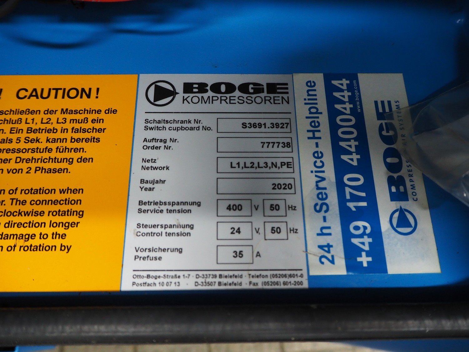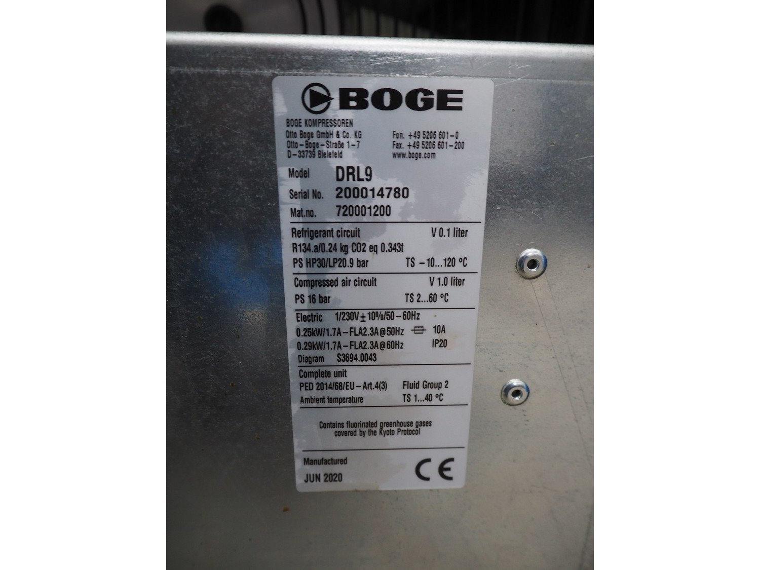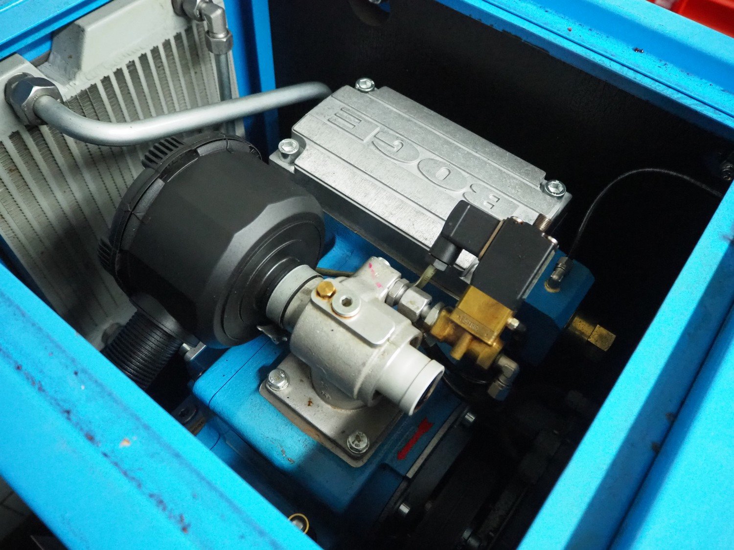 Boge Kompressoren air compressor, type: C 9 D, machine number: 5153071, year of construction: 09-2020, volume: 0.870 m³/min, pressure: 13 bar, motor: 3000 rates per minute, motor capacity: 7.5 kW, total dimensions: 500 mm x 1000 mm x 1250 mm.