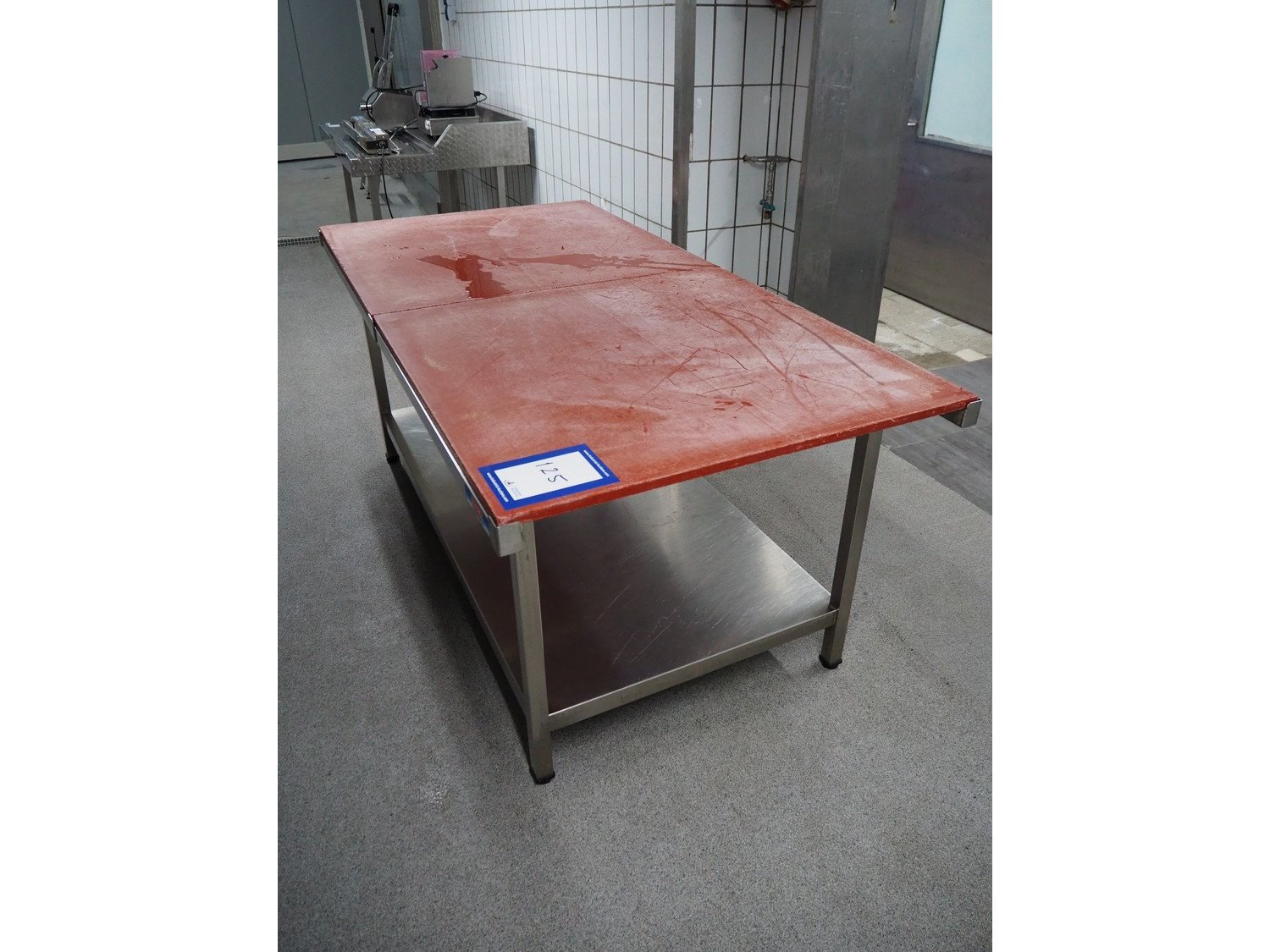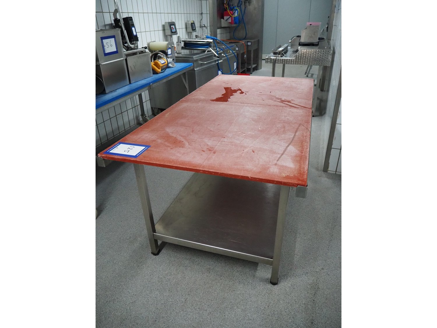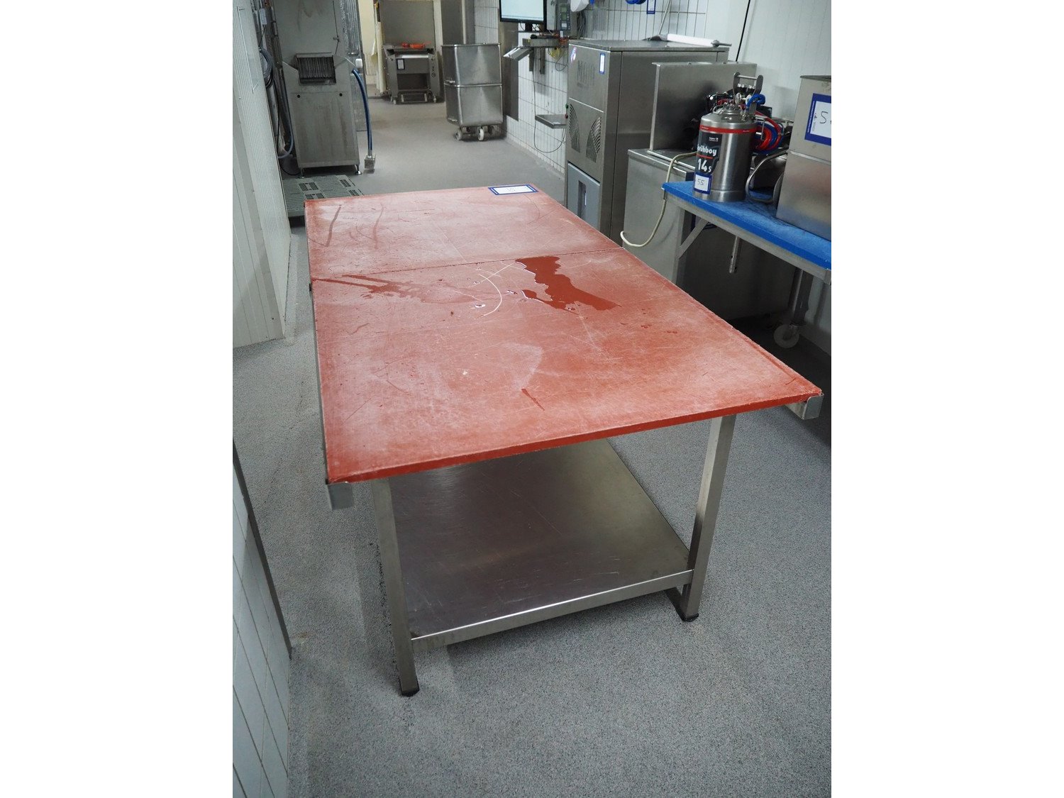 S/s work table with plastic worktops, dimensions: 2000 mm x 1000 mm x 850 mm.