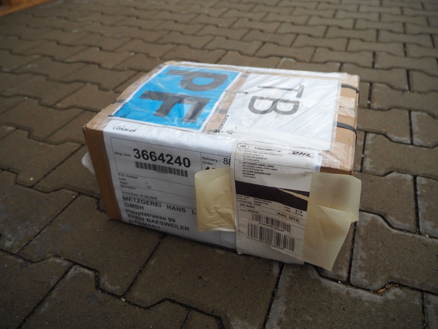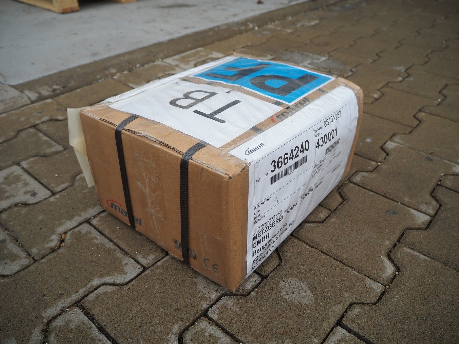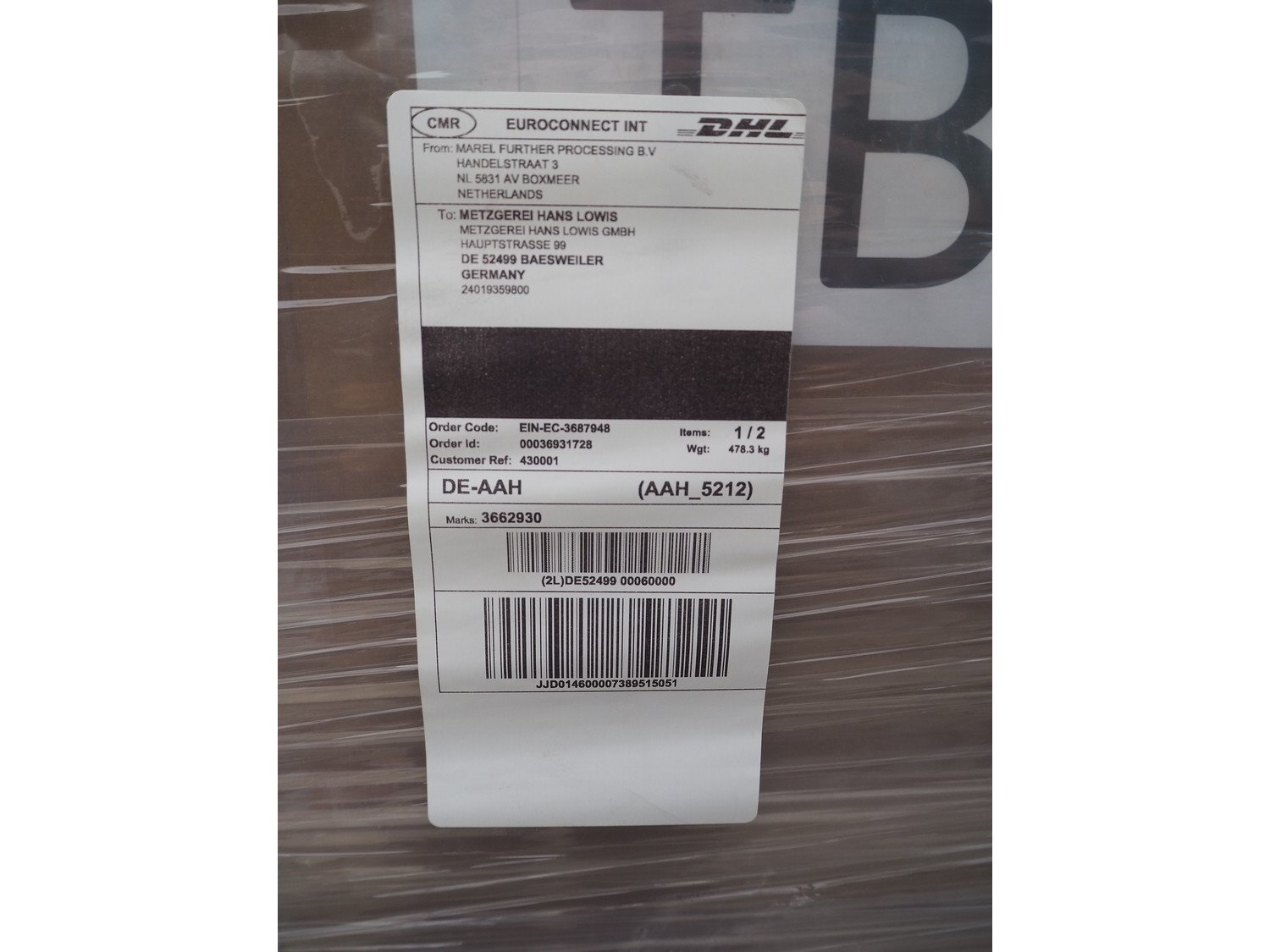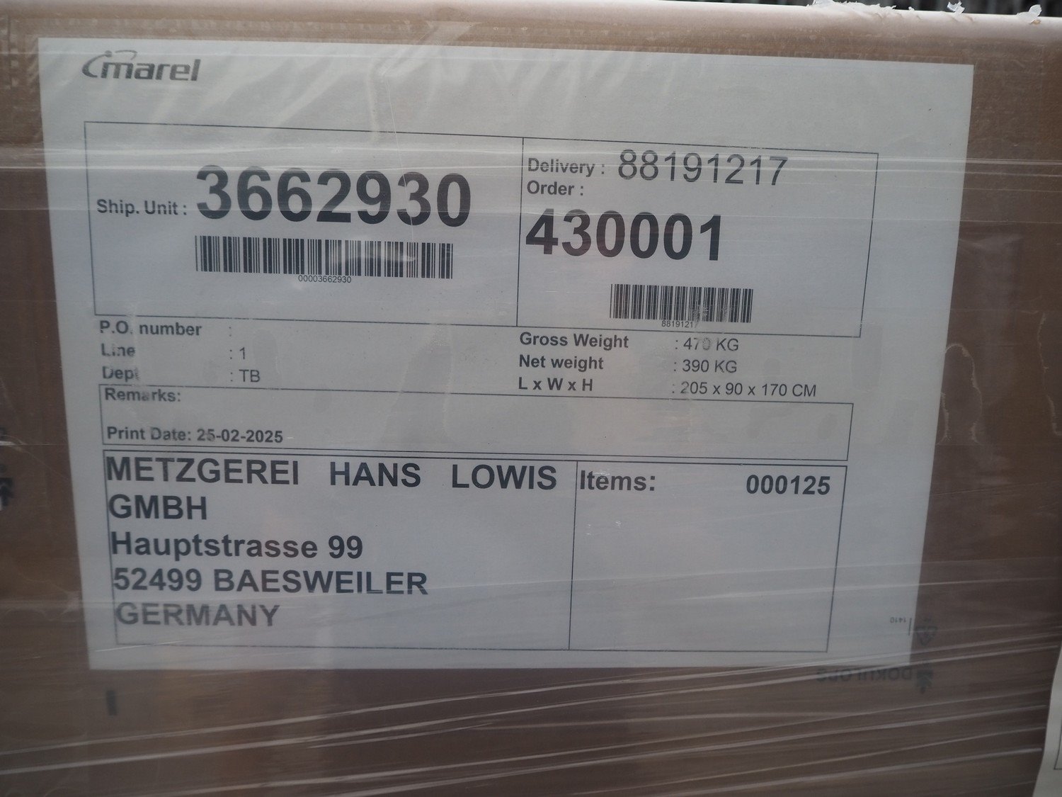 Marel sausage peeler, model: 2800, for caliber 26 - 28 mm, dimensions box: 2000 mm x 900 mm x 1680 mm. New, never used. Voor meer informatie klik op de volgende link: Marel_Townsend_Peeler.pdf