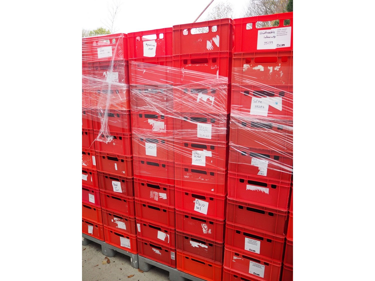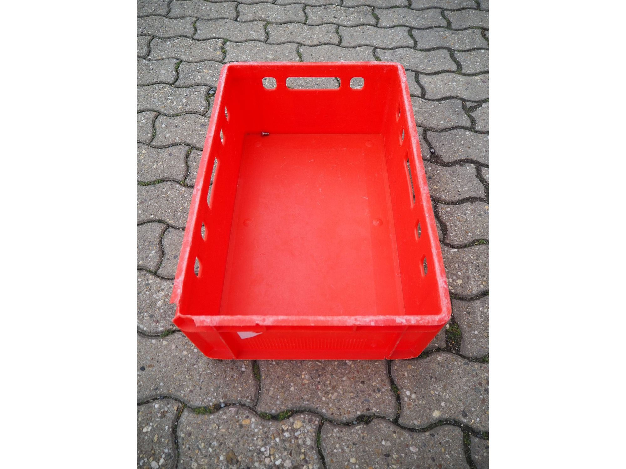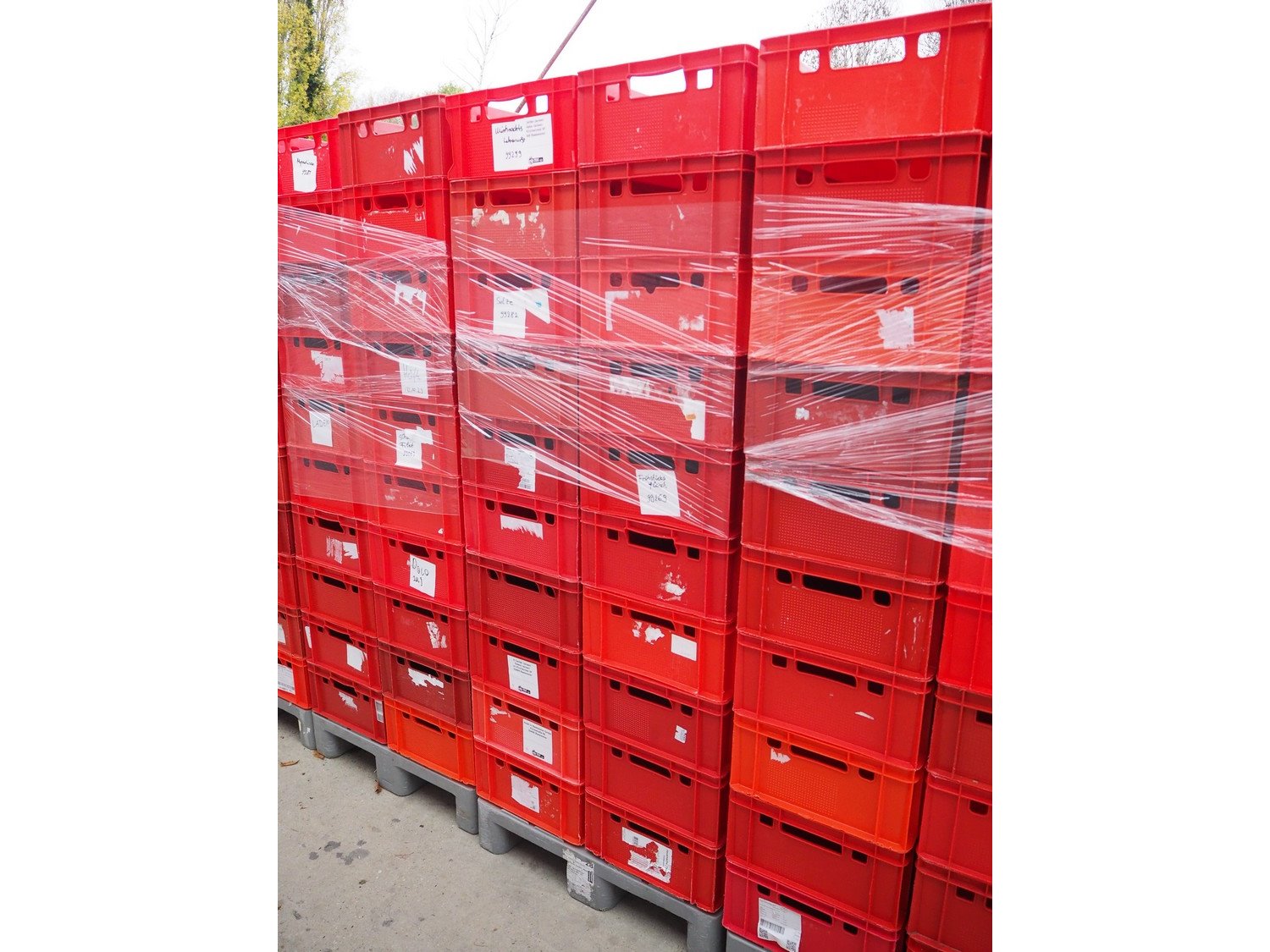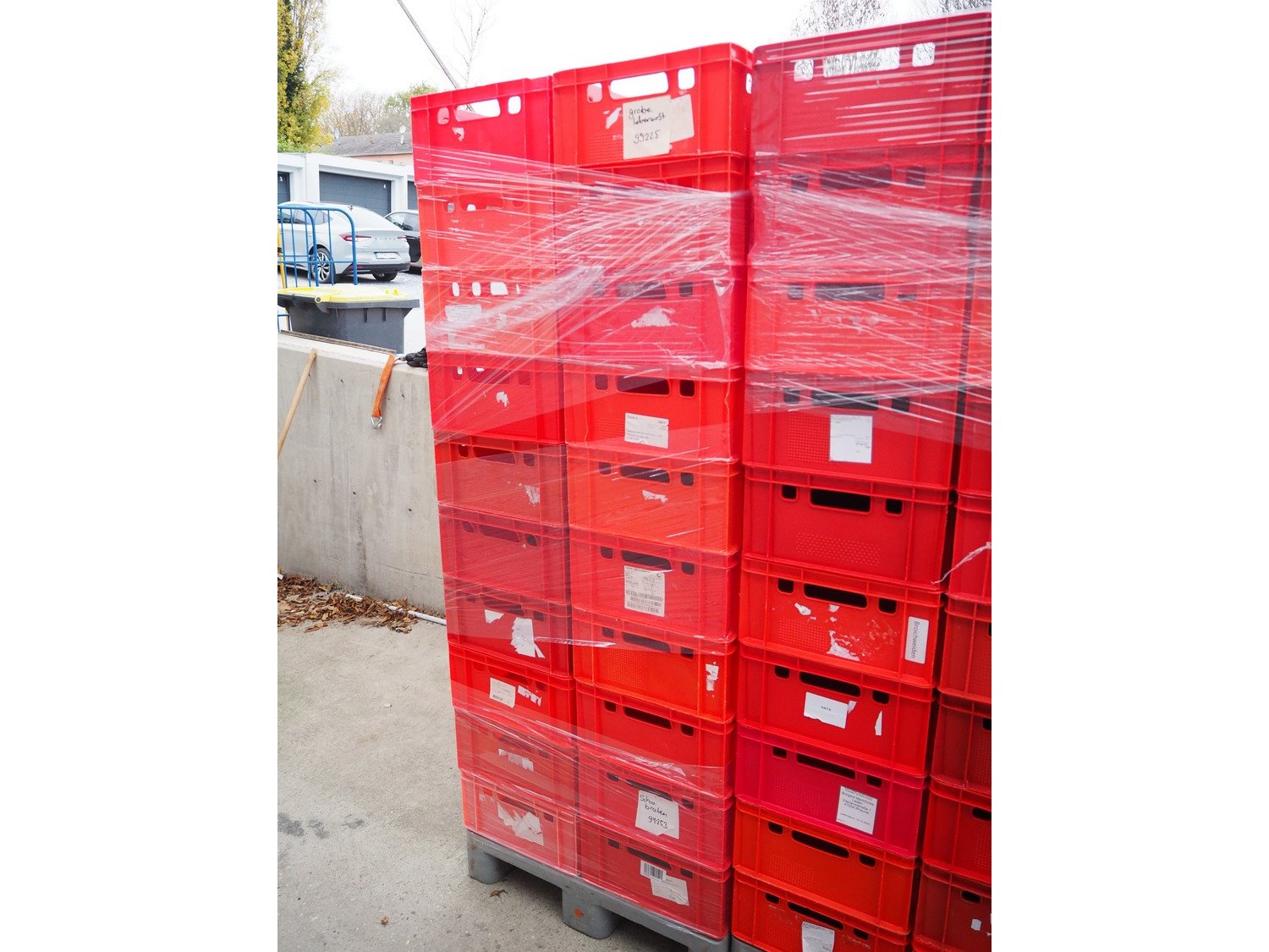 280 pcs. E2-crates on 7 plastic EURO H1-pallets, dimensions per crate: 600 mm x 400 mm x 200 mm, total dimensions pallets: (7x) 1200 mm x 800 mm x 2050 mm.