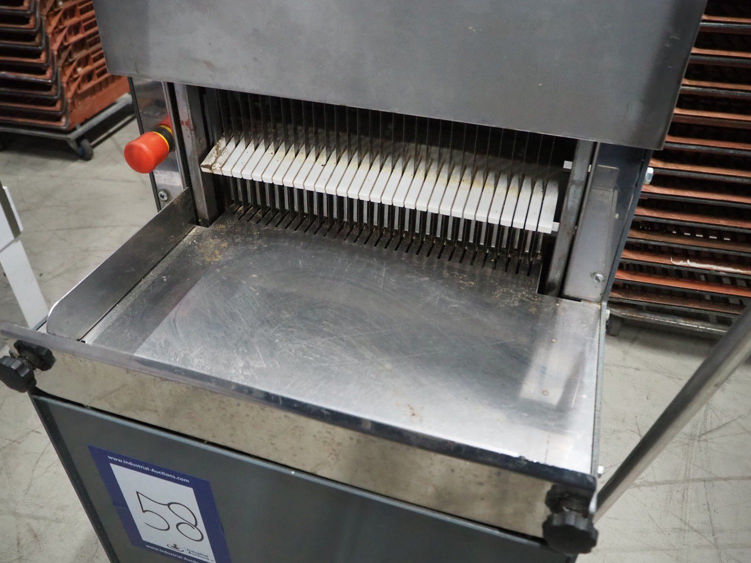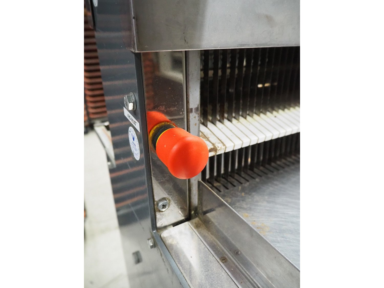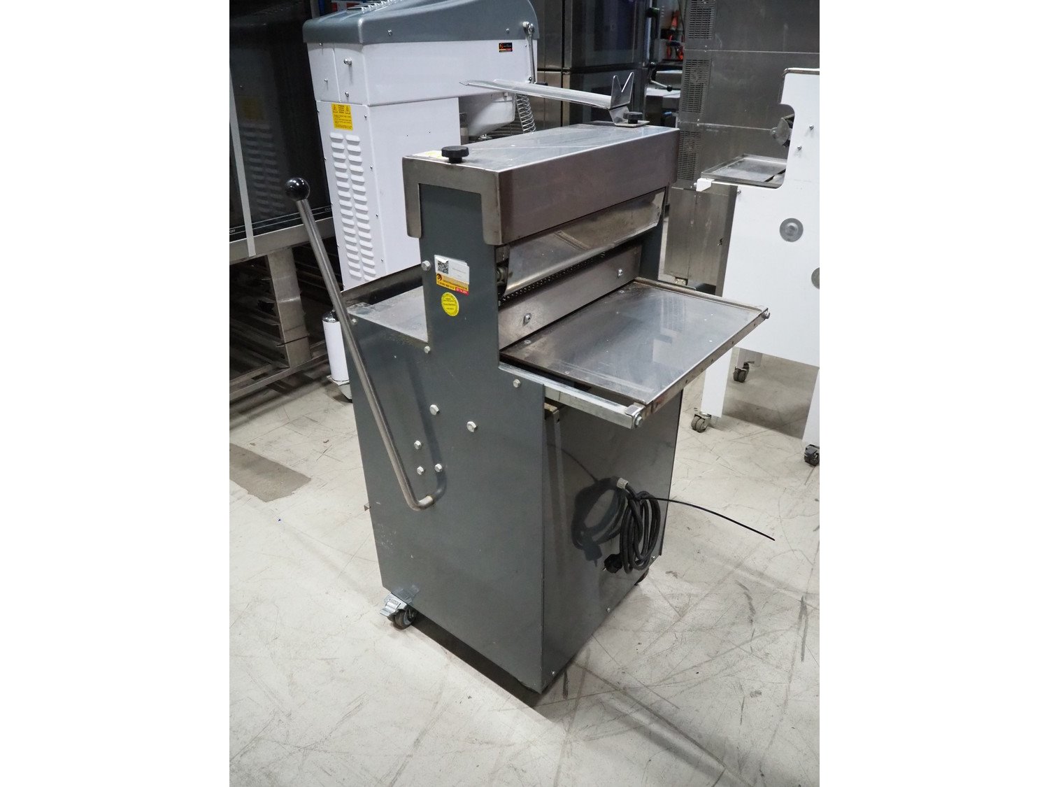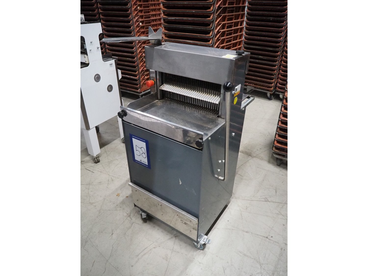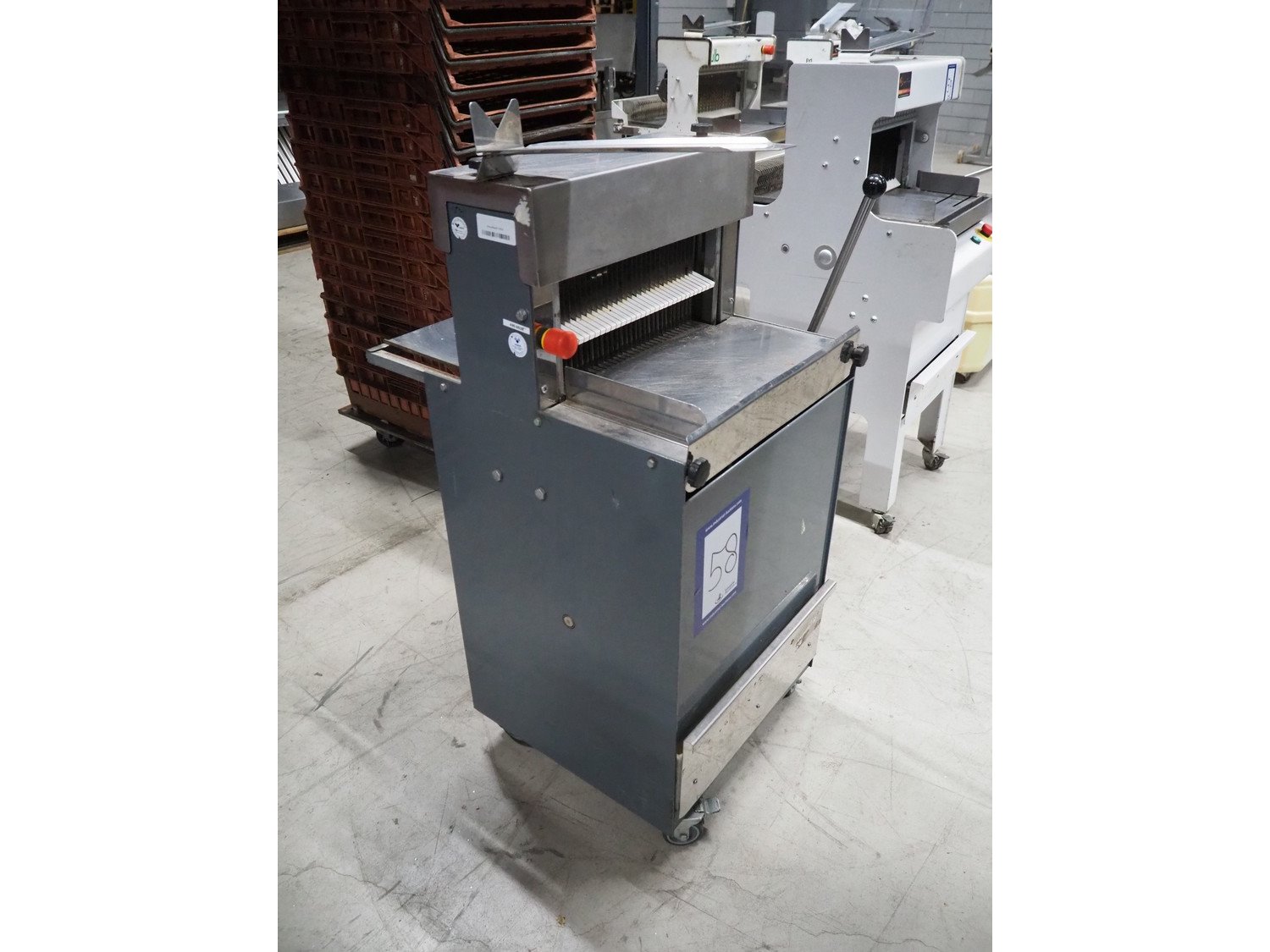 Herman bread slicer, type: De luxe, machine number: 108, year of construction: 2001, 230 V, 0.37 kW, weight: 125 kg, 30 knives, distance between knives: 12 mm, total dimensions: 700 mm x 660 mm x 1240 mm.