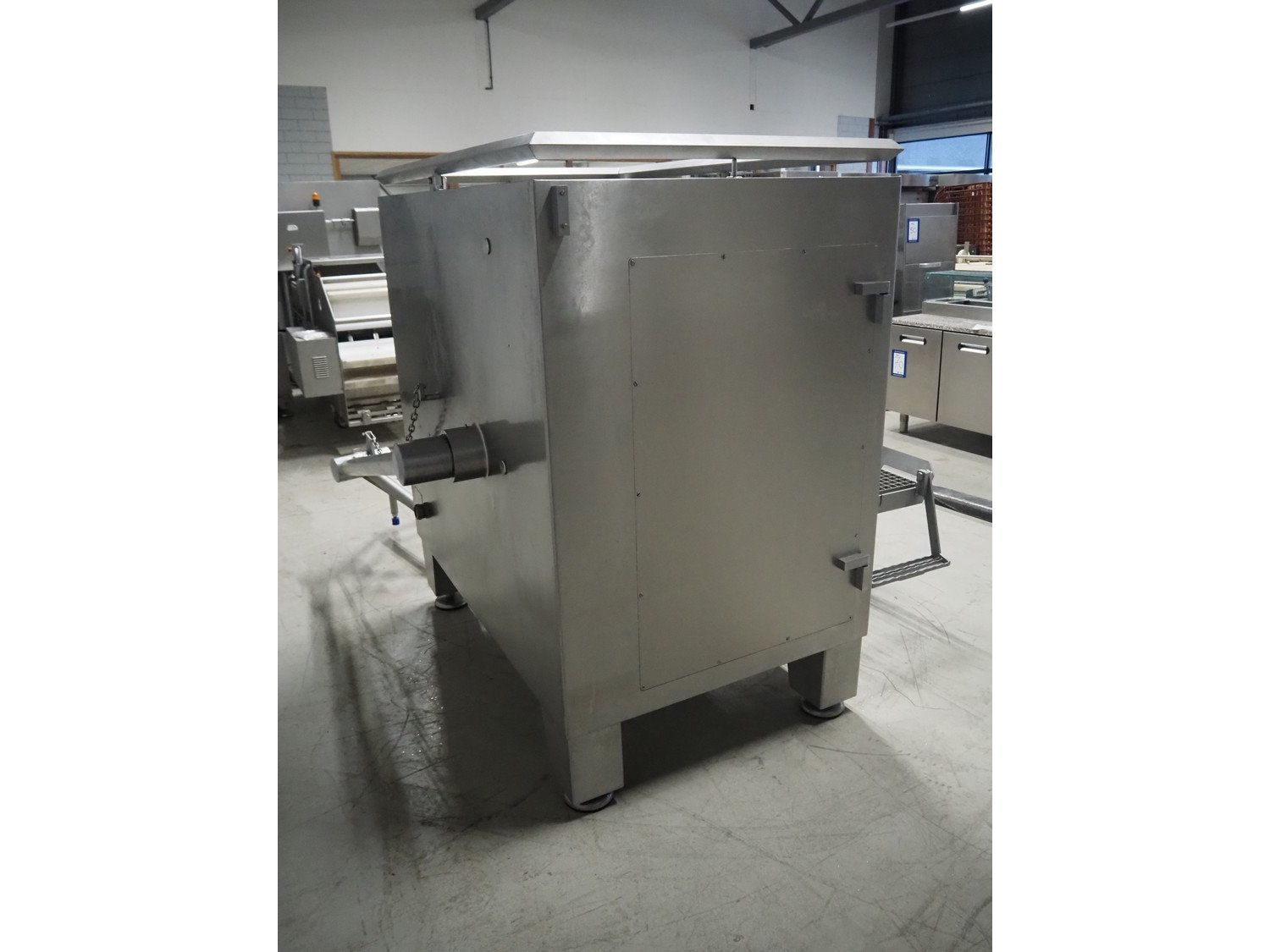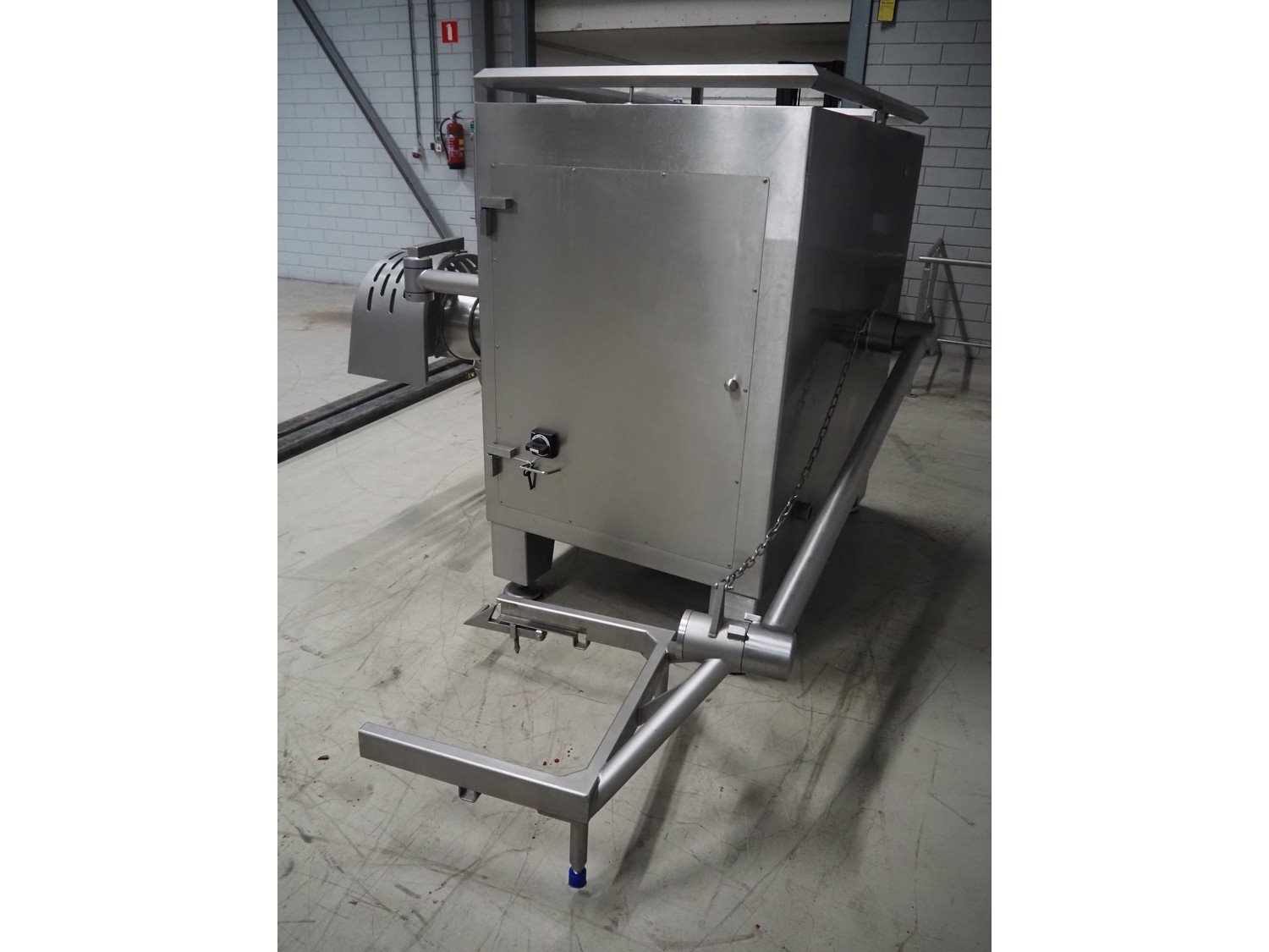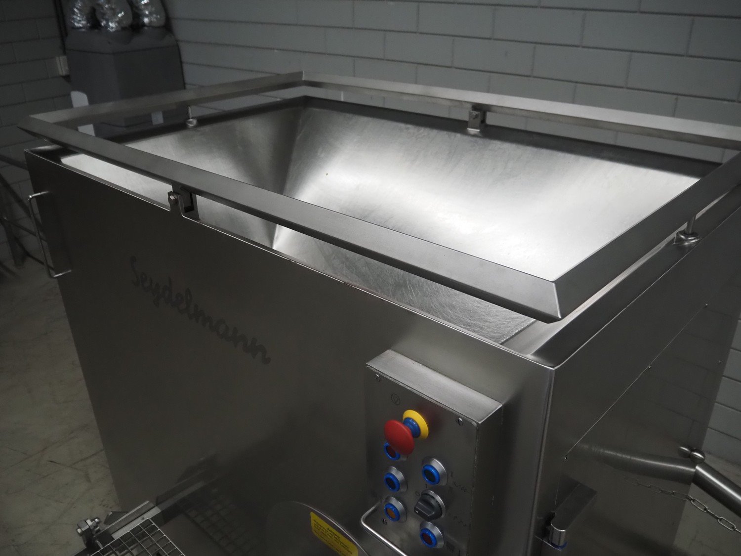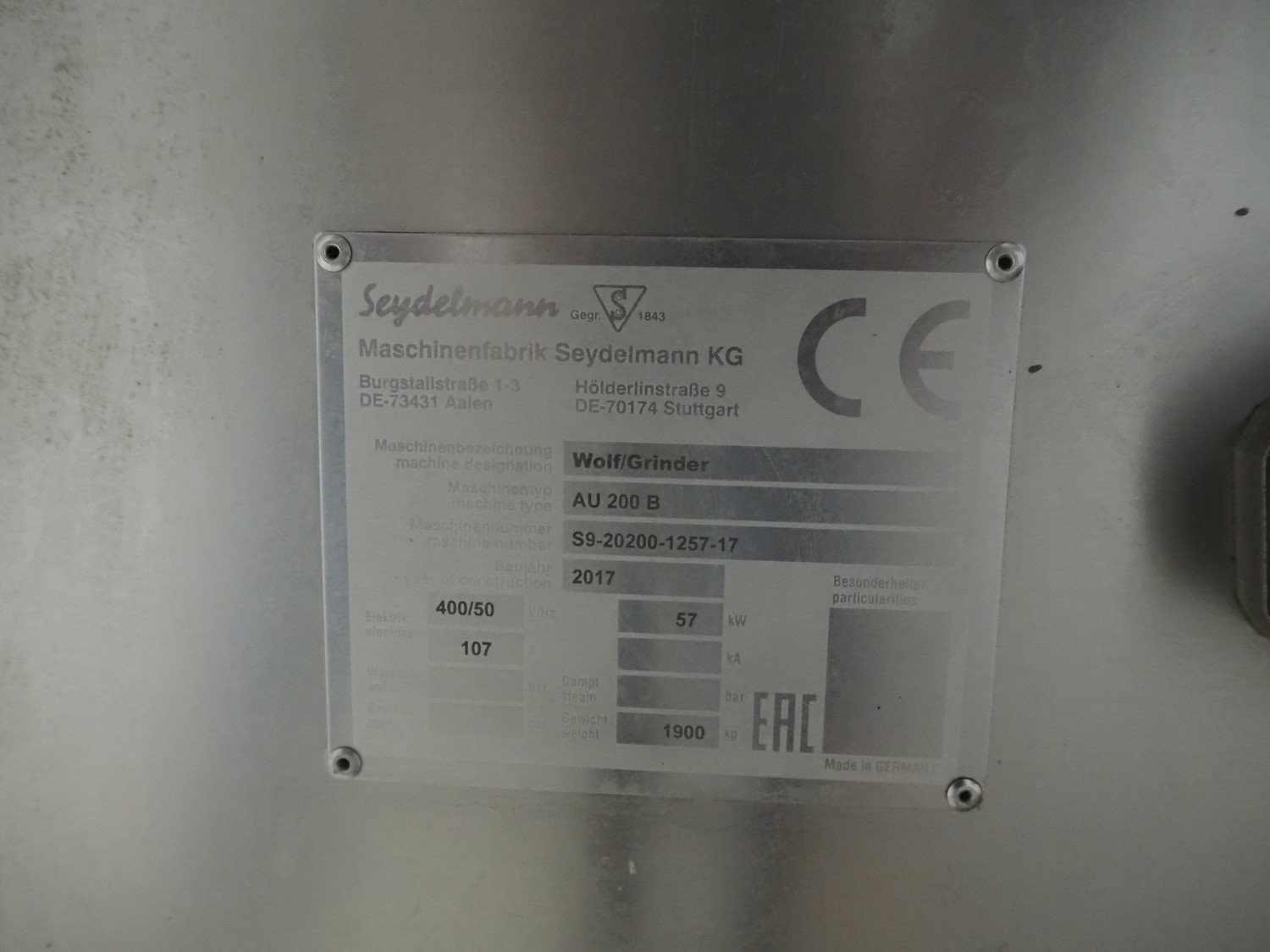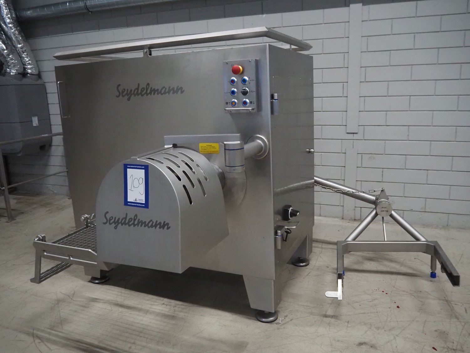 Seydelmann grinder with lifter for 200 liter meat bins, type: AU 200 B, machine number: S9-20200-1257-17, year of construction: 2017, 400 V, 50 Hz, 107 A, 57 kW, weight: 1900 kg, diameter plate: 200 mm, total dimensions: 2700 mm x 2130 mm x 1790 mm.