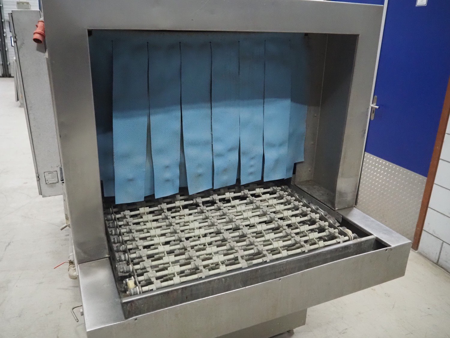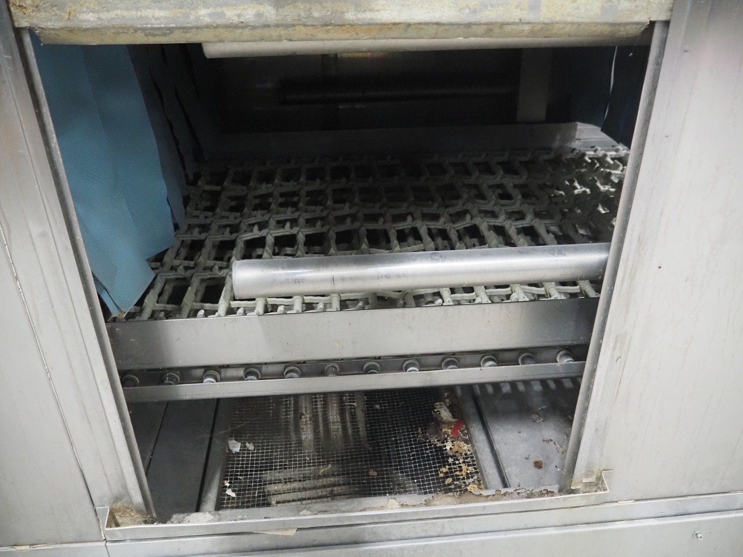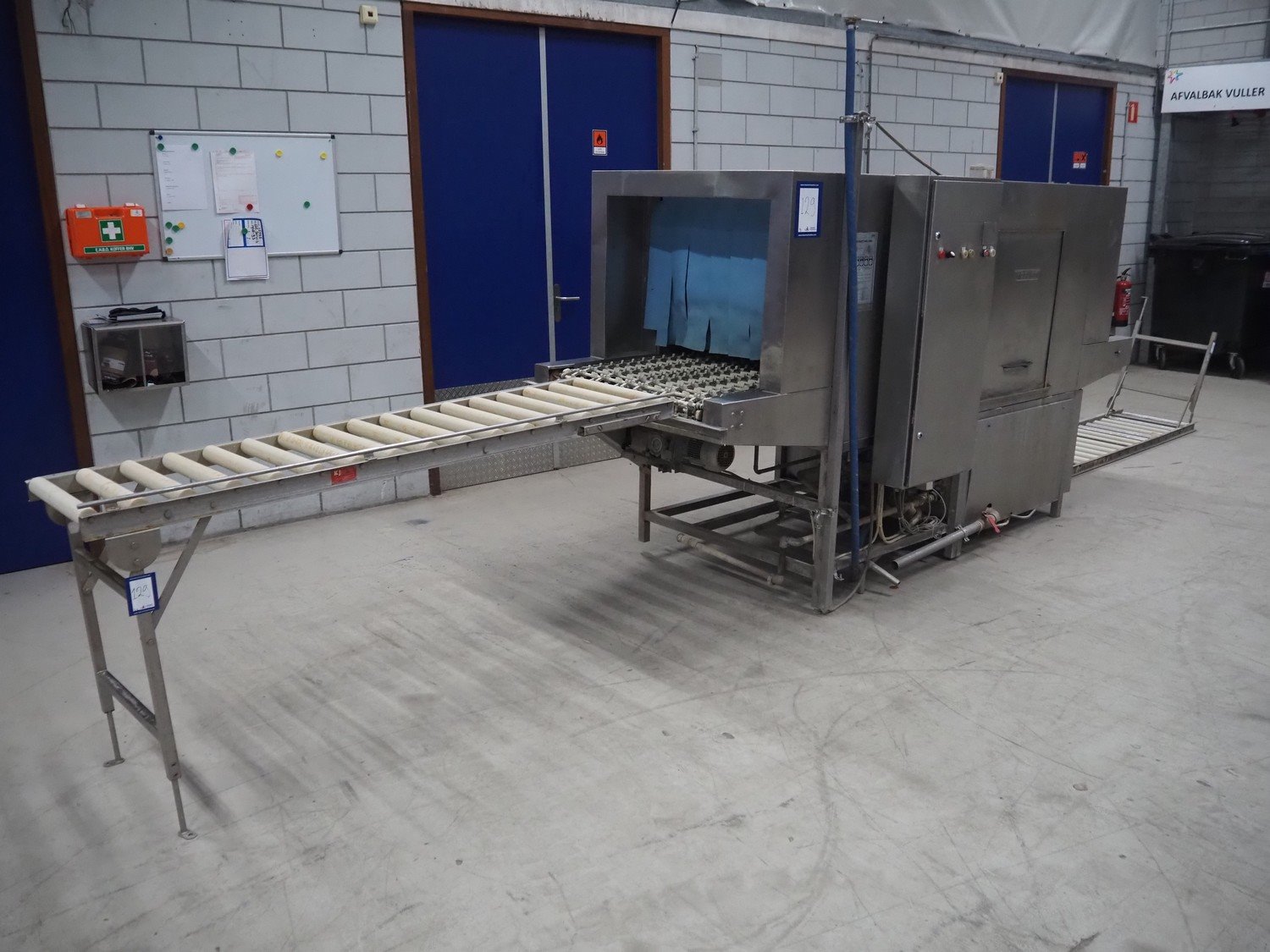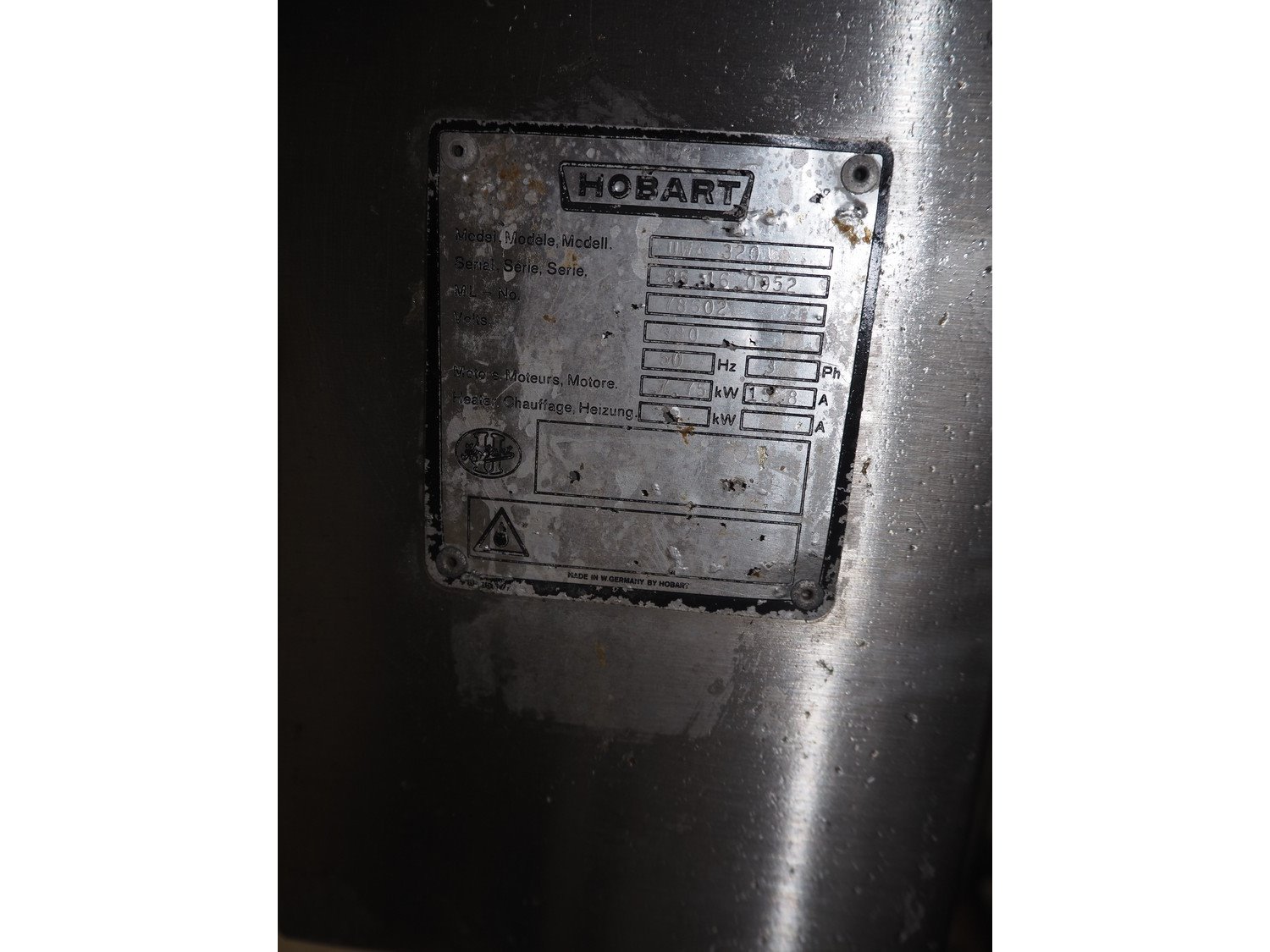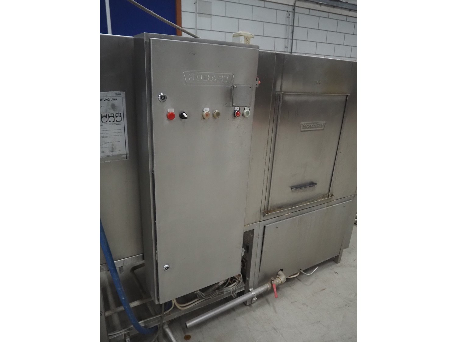 Hobart dishwasher, model: UWA 320, serial number: 86 16 0052, 380 V, 3 Ph, 50 Hz, 15.8 A, 7.75 kW, plastic belt, belt width: 770 mm, clearance: 900 mm x 660 mm, total dimensions: 3250 mm x 1340 mm x 1930 mm. Including in- and outfeed roller conveyor, plastic rollers, roller width: 500 mm, total dimensions roller conveyors: (2x) 2000 mm x 600 mm x 930 mm.