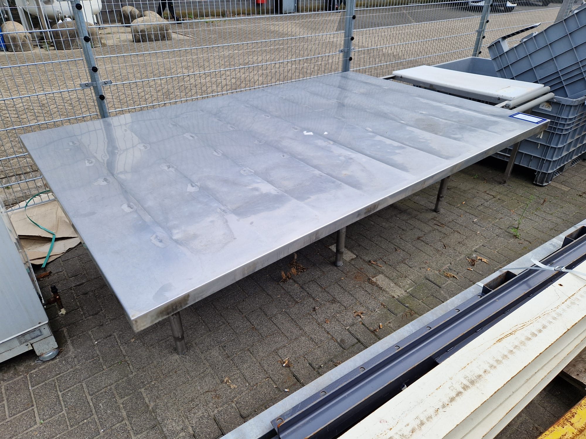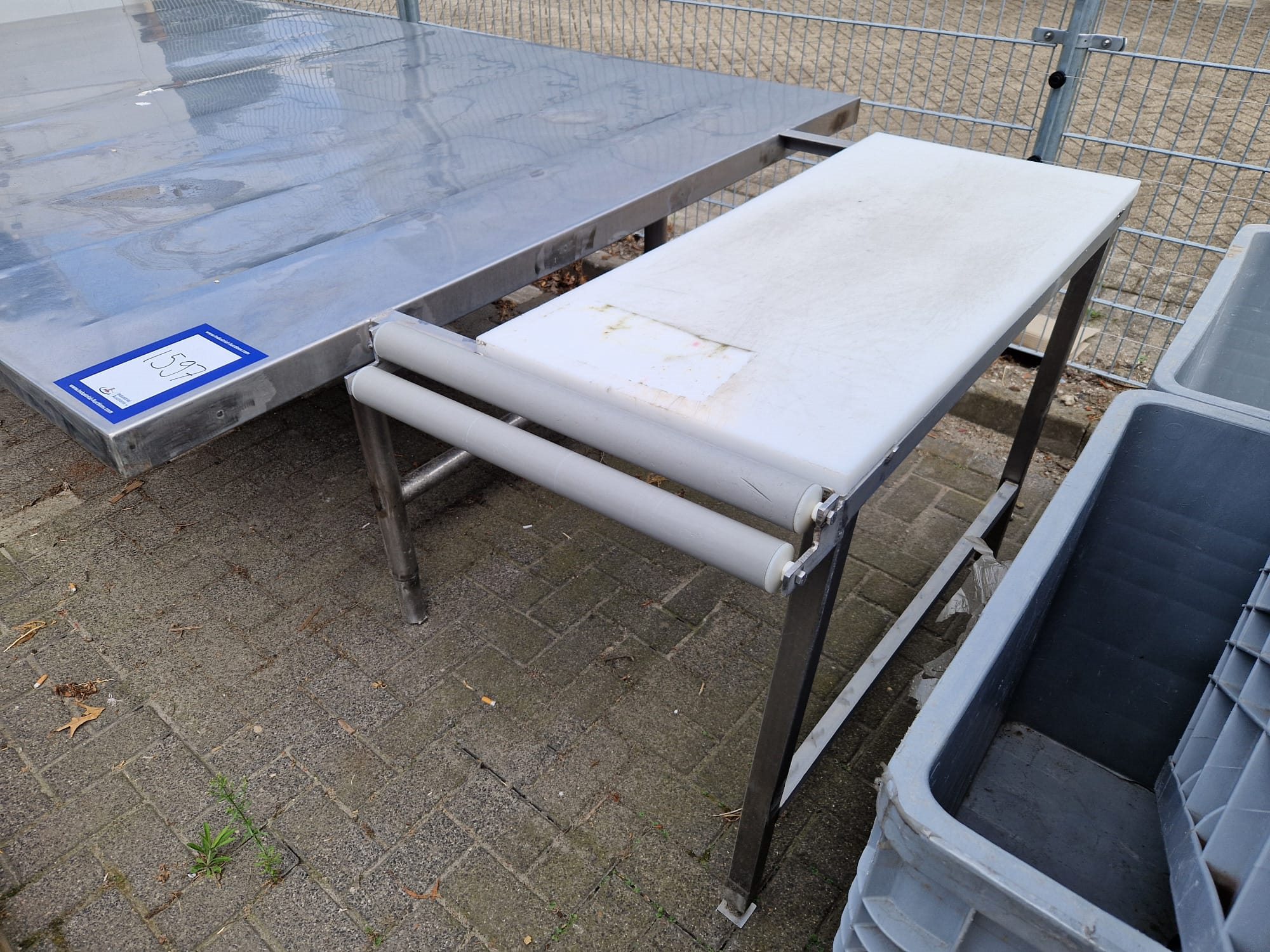 S/s table with plastic cutting board, dimensions: 3550 mm x 1850 mm x 850 mm.