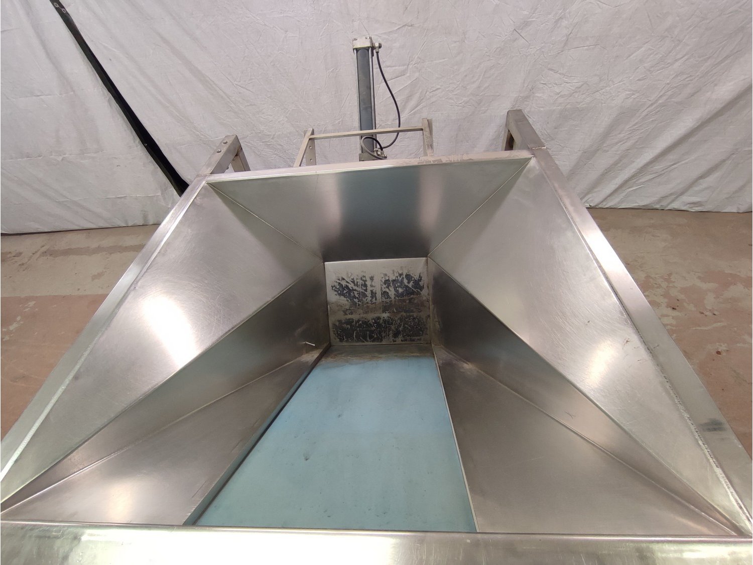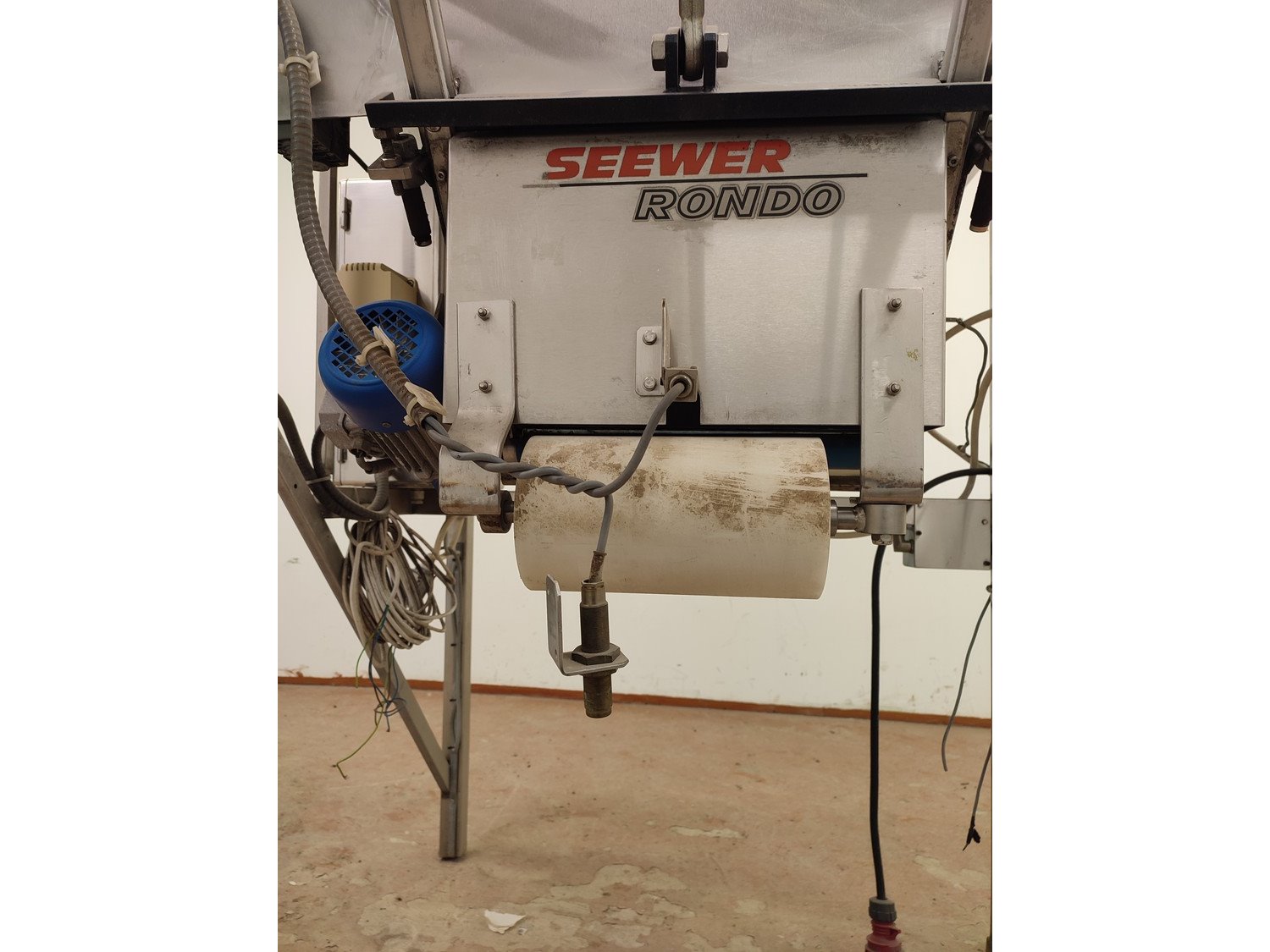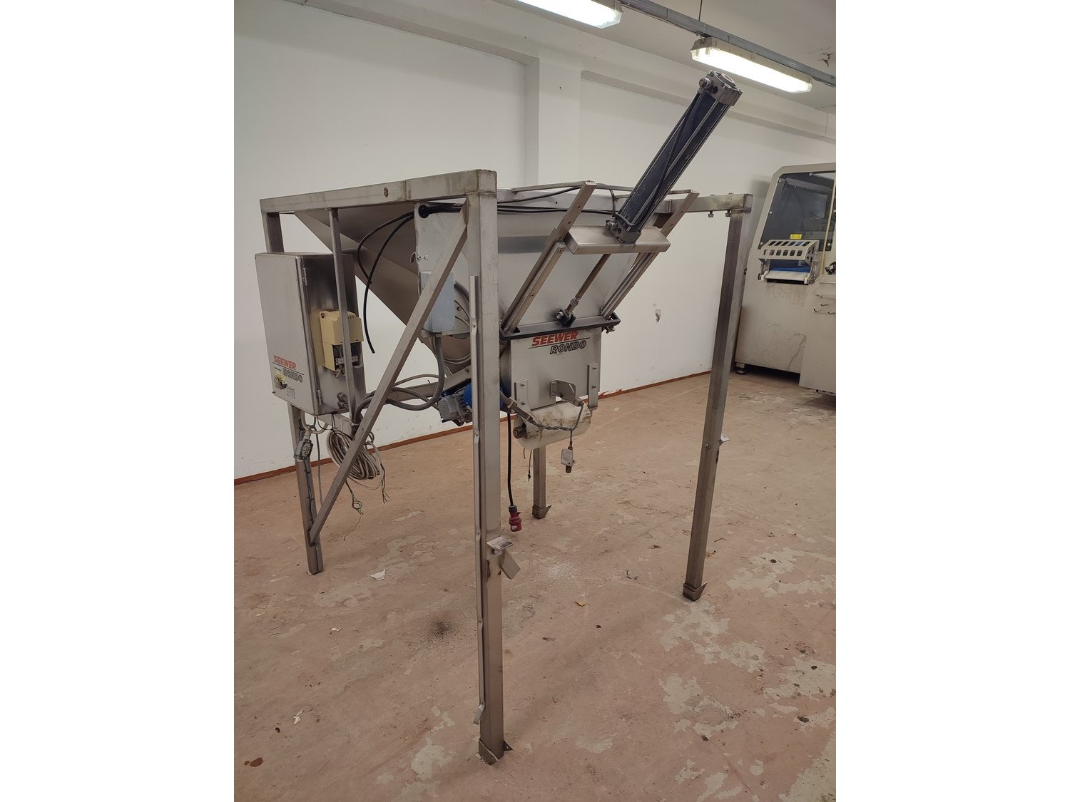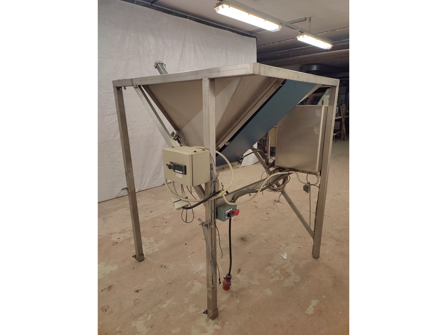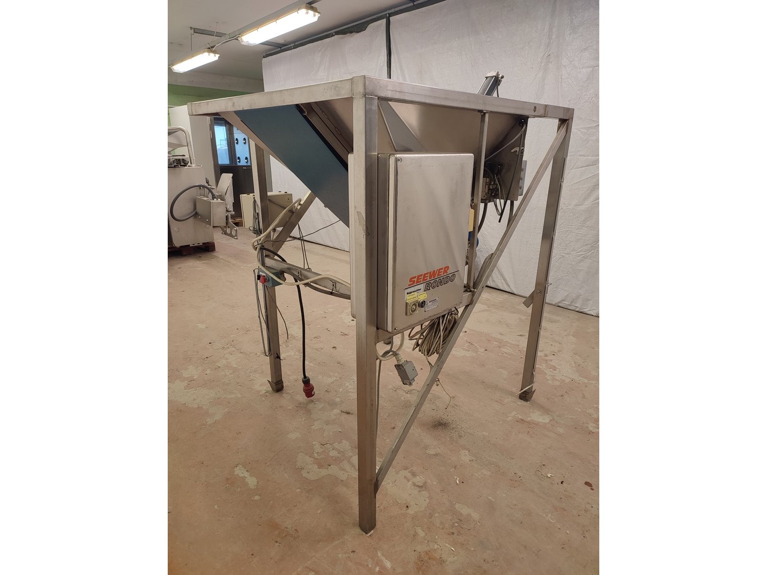 Seewer Rondo hopper with transport belt, model: HWTS, machine number: A72222018, belt width: 415 mm, dimensions: 1400 mm x 1600 mm x 1840 mm.